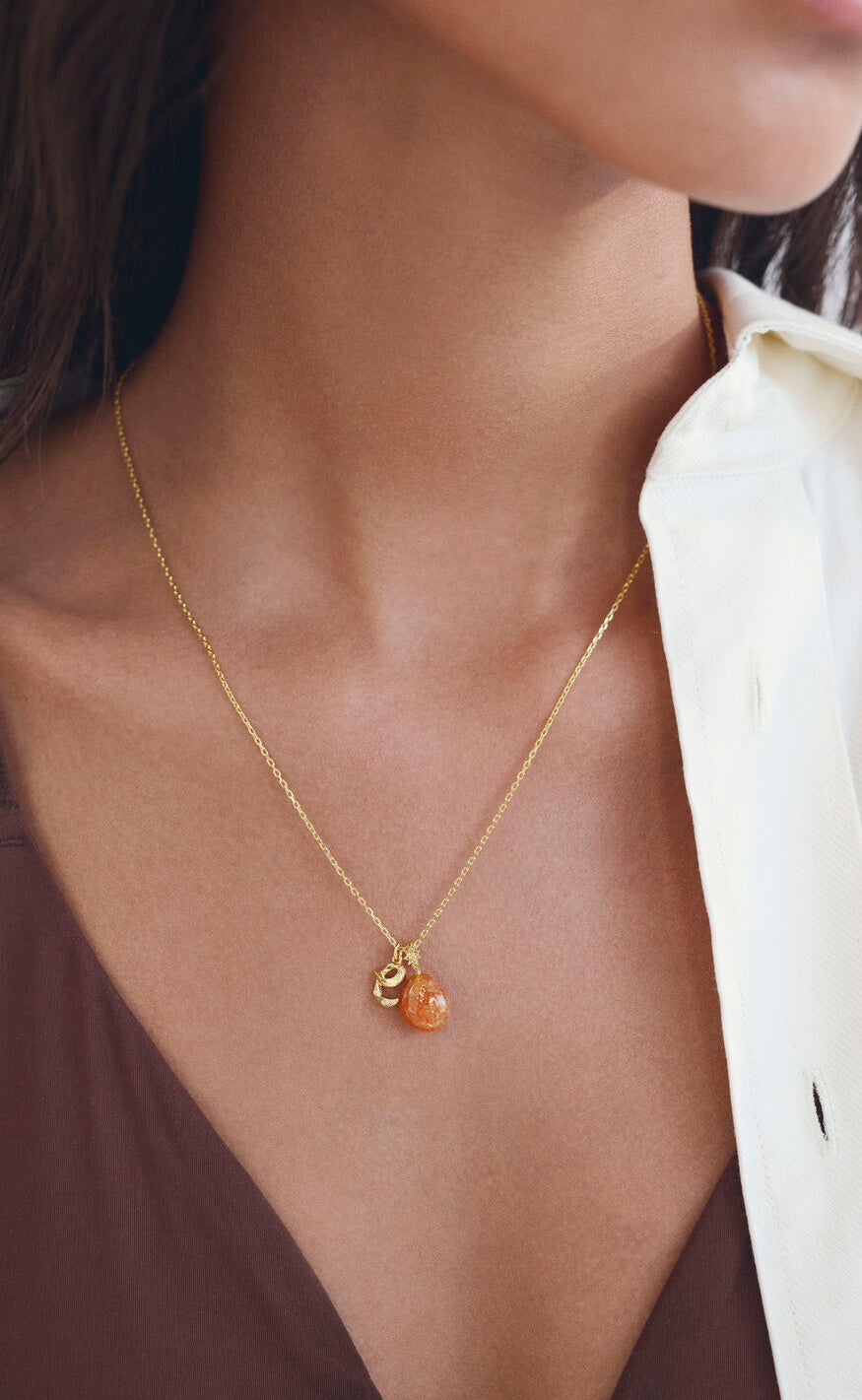 Stenen har en organisk, dråbeformet silhuet og er monteret med en lille forgyldt sol-detalje, der tilfører et strålende og livligt udtryk.