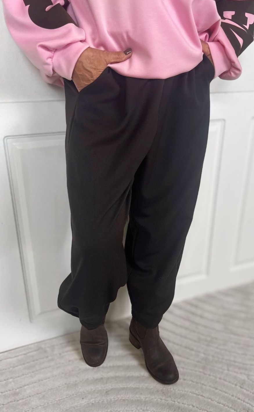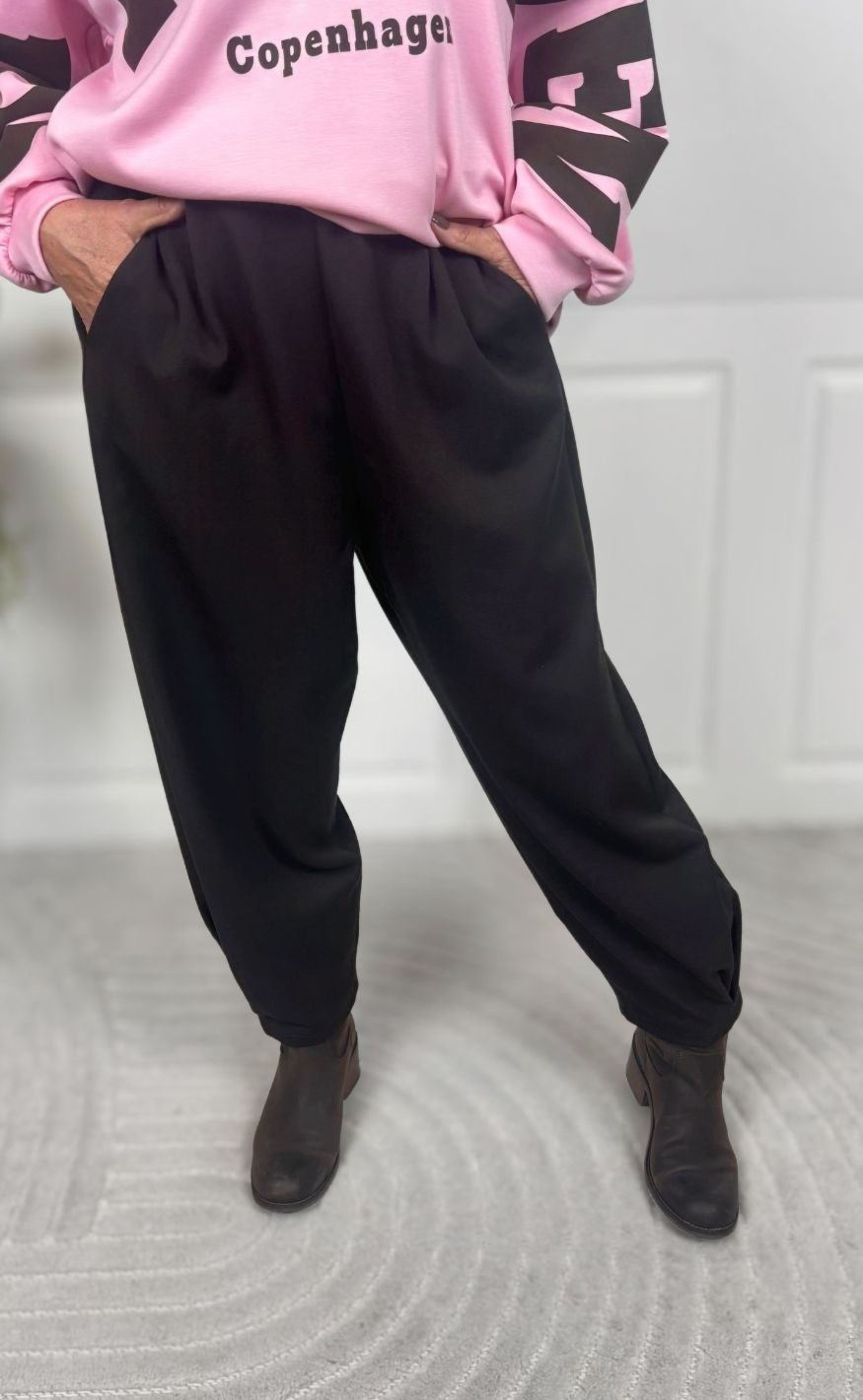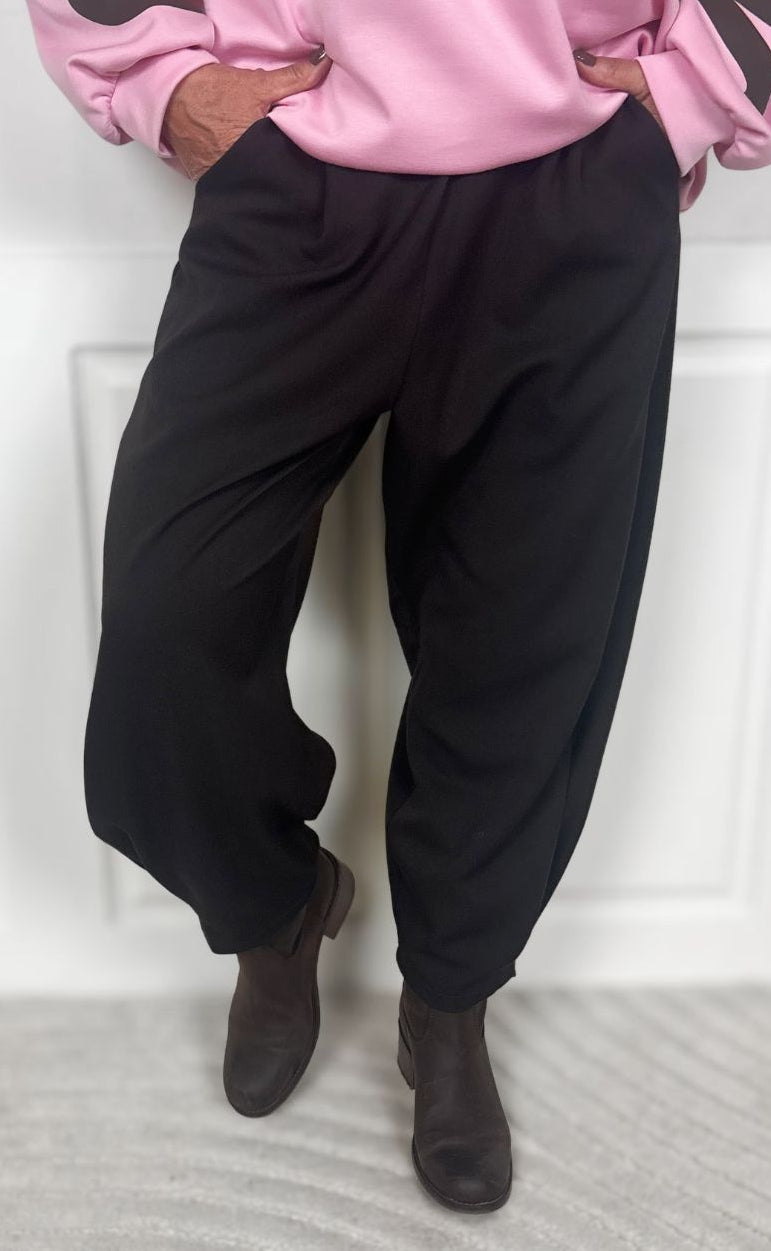 Bukserne har elastik i taljen for god komfort og en afslappet pasform med let ballonform ved benene, som giver et moderne og casual look. Perfekte til både hverdagsbrug og afslappede outfits.