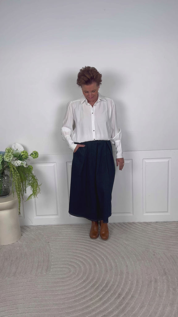 Skjorten har spids krave, lange ærmer med brede manchetter og knaplukning foran. Den har en løs og flatterende pasform, der gør den perfekt til både business og casual styling.