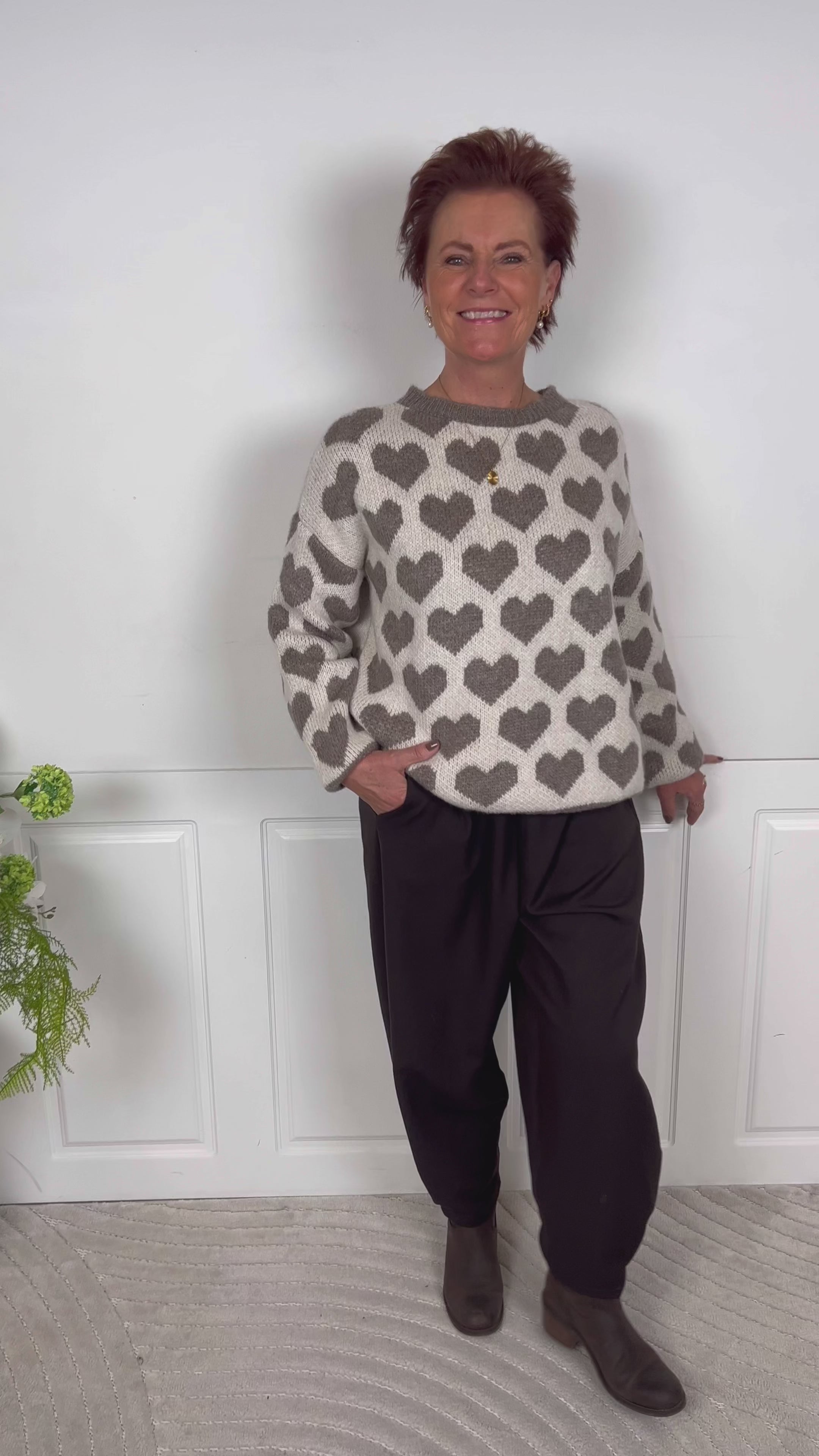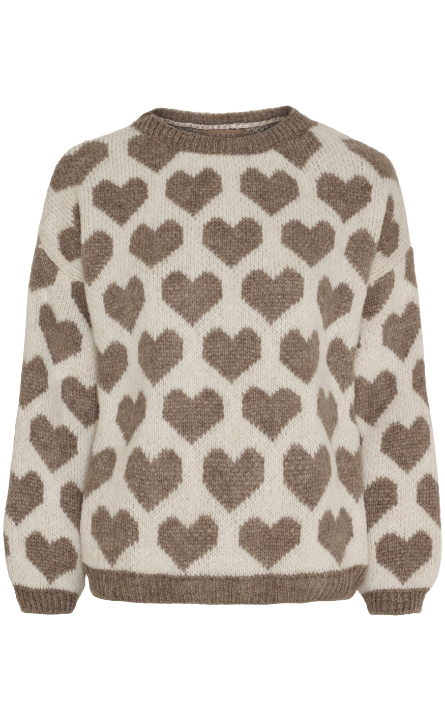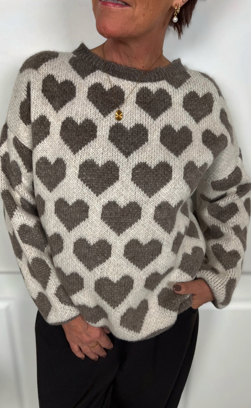 Blød striktrøje fra Marta Du Chateau i beige med brune hjerter over hele designet.