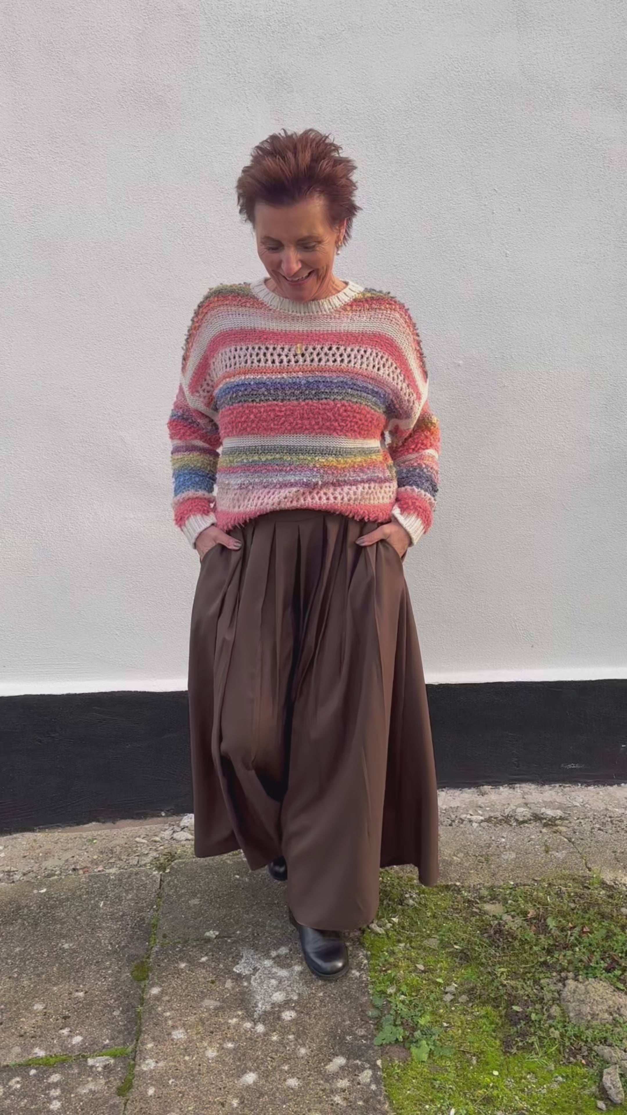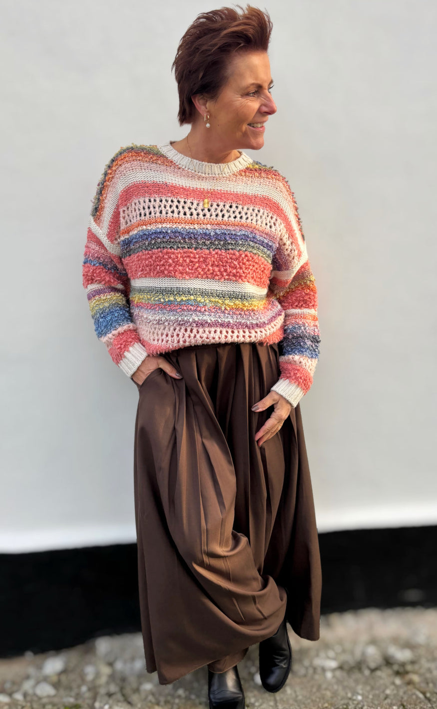 Strikken har en løs pasform og rund hals, samt en kombination af forskellige strikketeknikker, der giver et spændende og struktureret udtryk. Perfekt til at tilføje farve og personlighed til din garderobe.