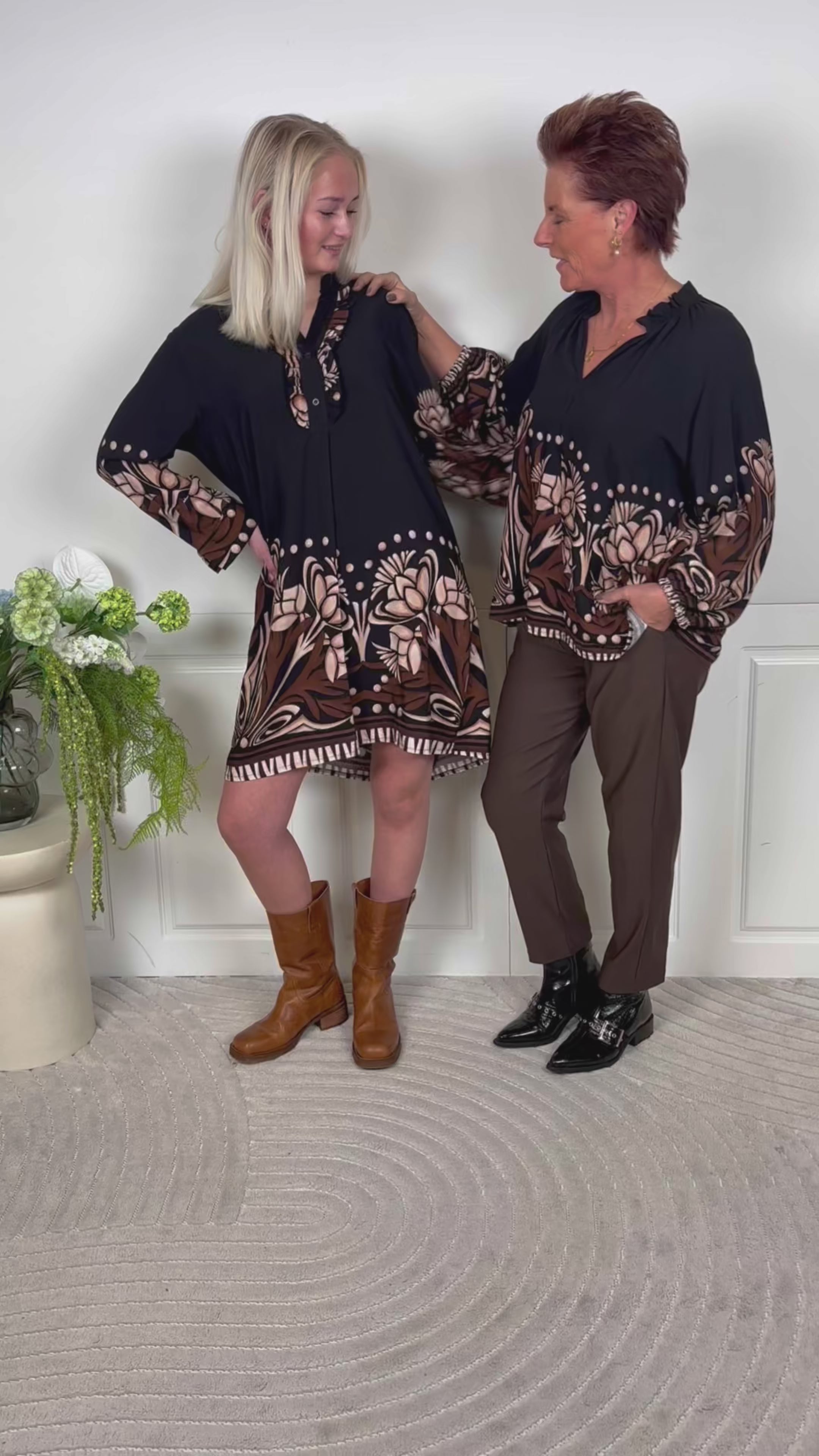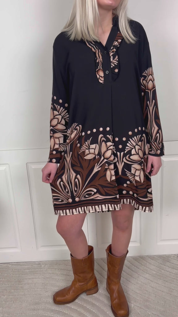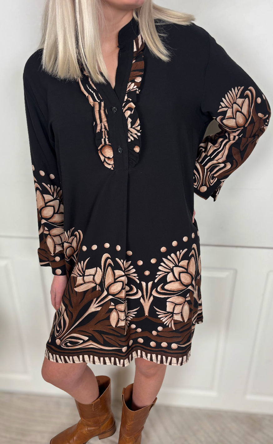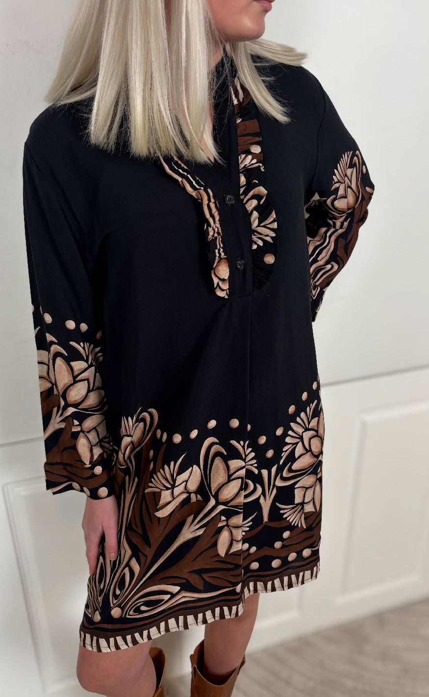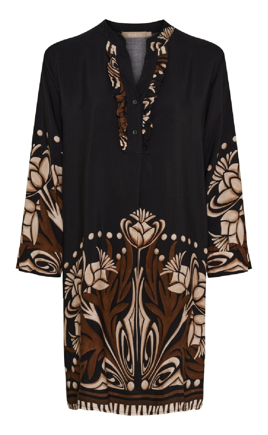 Sort tunika fra Marta Du Chateau med et smukt blomsterprint i brune og beige nuancer langs kanten og ærmerne. Tunikaen har en dekorativ flæsekant ved halsudskæringen og en kort knaplukning foran, som giver et feminint og elegant udtryk.