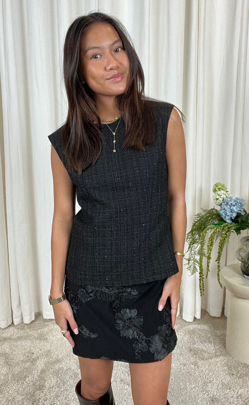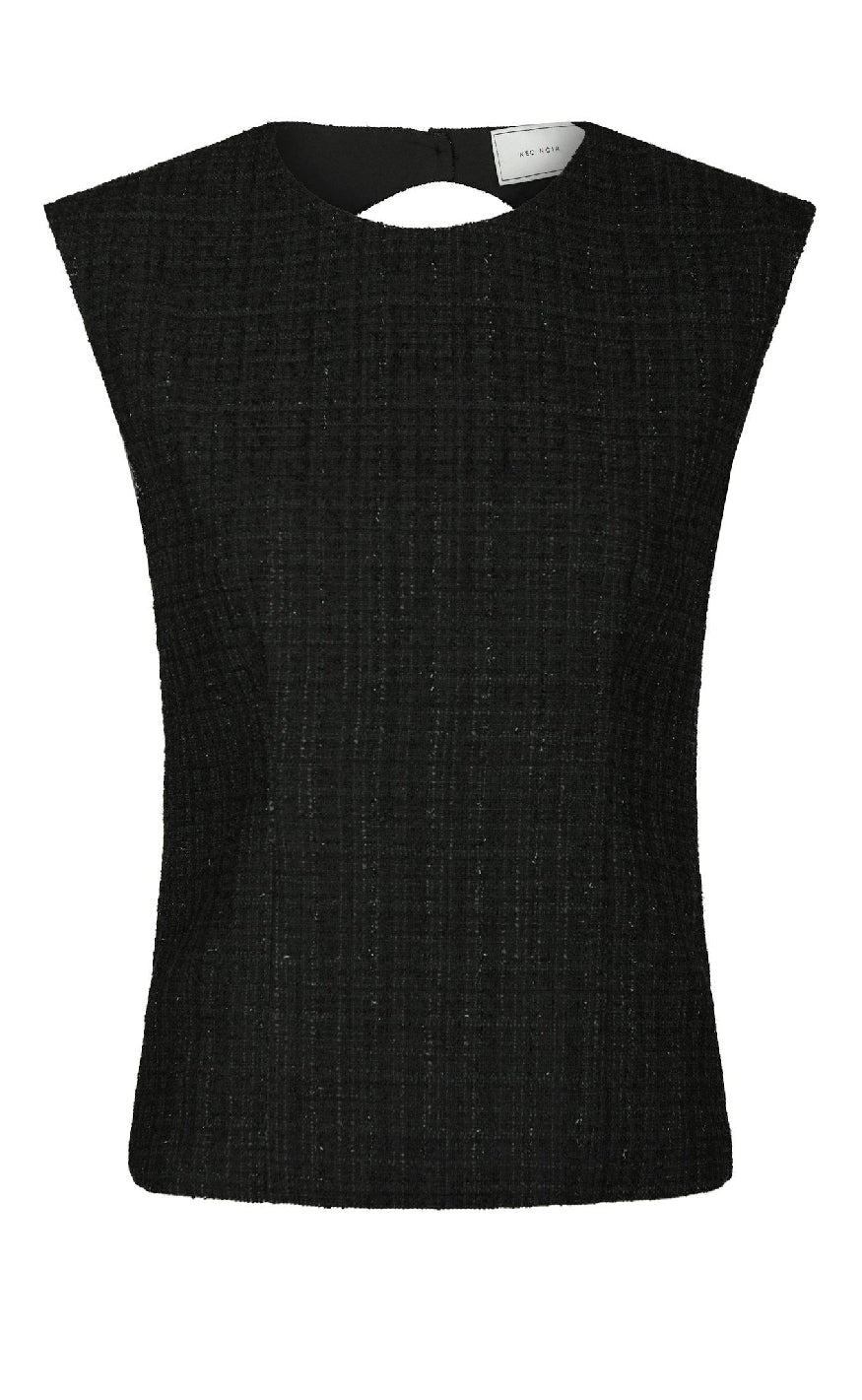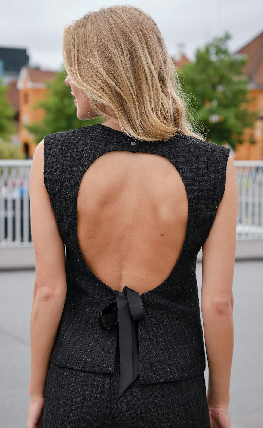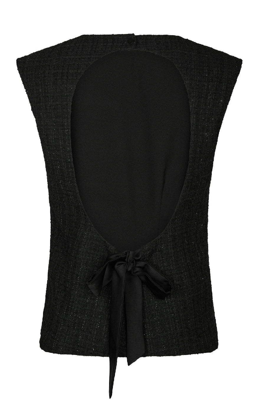 Cool top i bouclkvalitet fra Neo Noir i sort. Toppen har åben ryg, lukkes i halsen og bindes forneden i ryggen