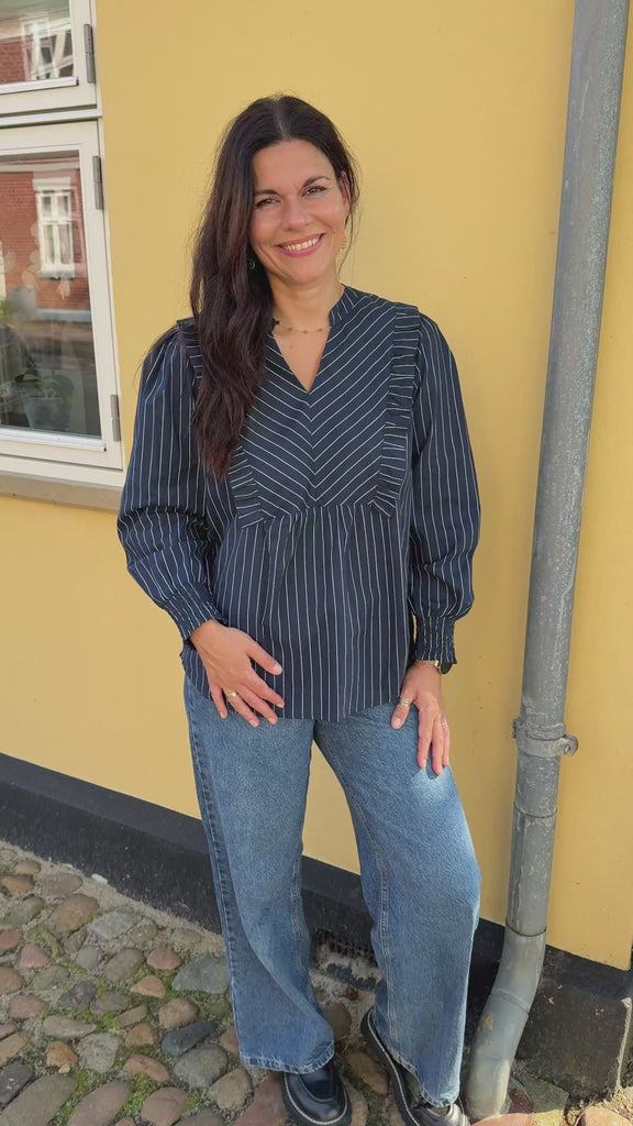 Smuk bluse fra Say INA Copenhagen i navy blå med striber.
