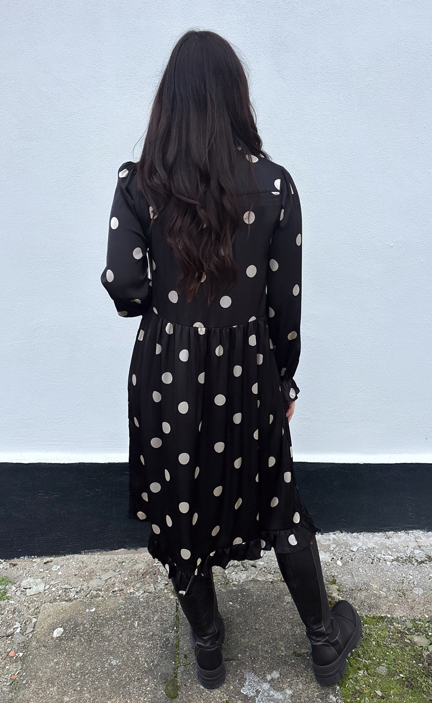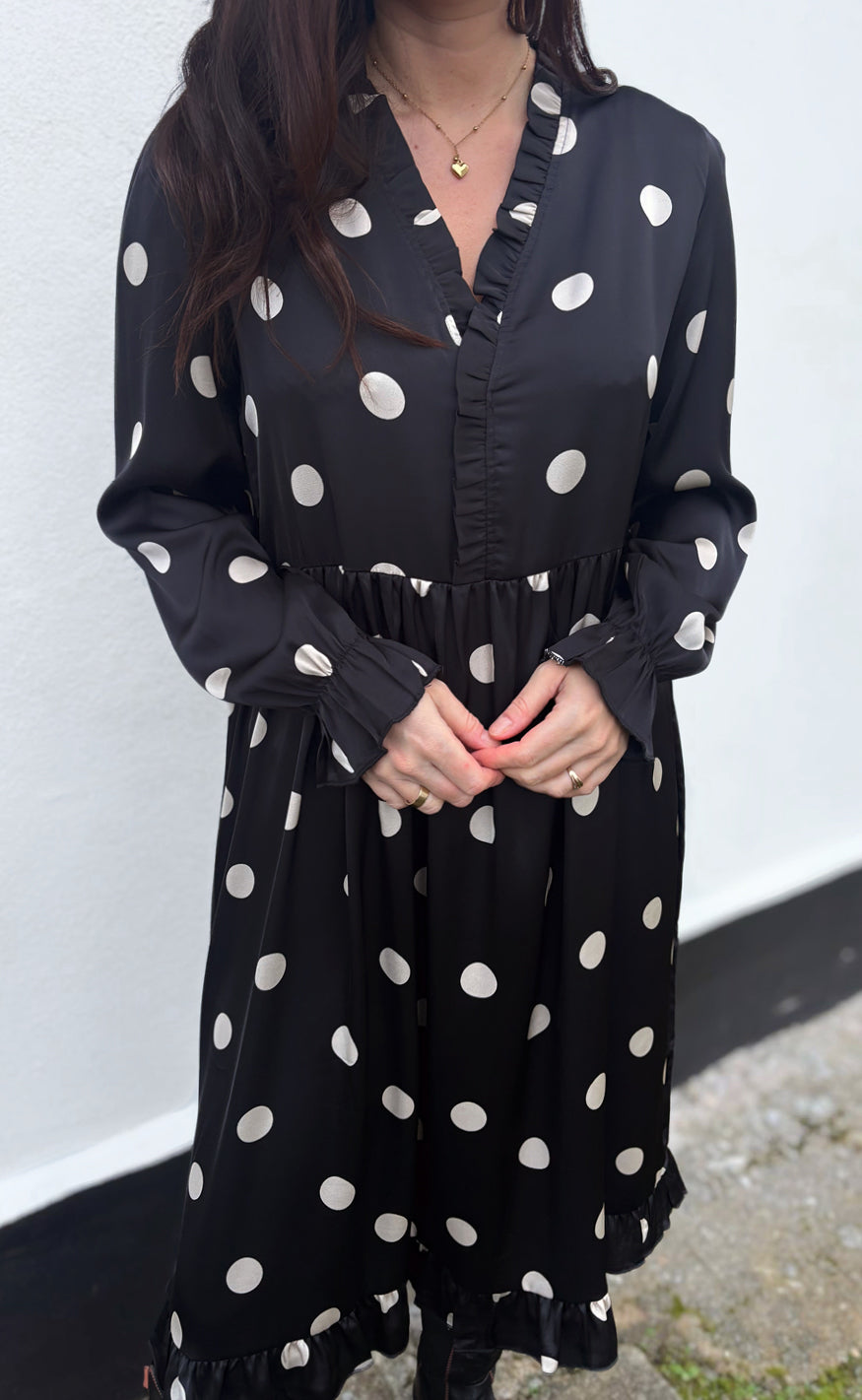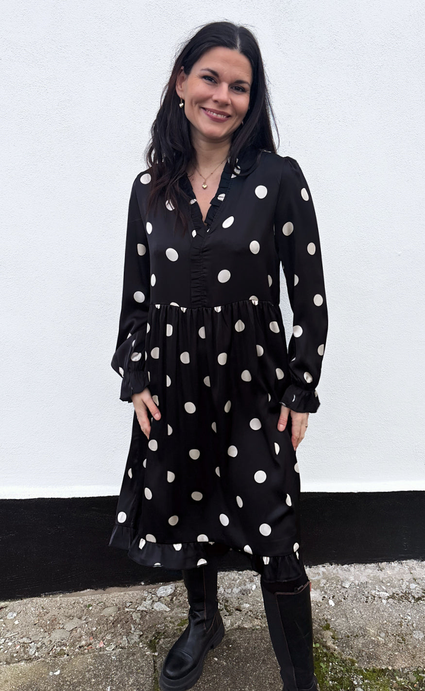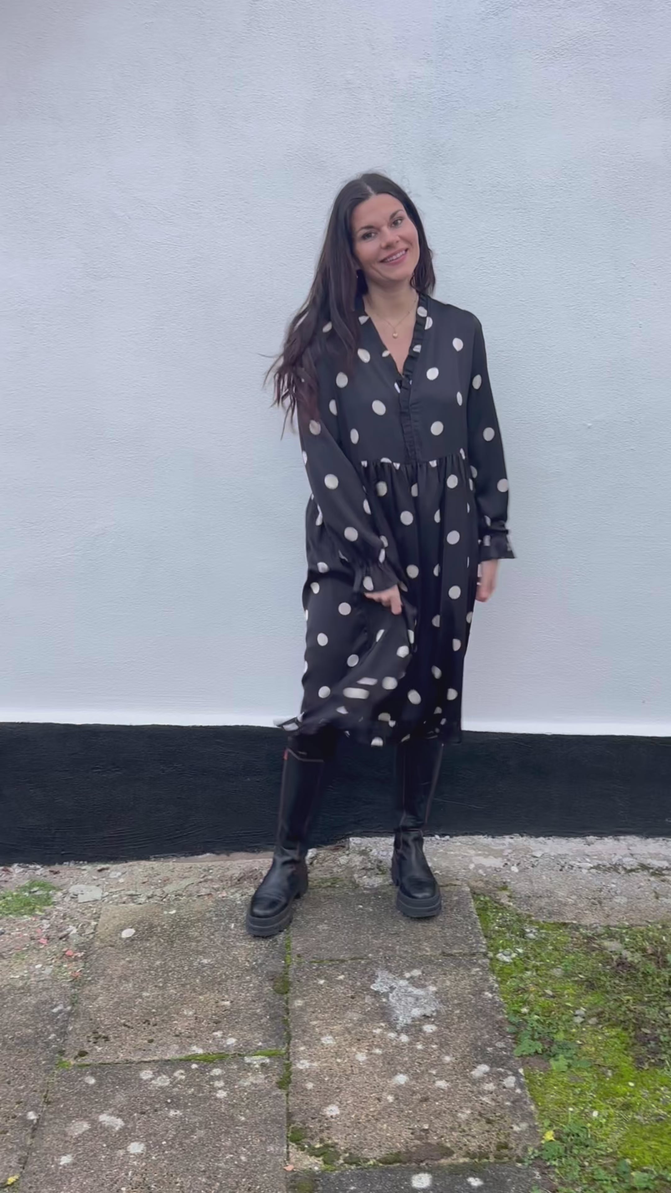 Smuk kjole fra INA Copenhagen i sort med store creme prikker.