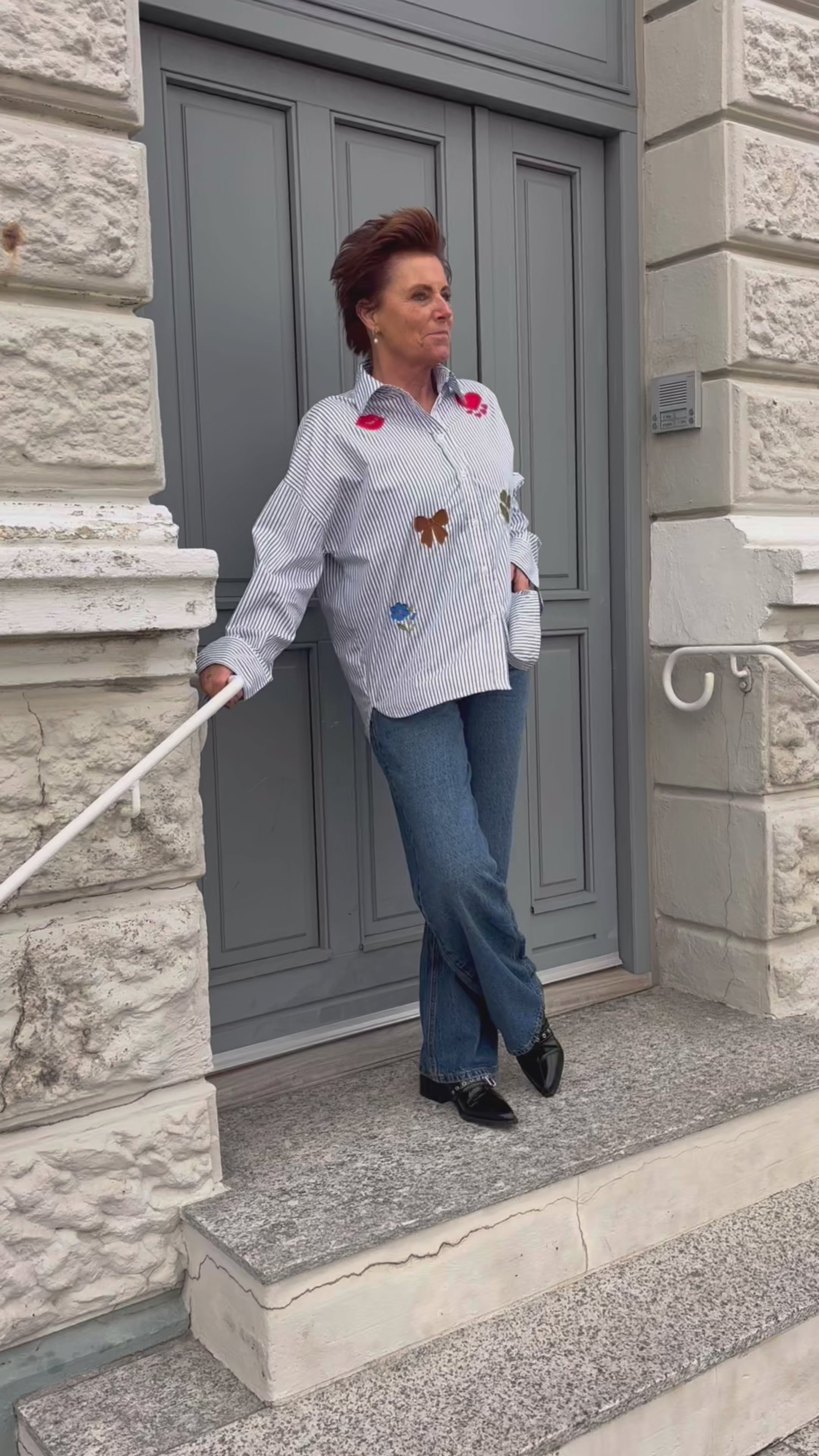 Virkelig smart skjorte fra Say INA Copenhagen i blåstribet med broderi fortil af forskellige motiver.