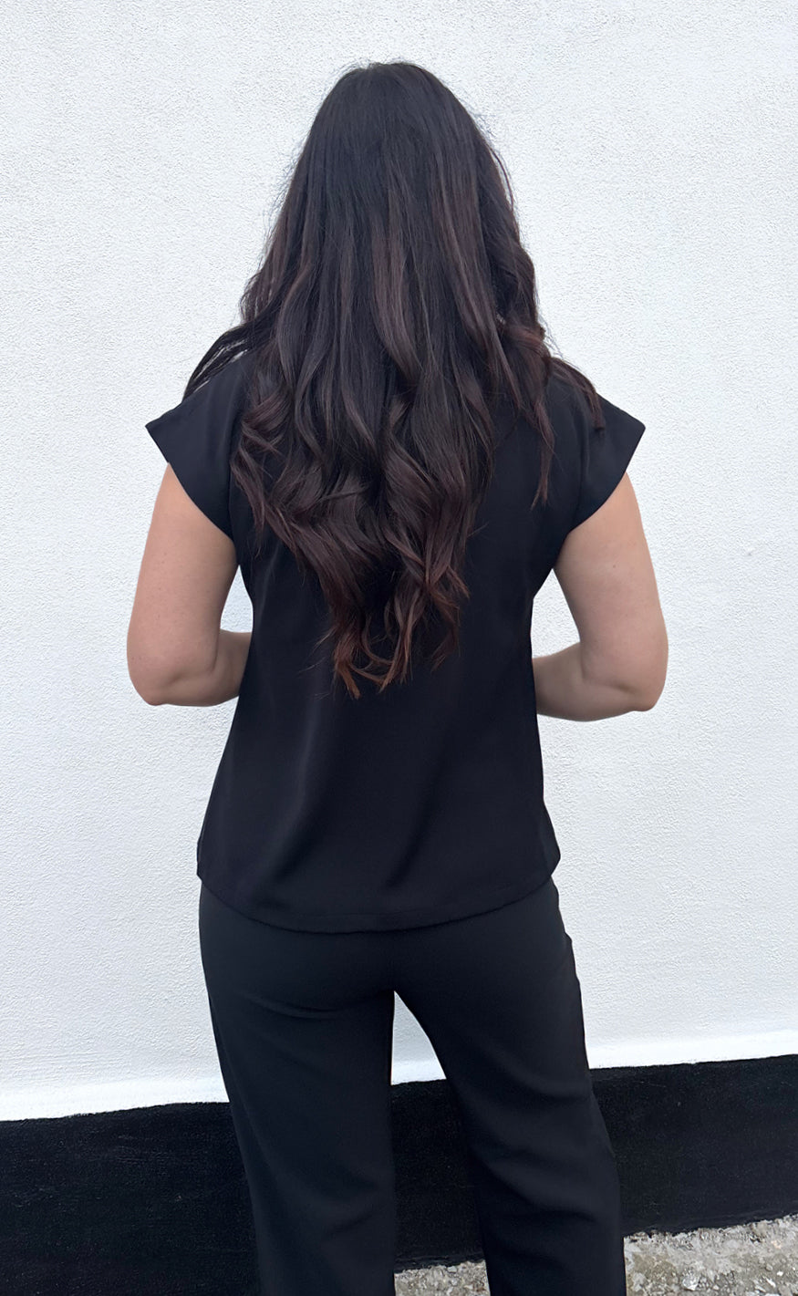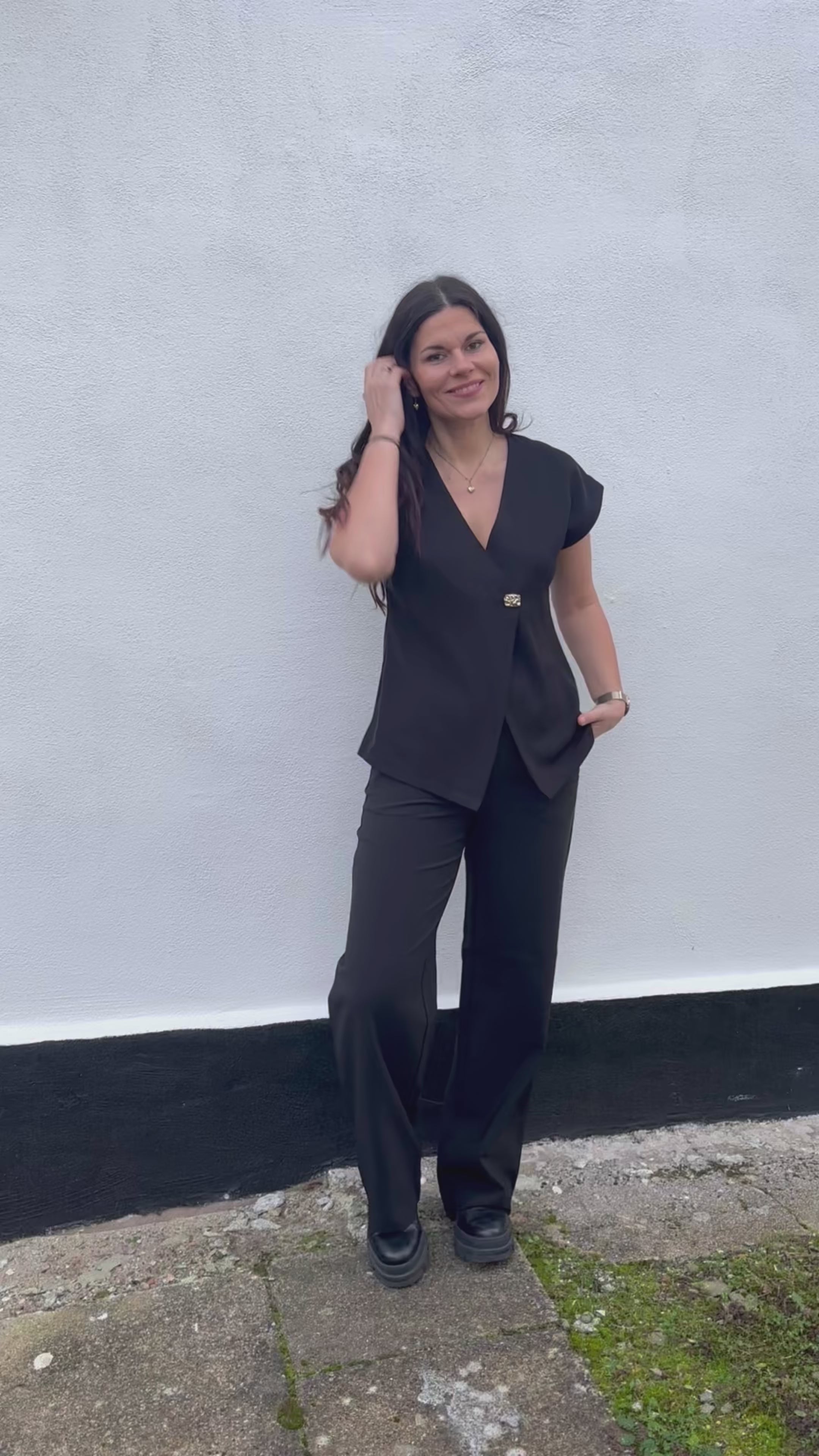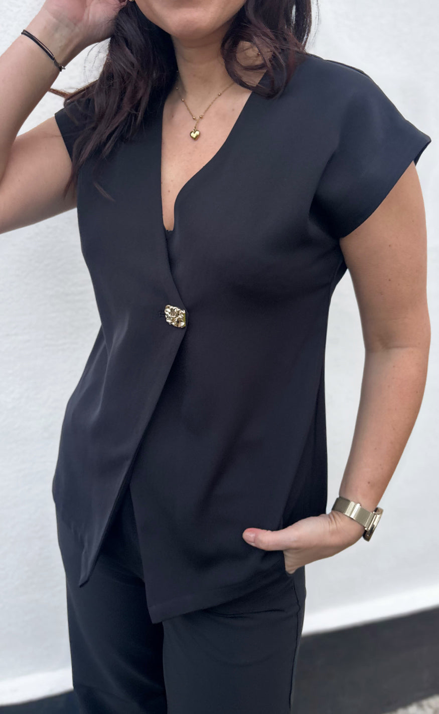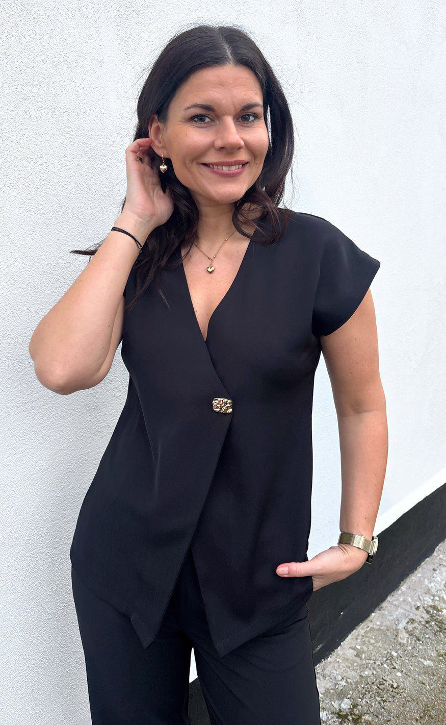 Blusen har en flot V-udskæring, korte ærmer og en fin guldfarvet knap. Materialet er let og falder pænt, så blusen er rar at have på hele dagen. Den kan nemt styles både til arbejde og fritid. Style den f.eks. med bukser, nederdel eller jeans.