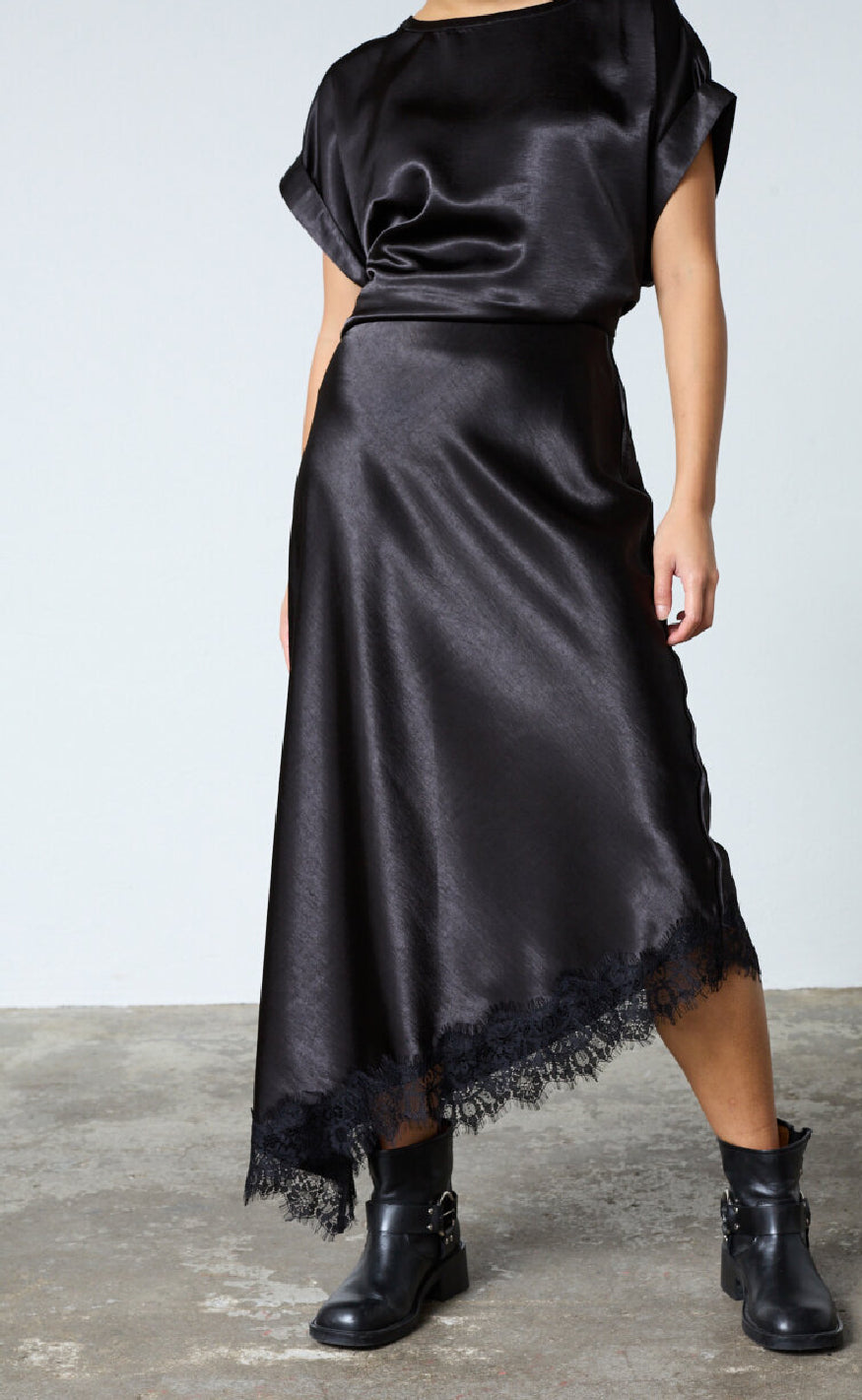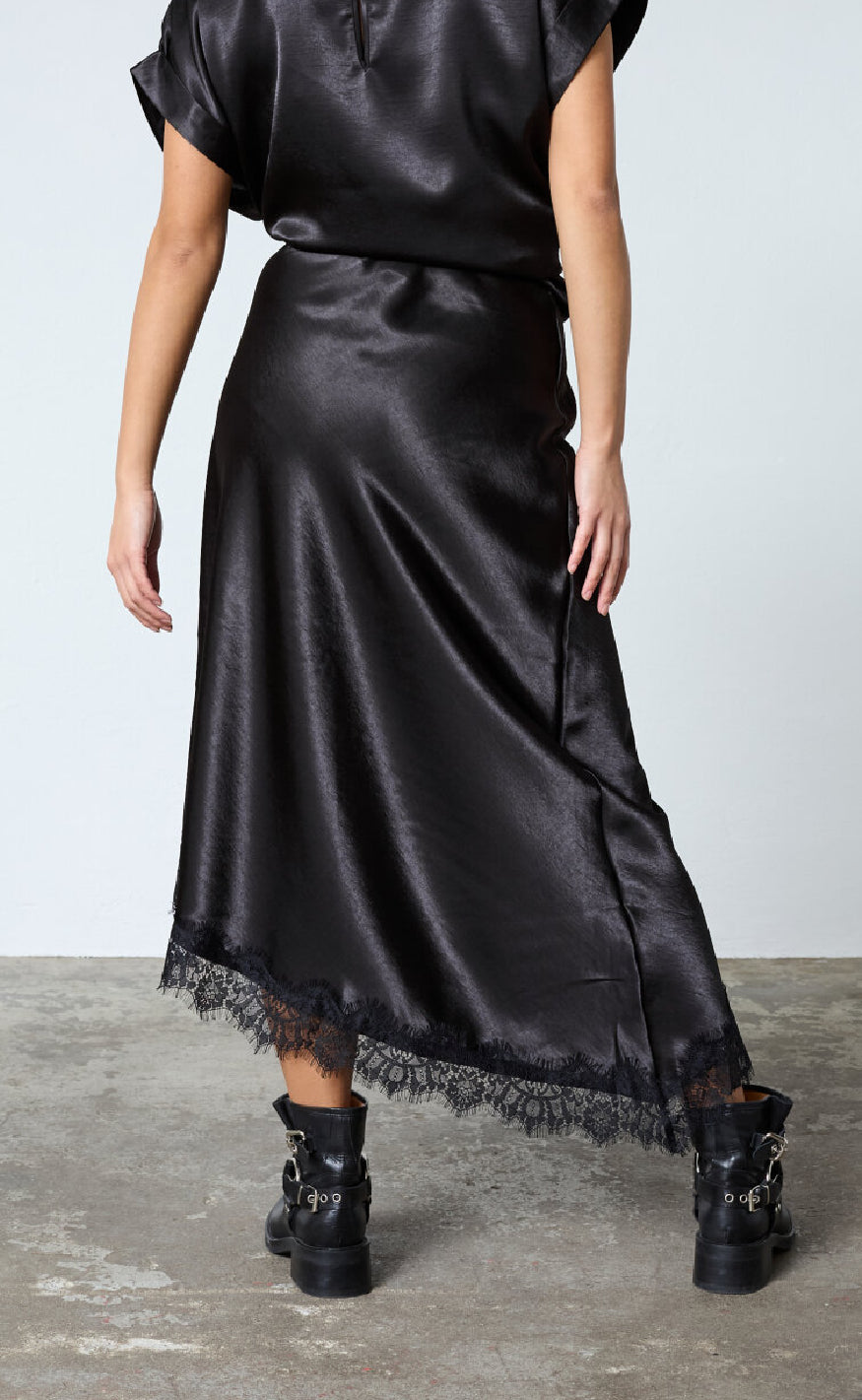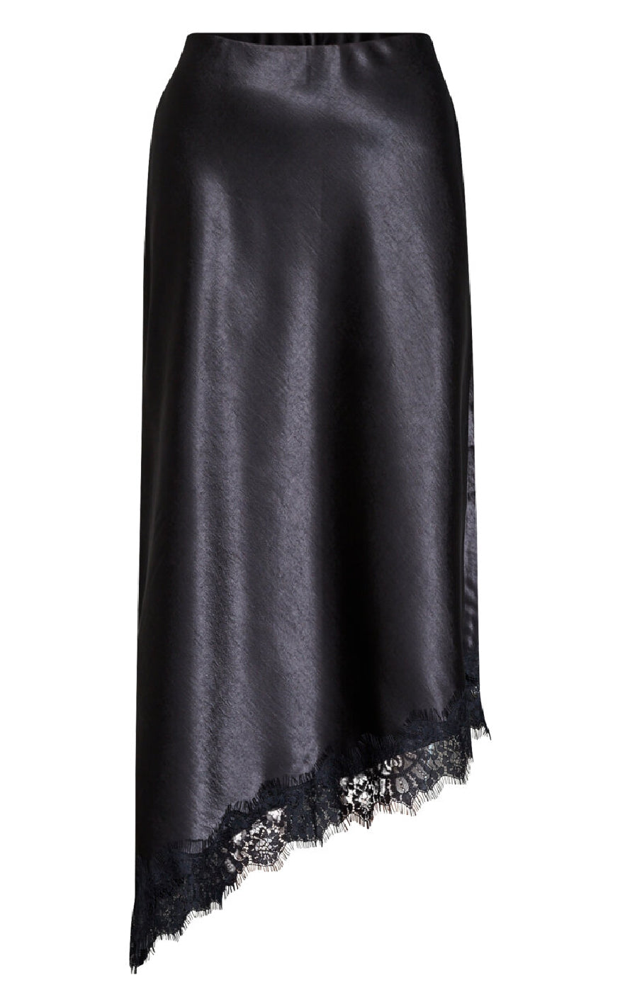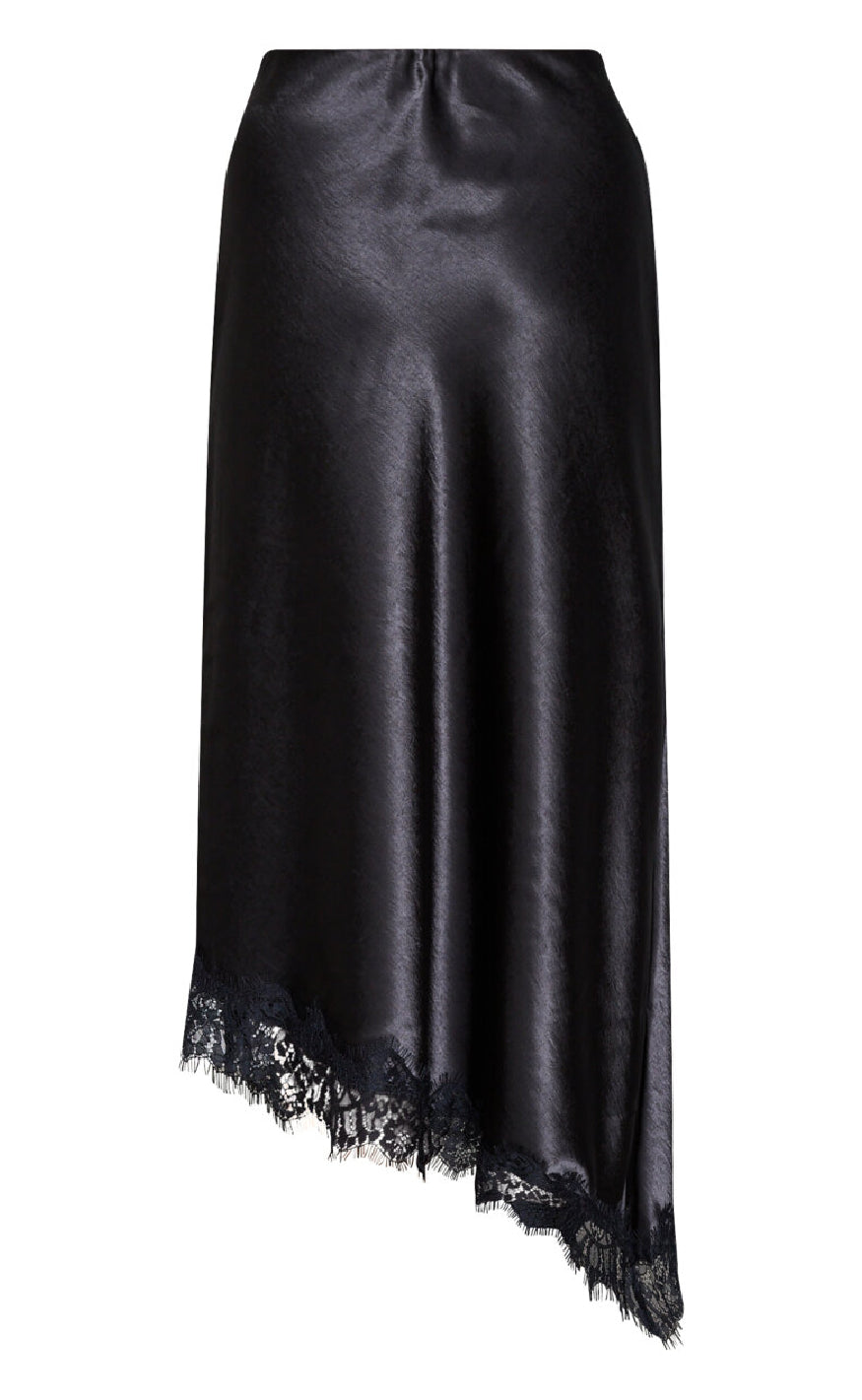 Nederdelen har en asymmetrisk kant afsluttet med sort blonde, der giver et feminint og sofistikeret udtryk.