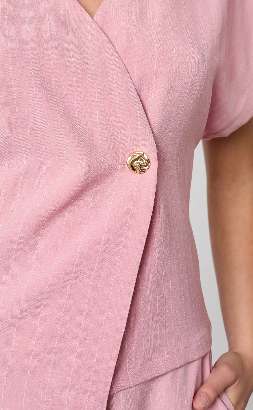 Vesten har en dyb v-udskæring og en asymmetrisk lukning i siden med en enkelt guldknap