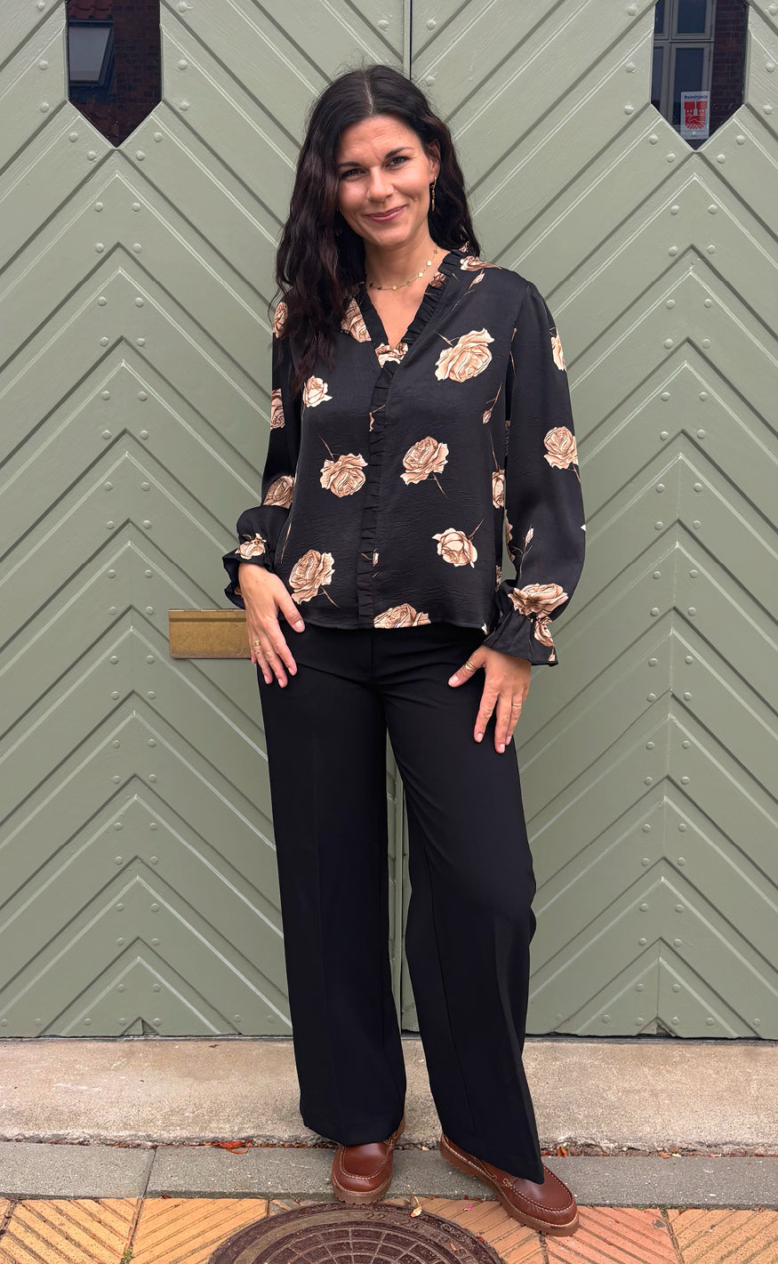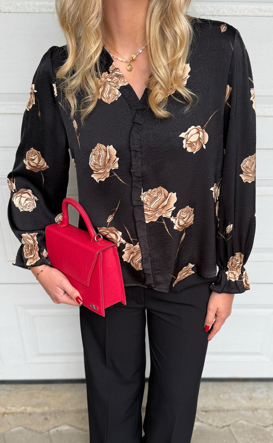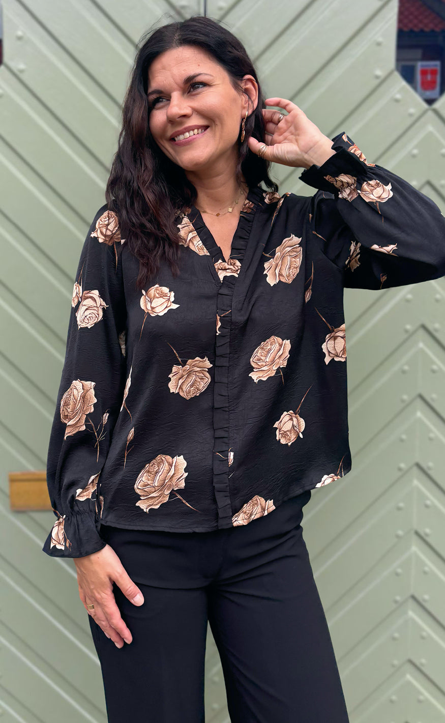 Smuk og elegant bluse fra INA Copenhagen i sort med roser i brune nuancer.