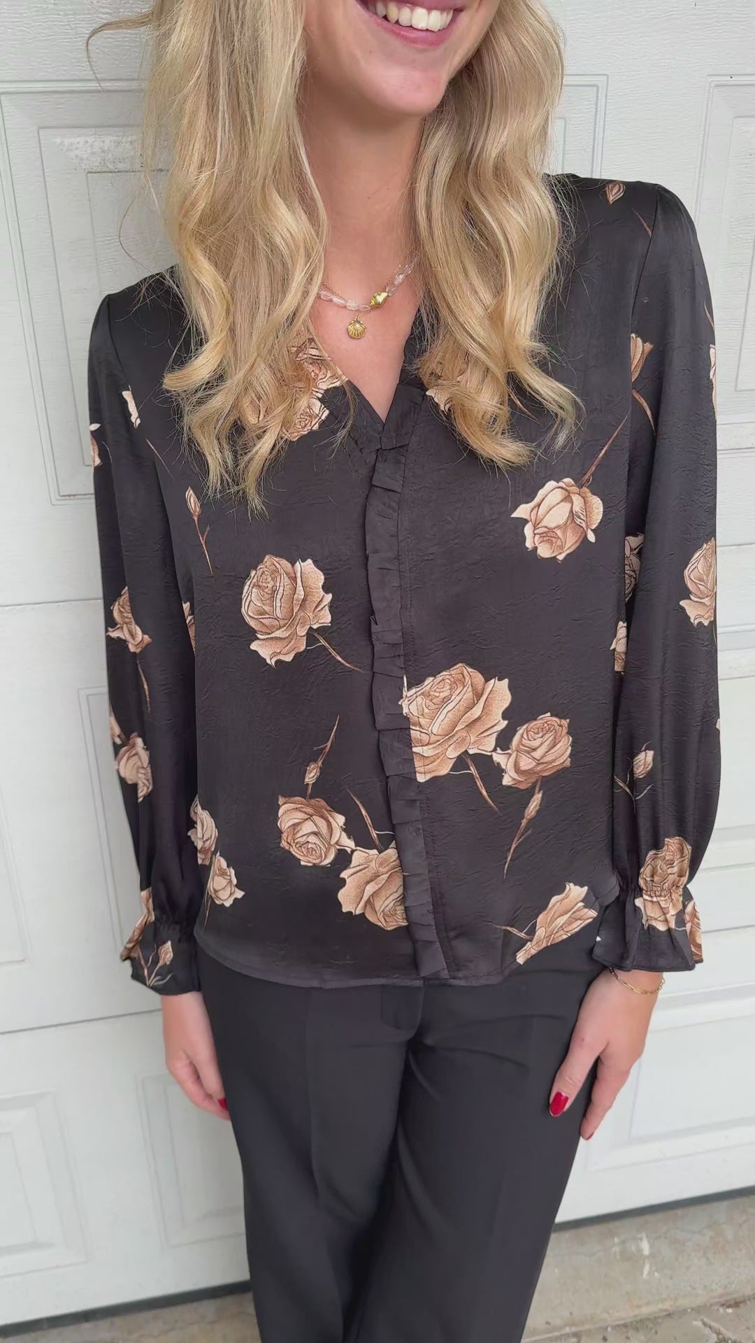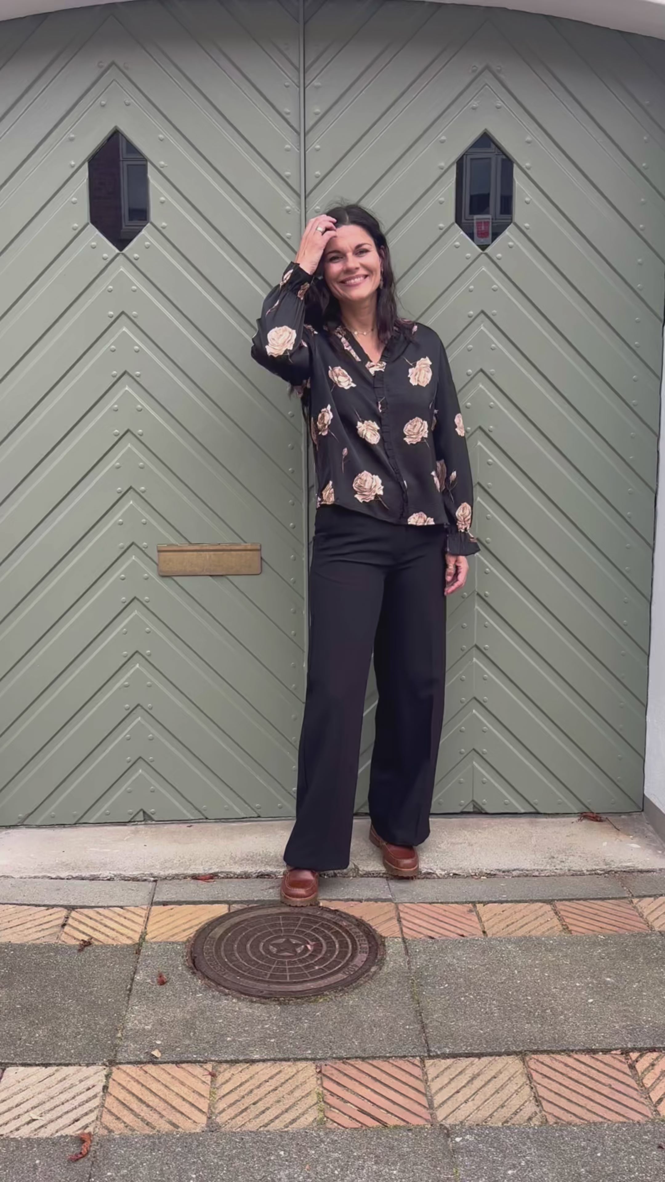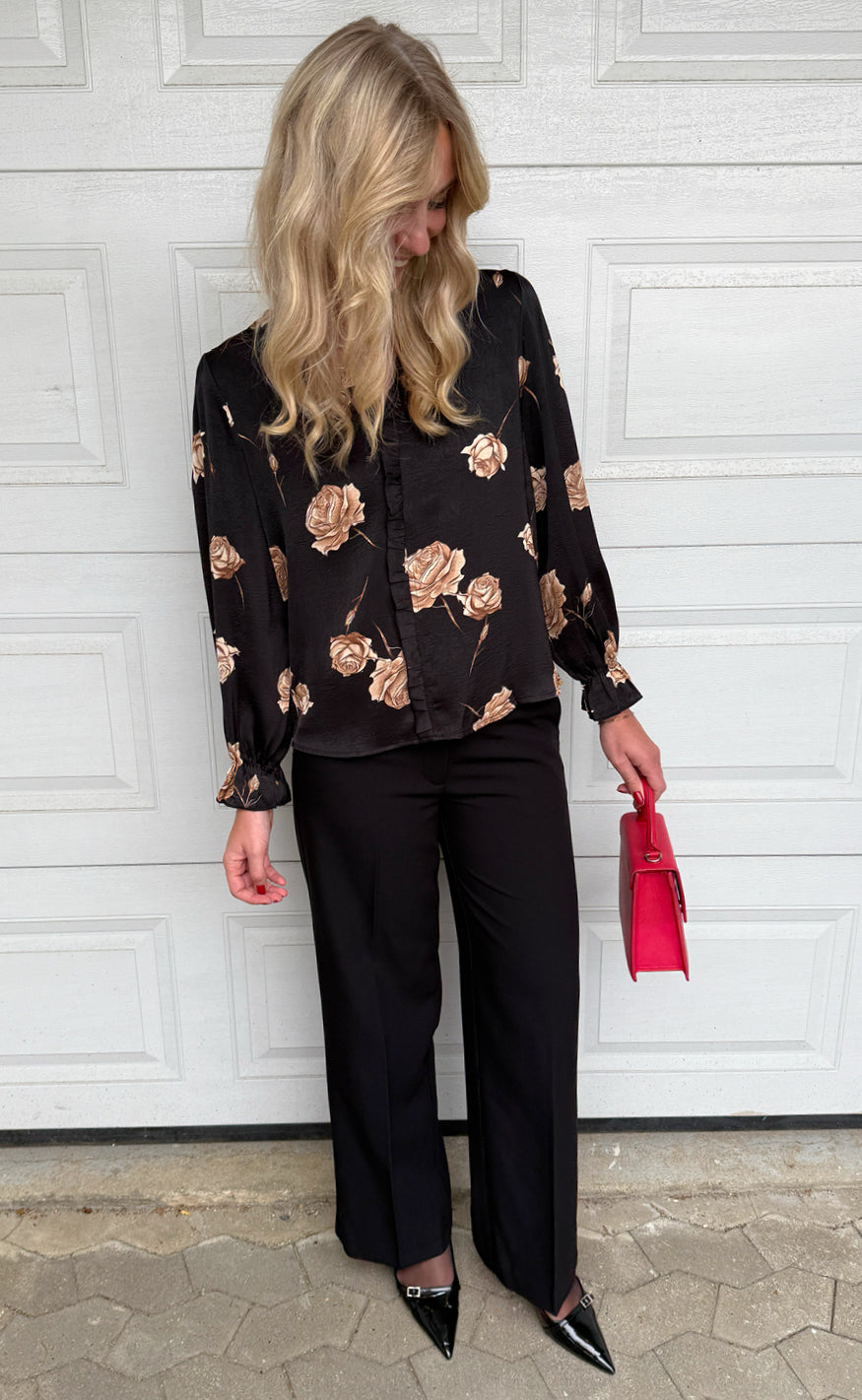 Smuk og elegant bluse fra INA Copenhagen i sort med roser i brune nuancer.