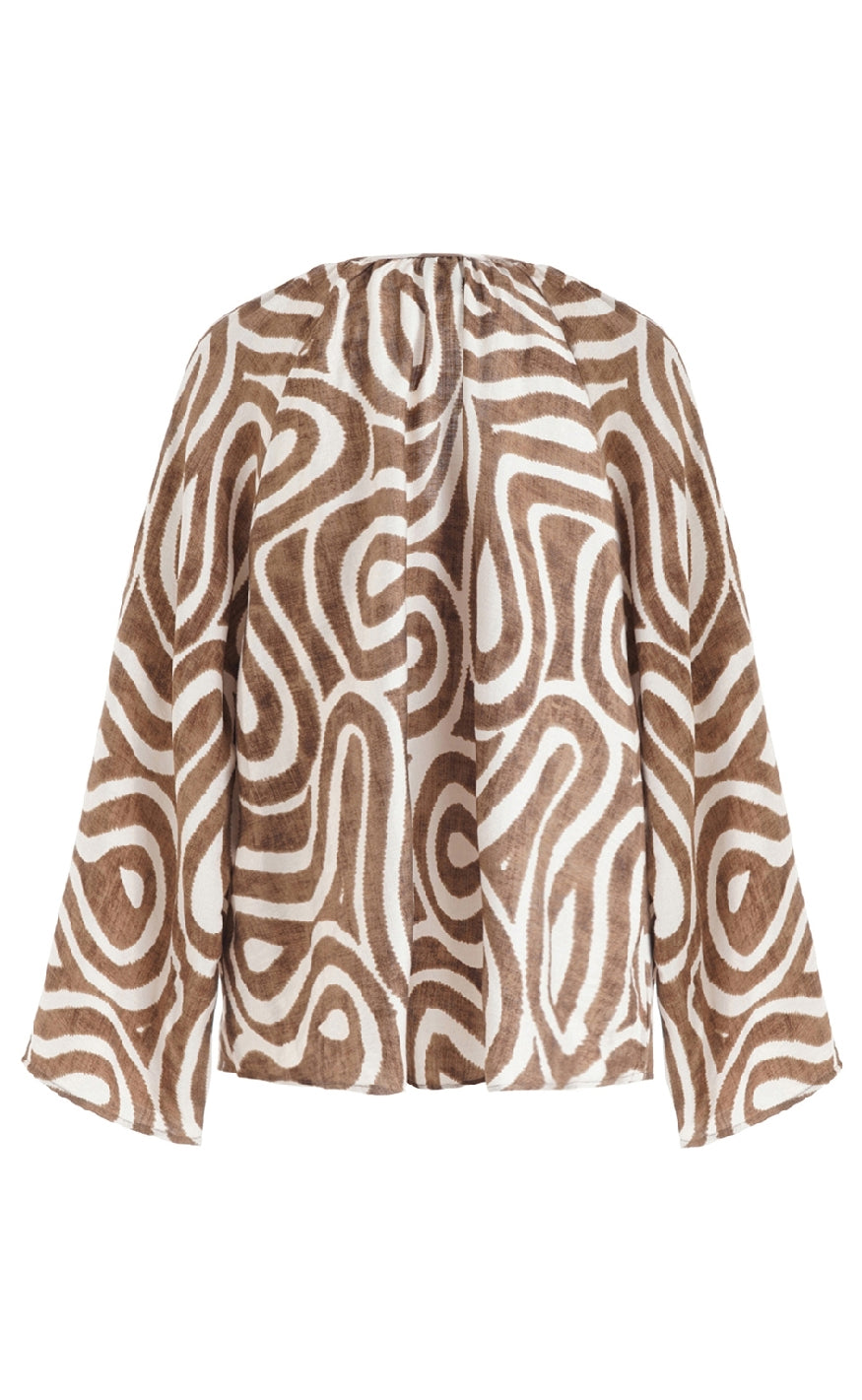 Blusen har lange ærmer og et grafisk print, der giver et moderne og iøjnefaldende look.