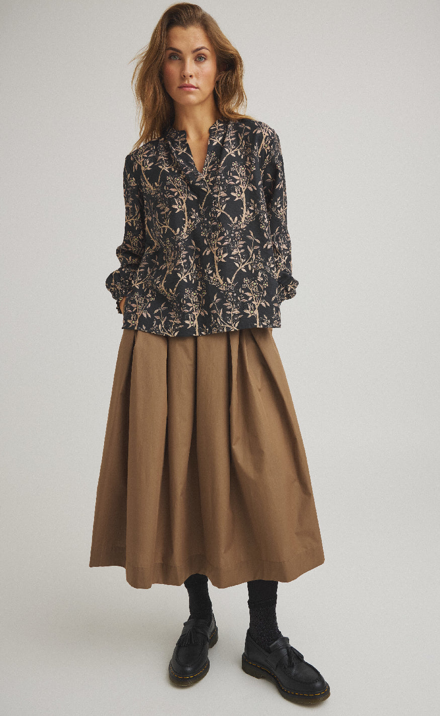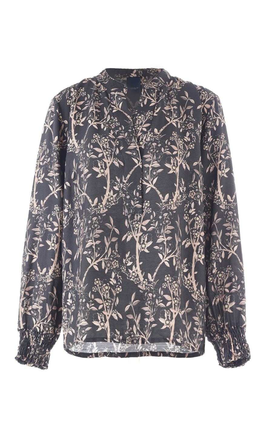 Mønstret skjorte fra Luxzuz i et mørkeblåt design med beige blomsterprint. Skjorten har lange ærmer med smock-detalje ved håndleddet og en kort knaplukning foran.