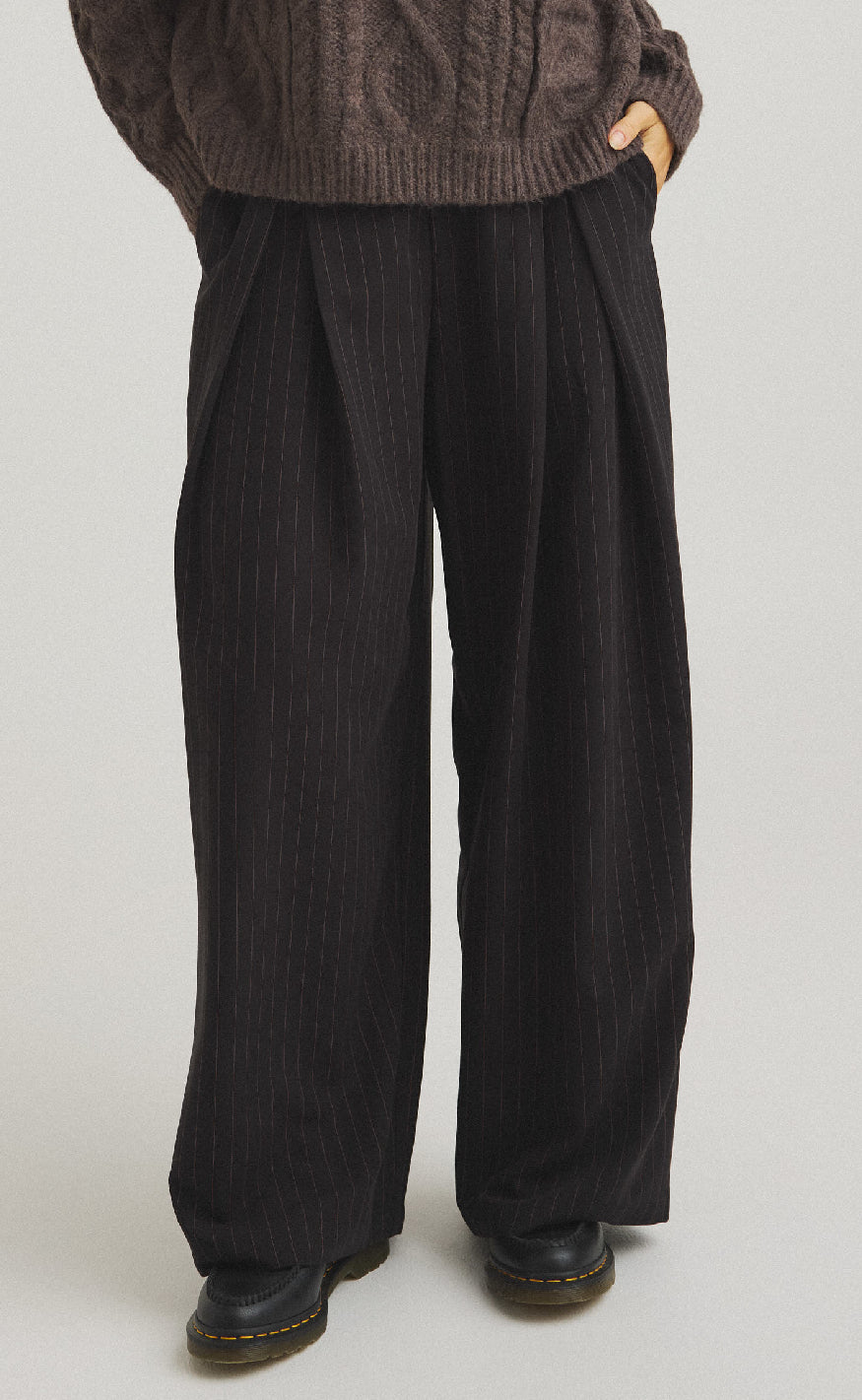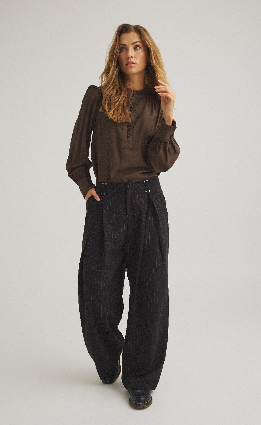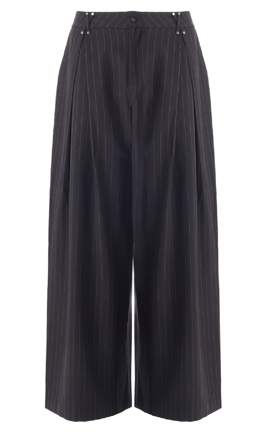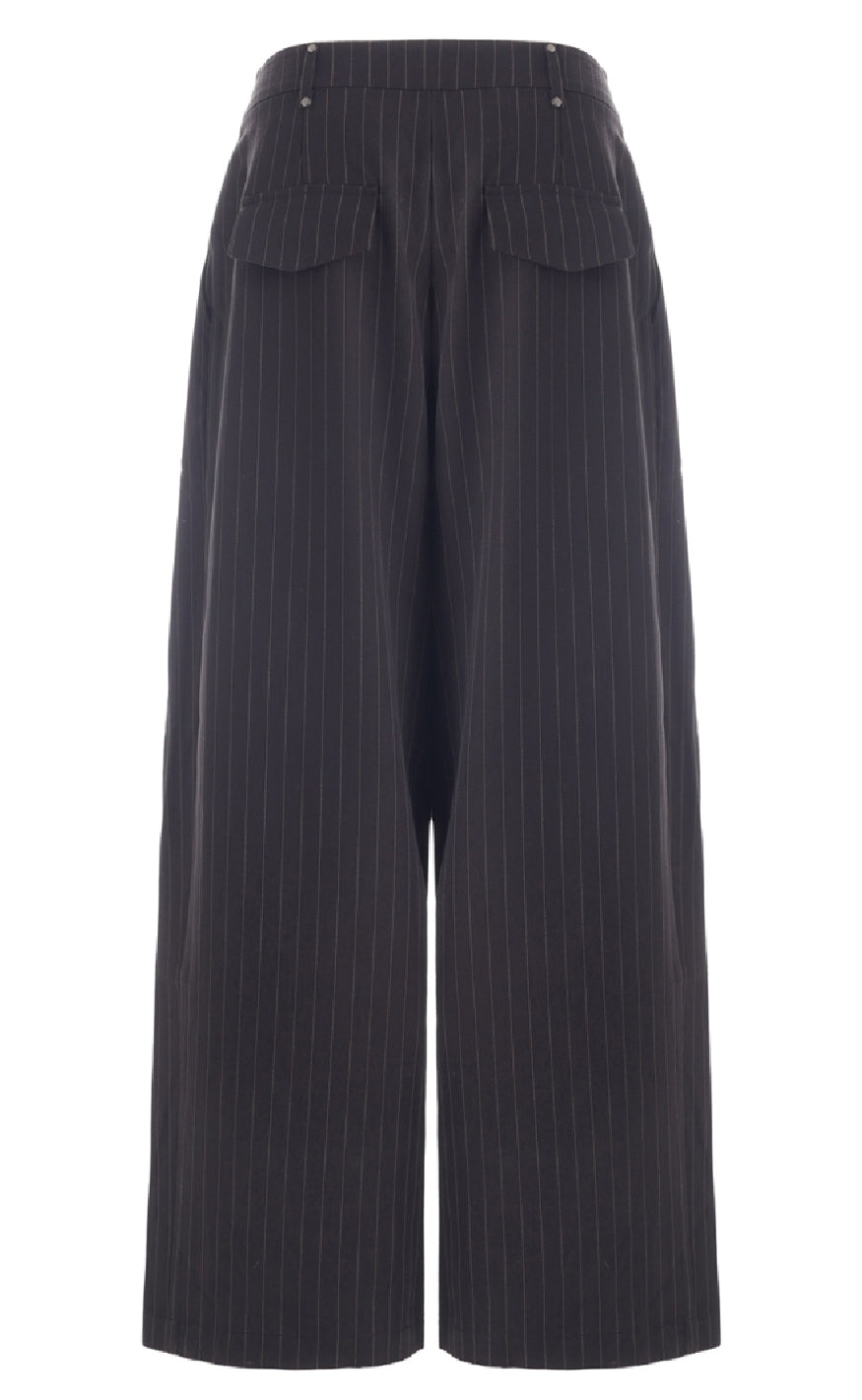 Stribede bukser fra Luxzuz i sort med fine, lodrette nålestriber. Bukserne har en løs pasform med brede ben og klassisk knap- og lynlåslukning foran.