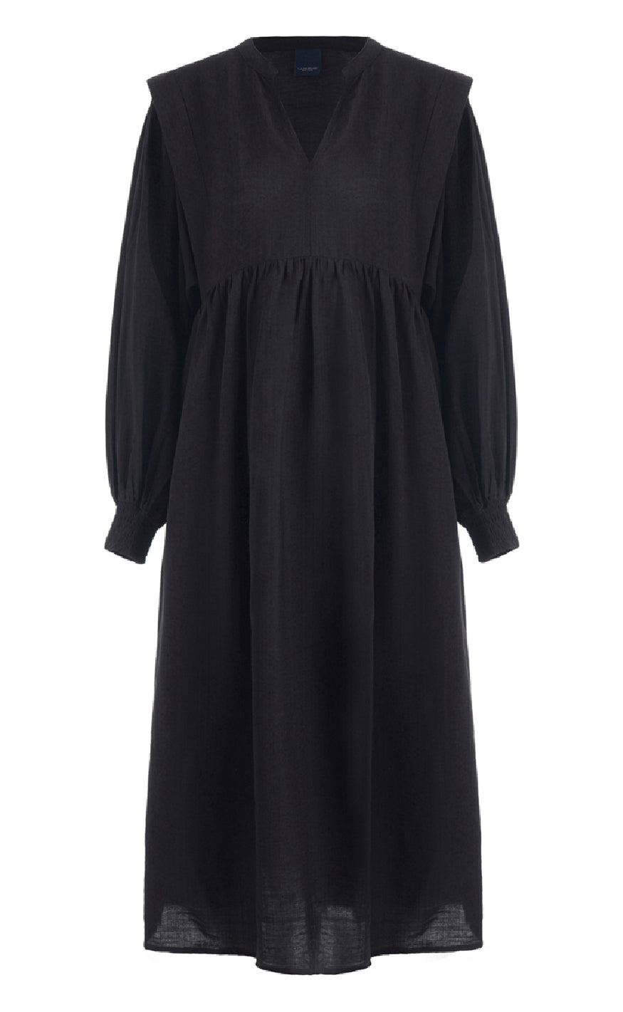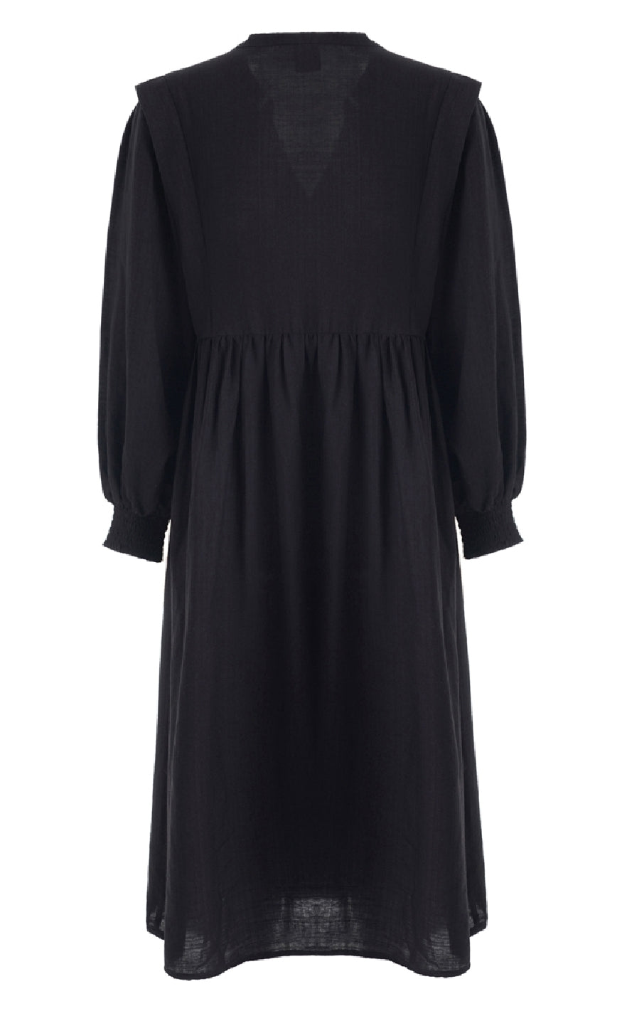 Sort kjole fra Luxzuz med V-udskæring og lange ærmer.
