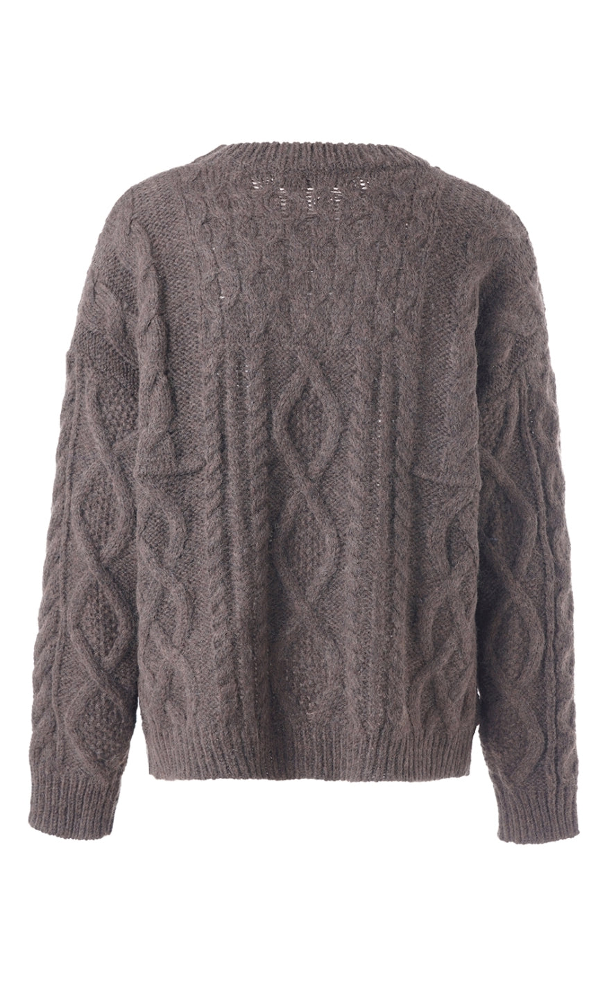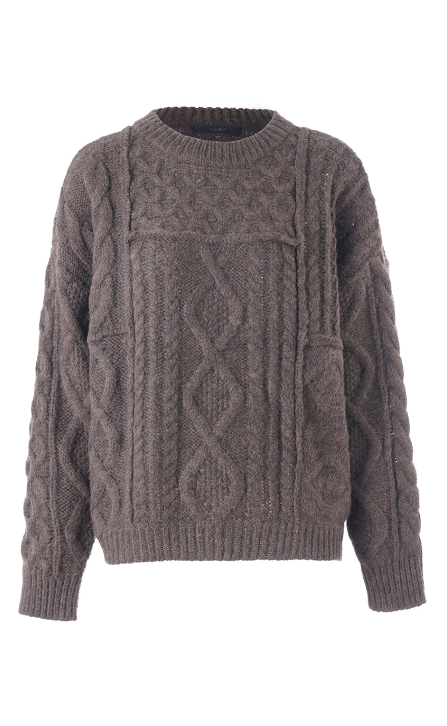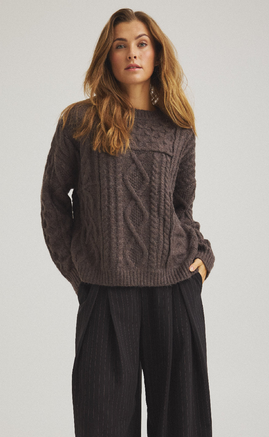 Brun striktrøje fra Luxzuz med rund hals og kabelstrikmønster.
