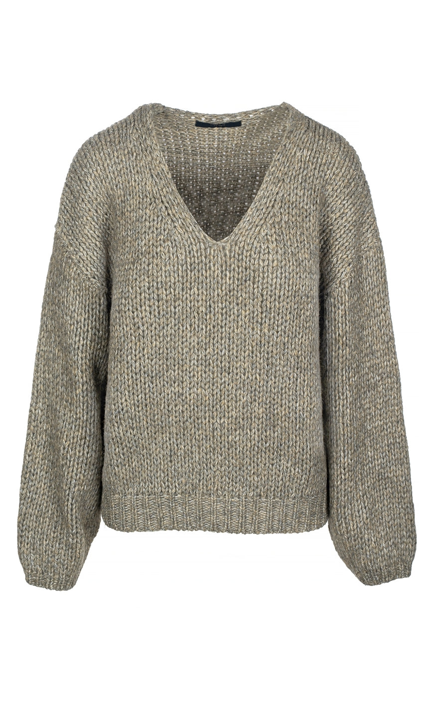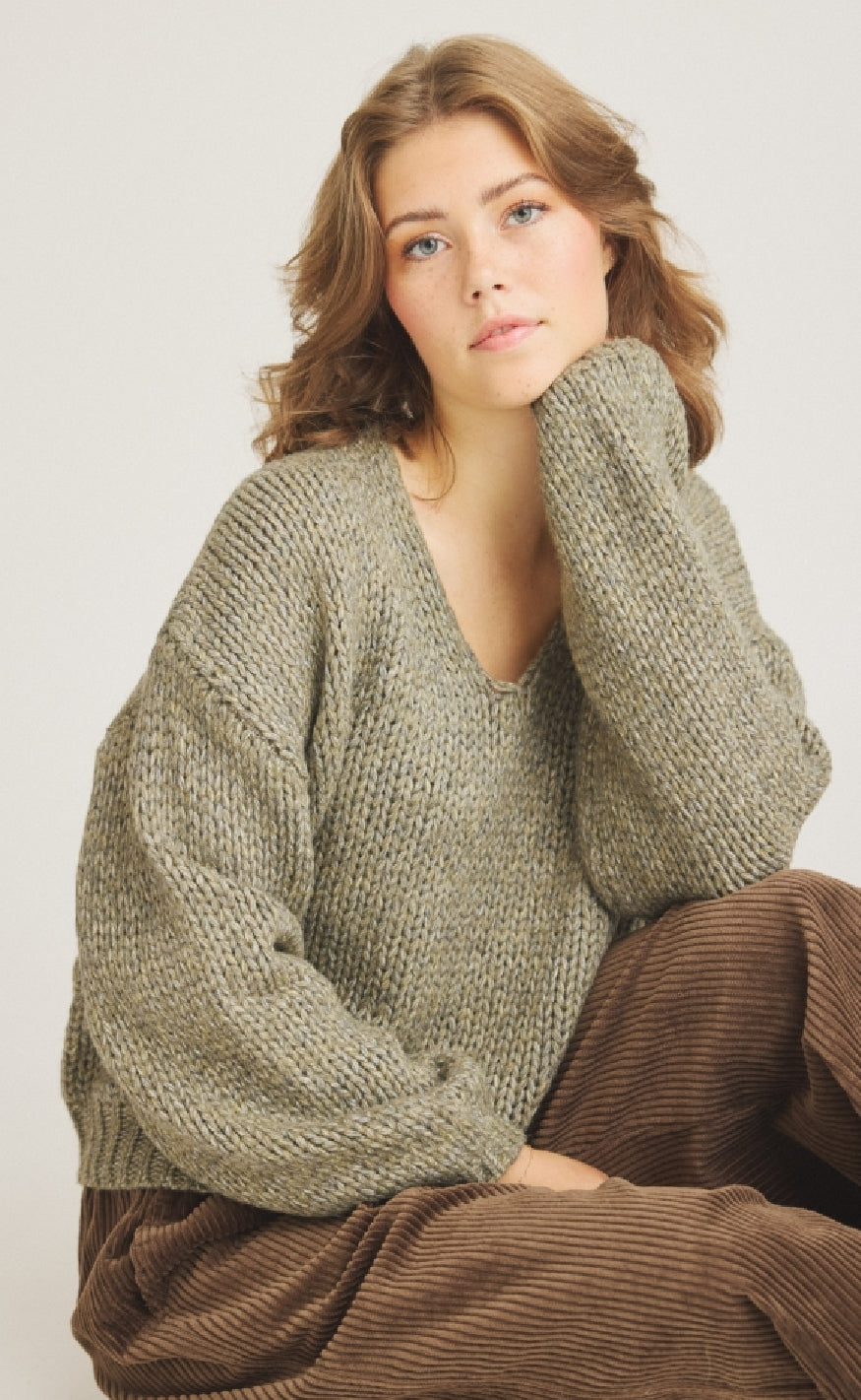 Chunky strik fra Luxzuz med dyb V-hals, lange ærmer med let balloneffekt og en løs pasform.