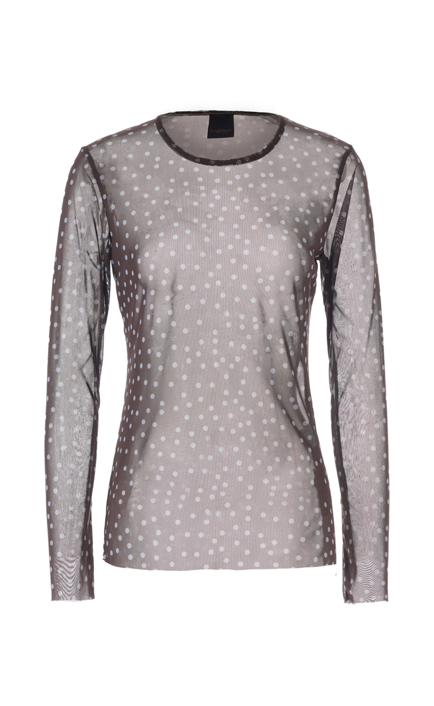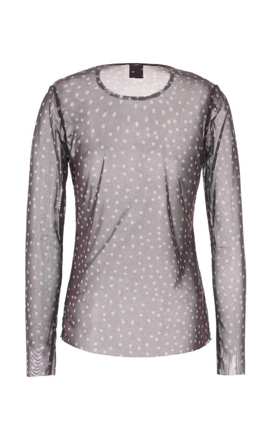 Blusen har rund hals, lange ærmer og en tætsiddende pasform med gennemsigtigt look.
