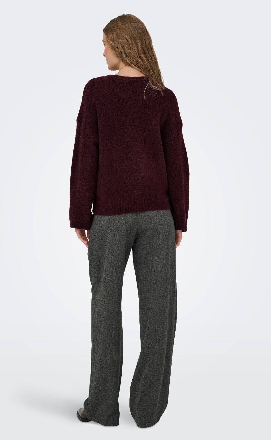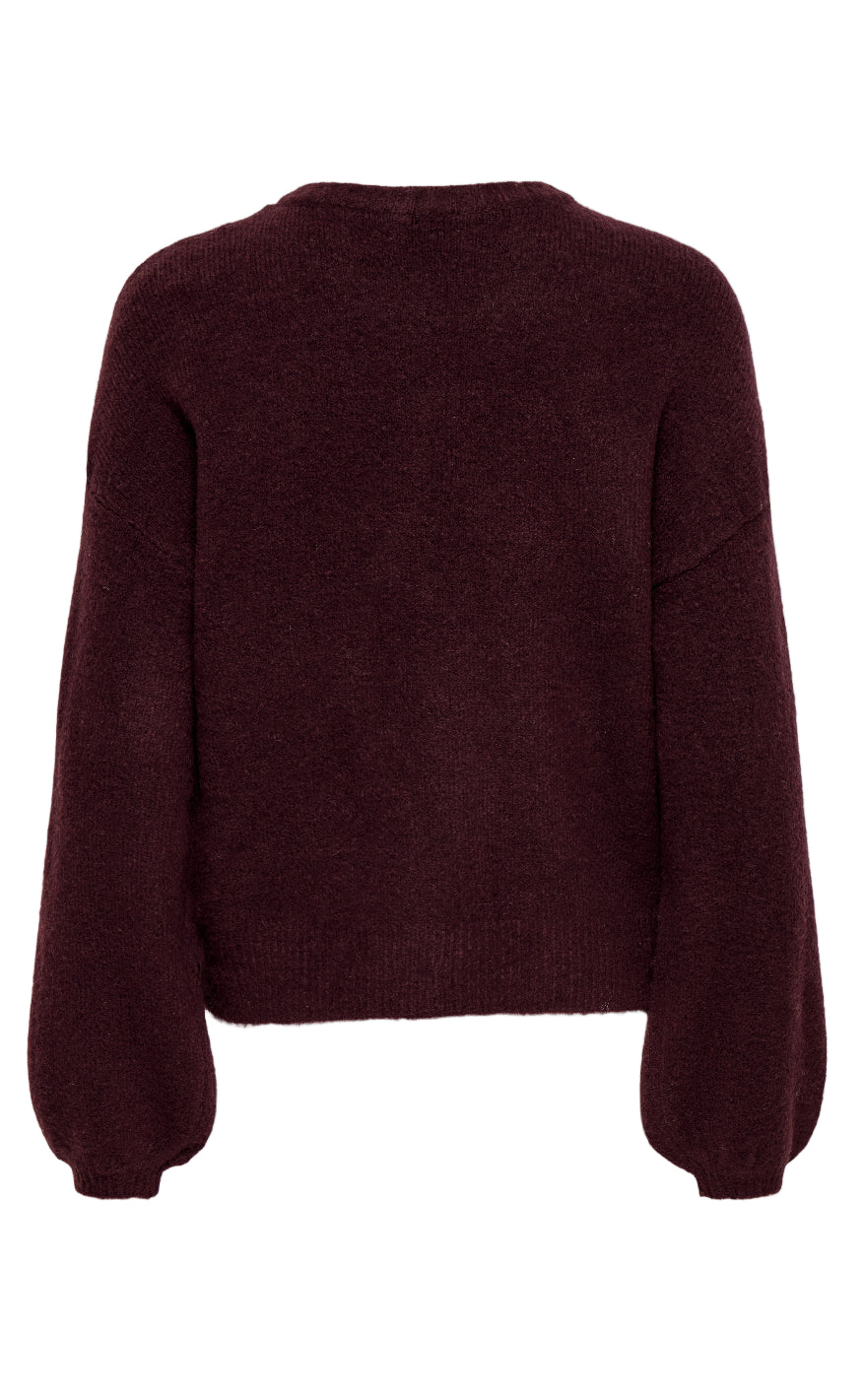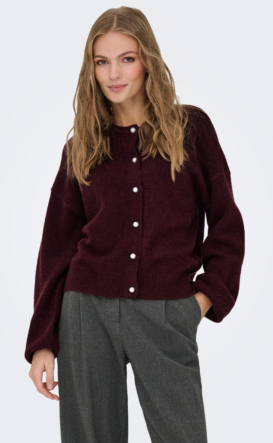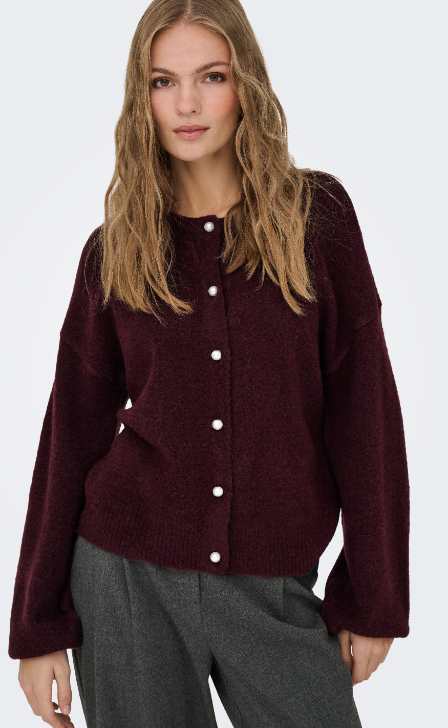 Vinrød cardigan med perleknapper og rund hals fra ONLY – et klassisk og feminint valg til enhver garderobe.