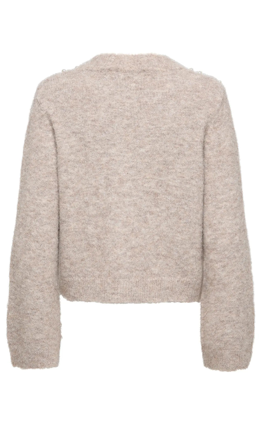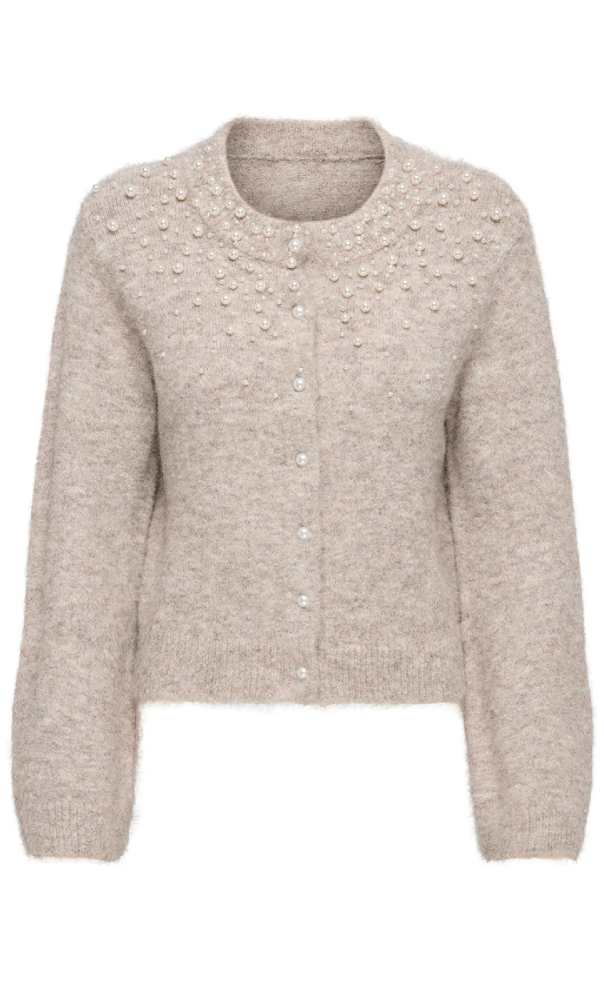 Beige cardigan fra ONLY med perledetaljer på skuldre og bryst samt knaplukning foran – en elegant og feminin tilføjelse til garderoben.