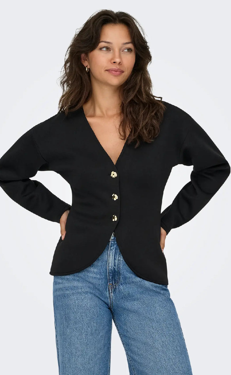 Sort cardigan fra ONLY med V-udskæring, lange ærmer og dekorative guldfarvede knapper – et stilrent valg til både hverdag og fest.