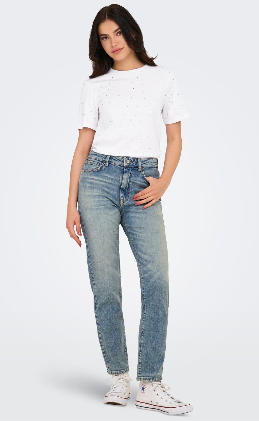 Enkel og elegant t-shirt fra Only, som er den perfekte basisstyle. T-shirten er lavet i en blød bomuldsblanding og har et klassisk, afslappet fit med rund hals og korte ærmer. De diskrete, små sten over hele fronten tilfører et feminint og eksklusivt twist til det ellers minimalistiske design.