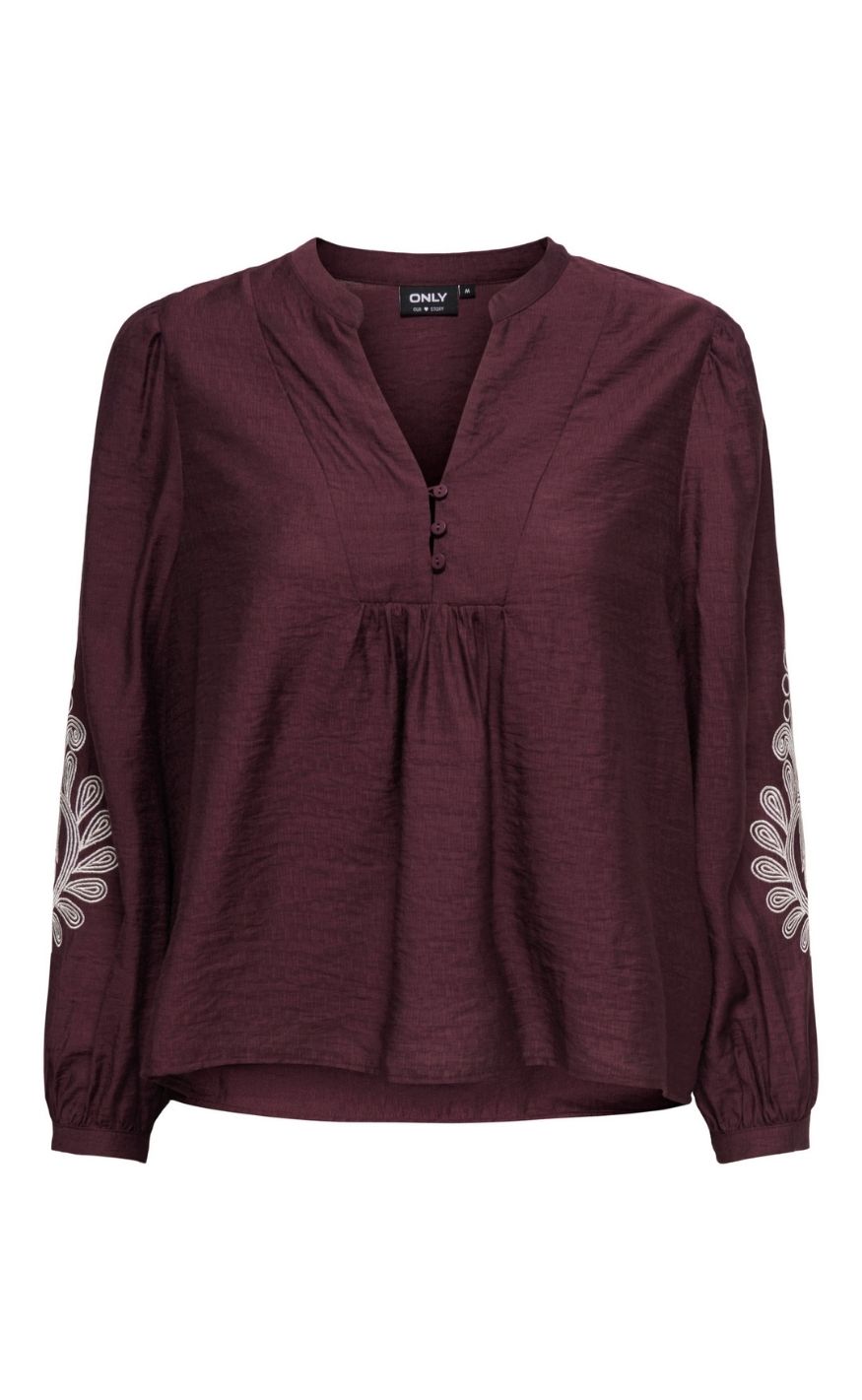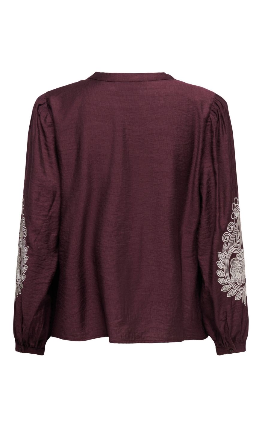 Smuk bordeaux bluse, der kombinerer enkelthed med smukke detaljer. Blusen har v-udskæring med knapper, og fine broderede detaljer i hvid på ærmerne.