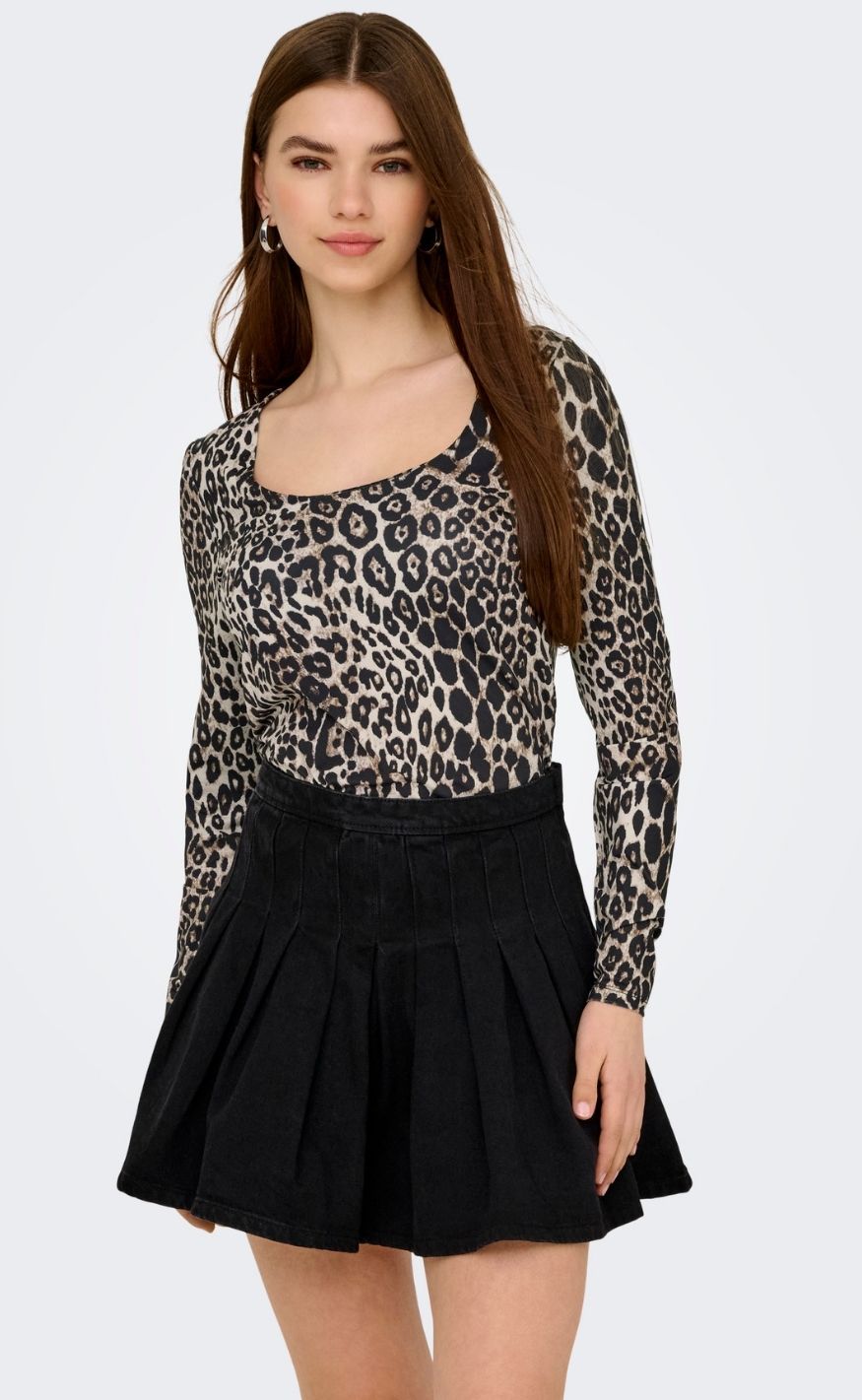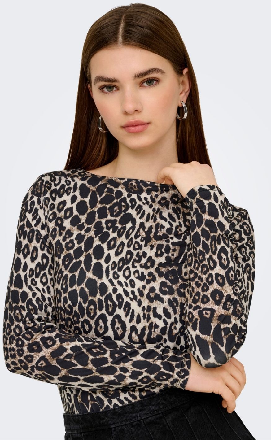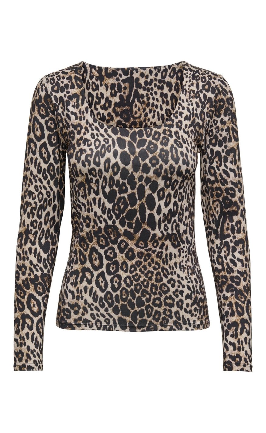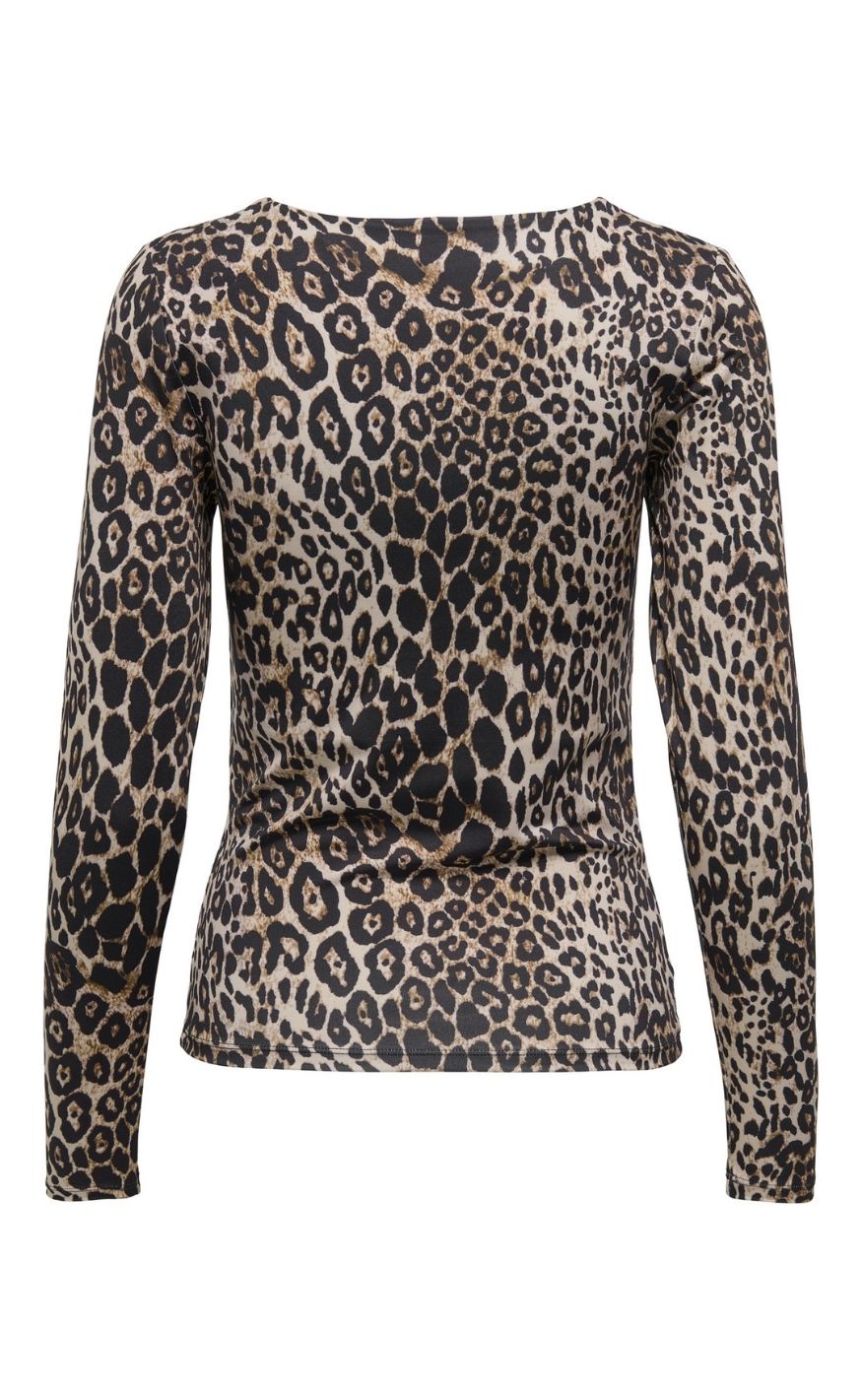 Flot tætsiddende leopard bluse fra ONLY. Blusen er i en blød og fleksibel jersey-kvalitet, så den både er behagelig at have på og sidder flot om kroppen. Blusen kan vendes begge veje - se modelbillederne.