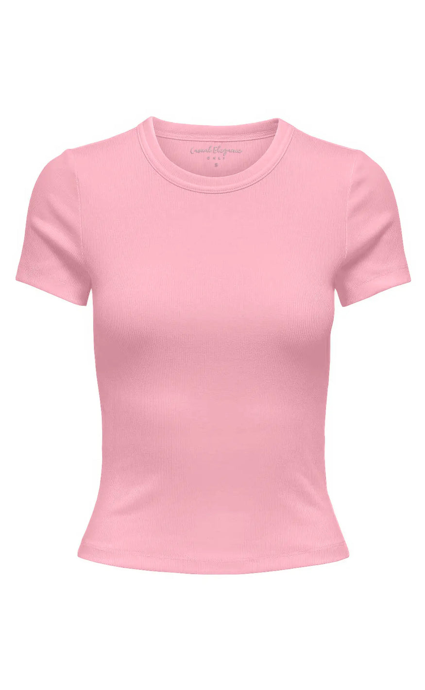 Basic rib t-shirt fra ONLY i en lyserød nuance, med korte ærmer og en rund hals.