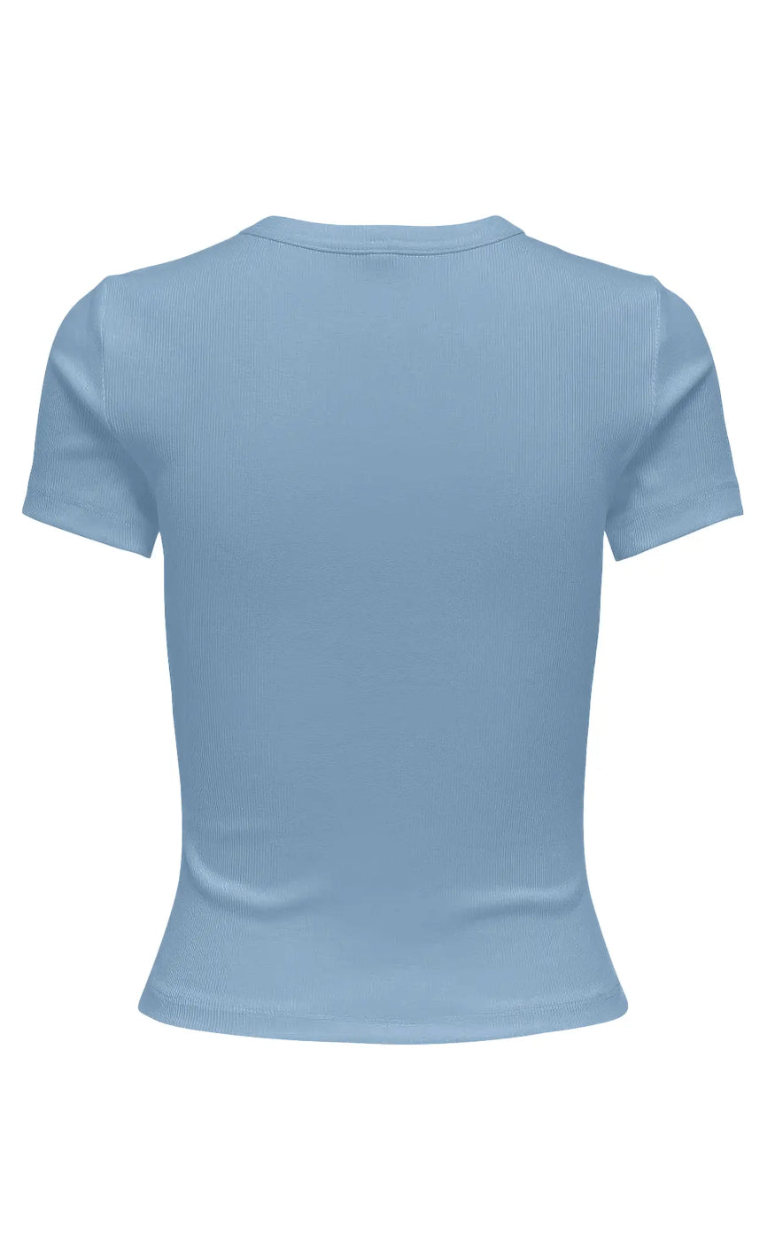 Basic rib t-shirt fra ONLY i en lyseblå nuance, med korte ærmer og en rund hals.