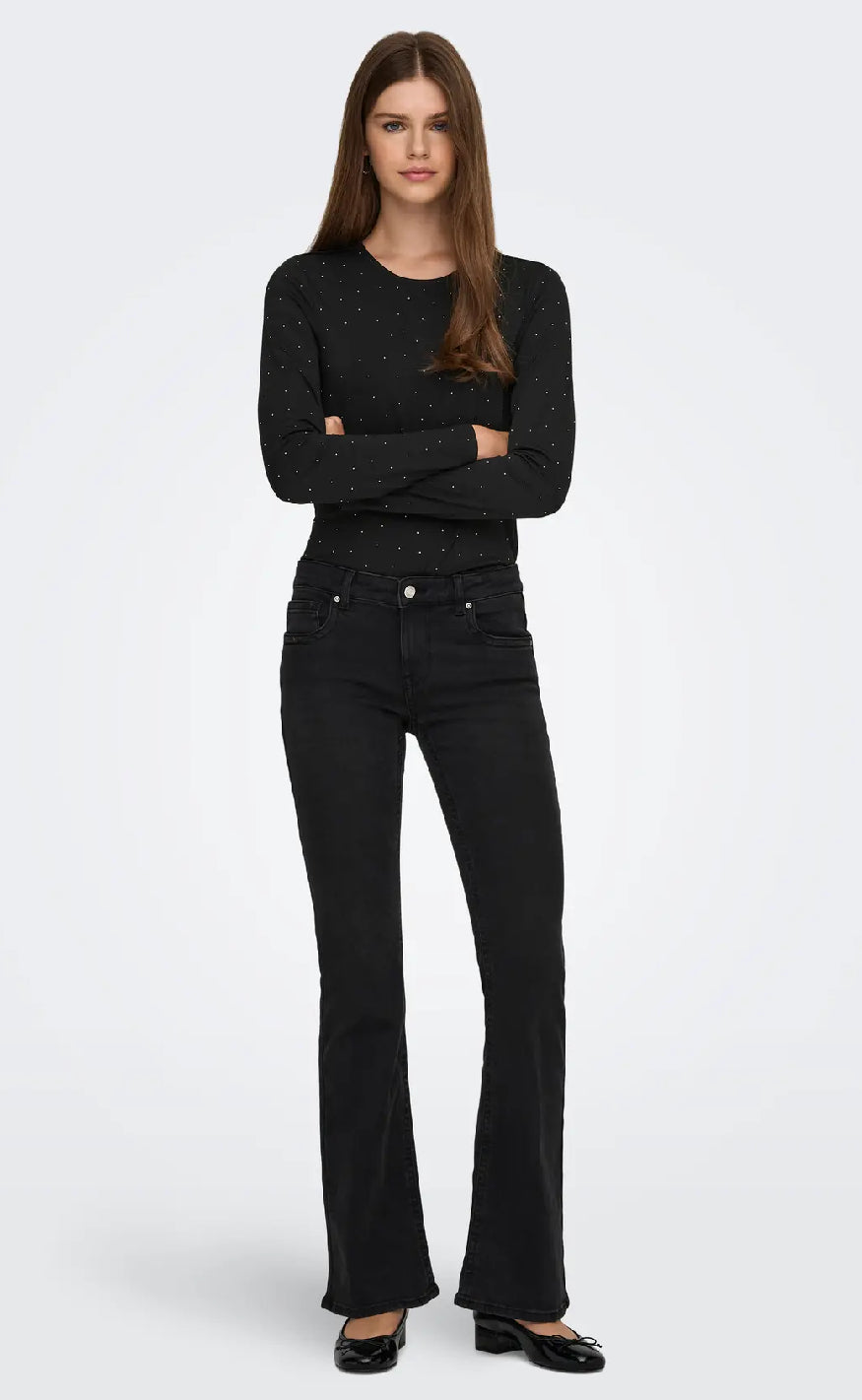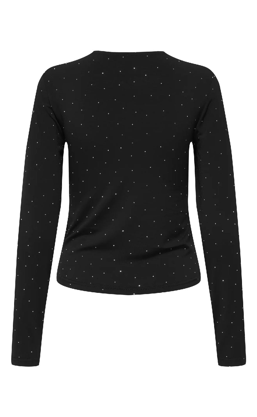 Sort langærmet top fra ONLY med rund hals og små glitrende sten – perfekt til et elegant og festligt look.