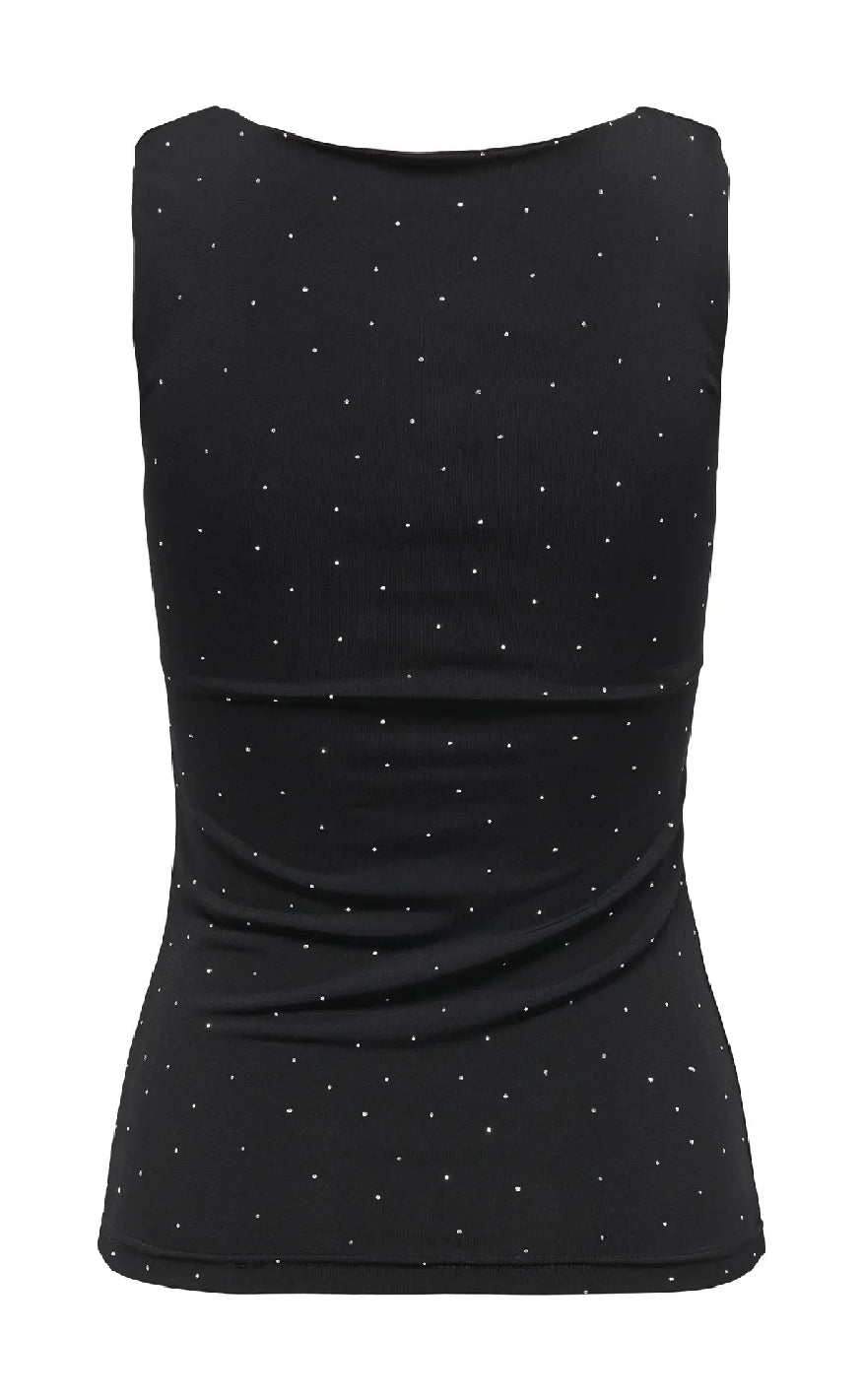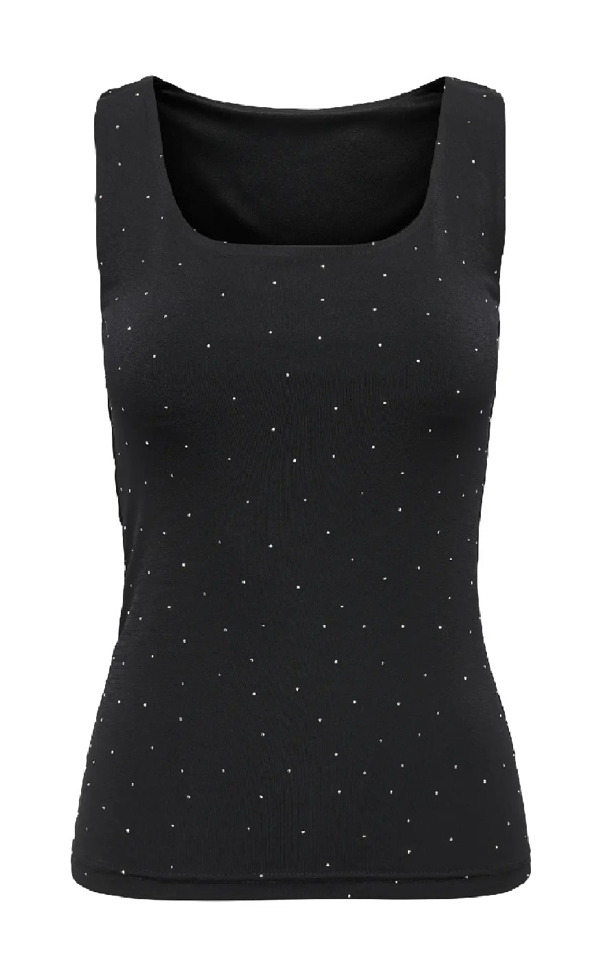 Enkel og stilfuld tanktop i dyb sort nuance med små, diskrete rhinsten, der tilfører et elegant og feminint touch.