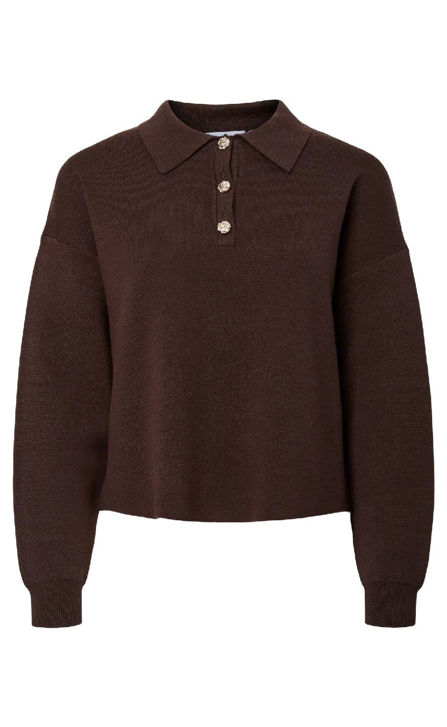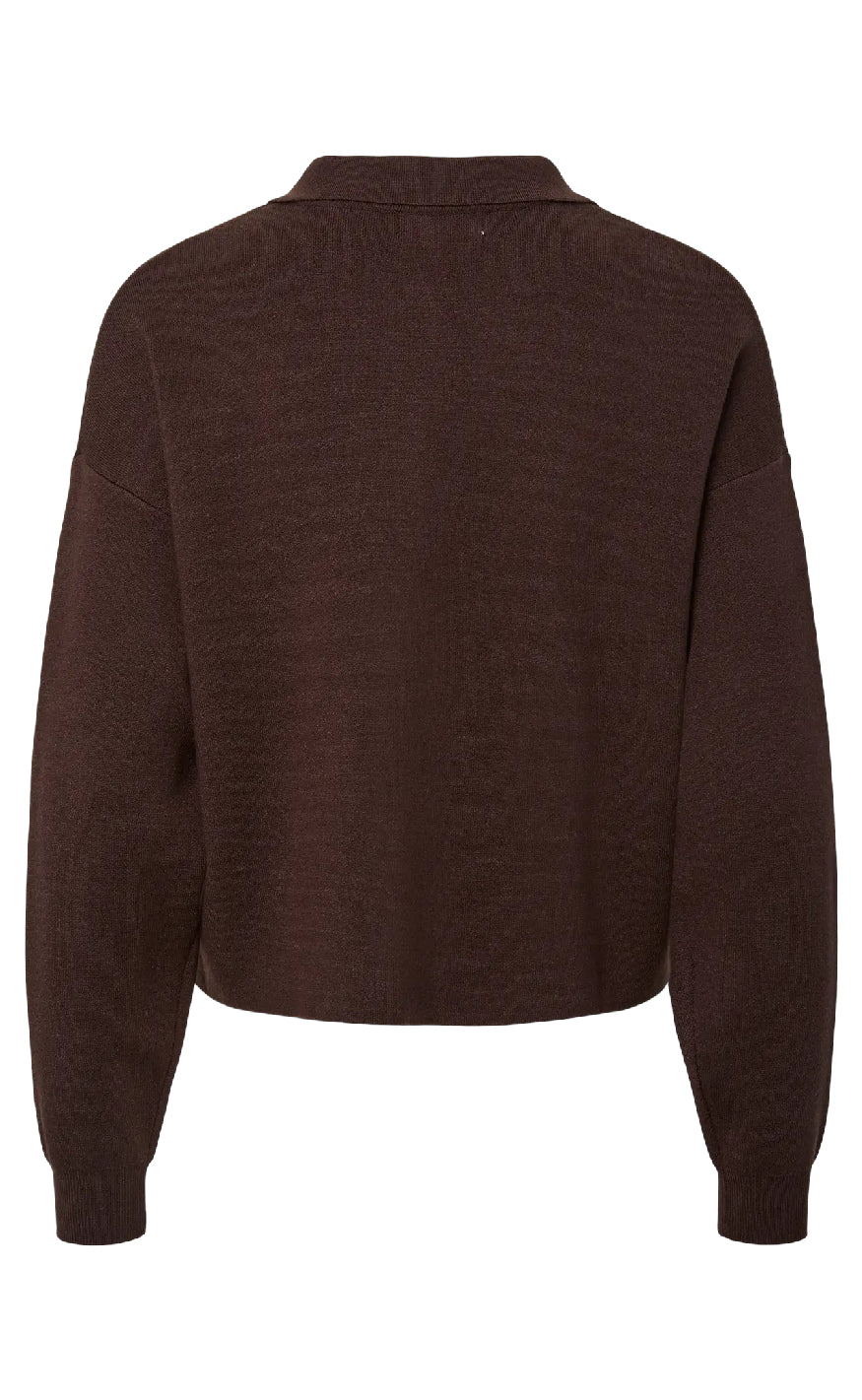 Blusen har en polokrave med dekorative knapper, der tilfører et elegant og feminint touch. Den har lange ærmer, en afslappet pasform og en blød, strikket struktur, som gør den både komfortabel og stilfuld. P