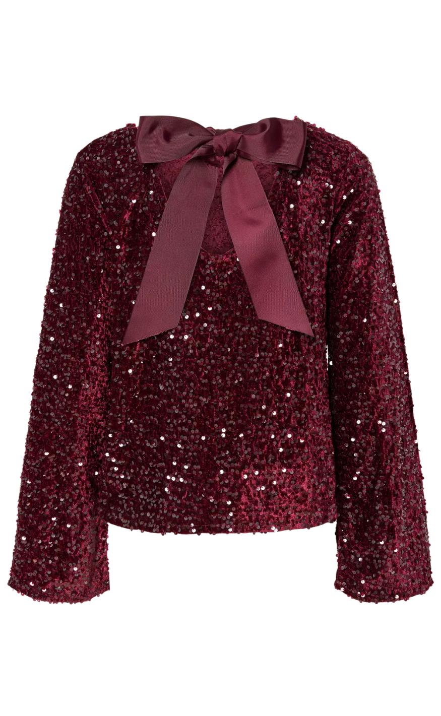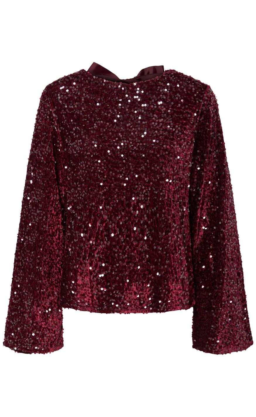 Fin top fra Pieces, toppen er rød og har en masse plietter.