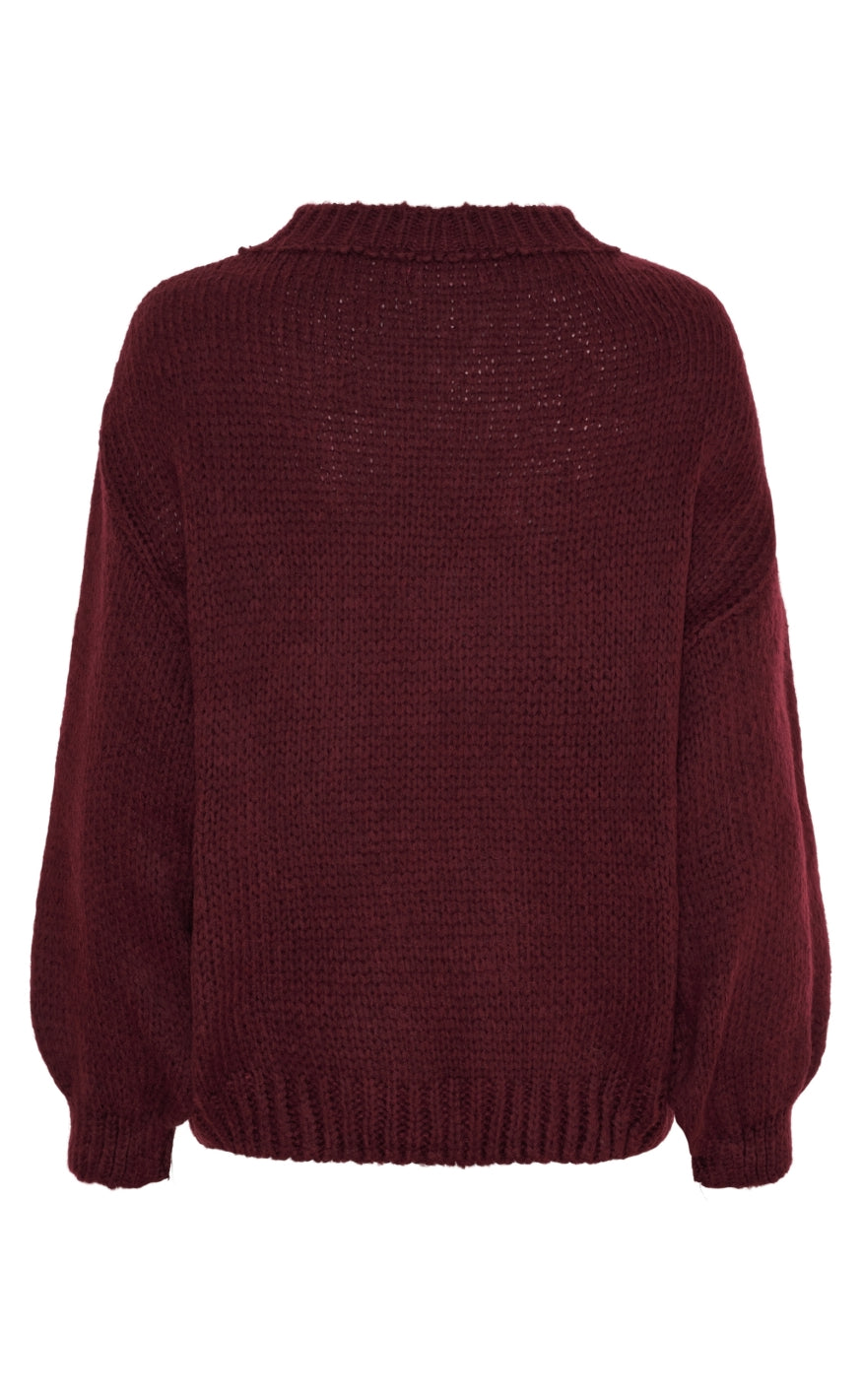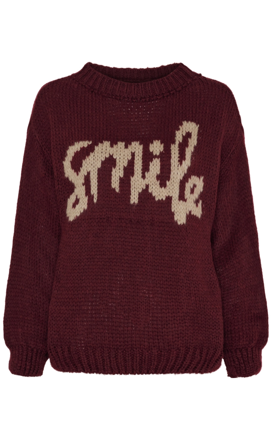 Lækker striktrøje fra Marta Du Chateau i bordeaux rød med skriften "Smile" stående på fronten.