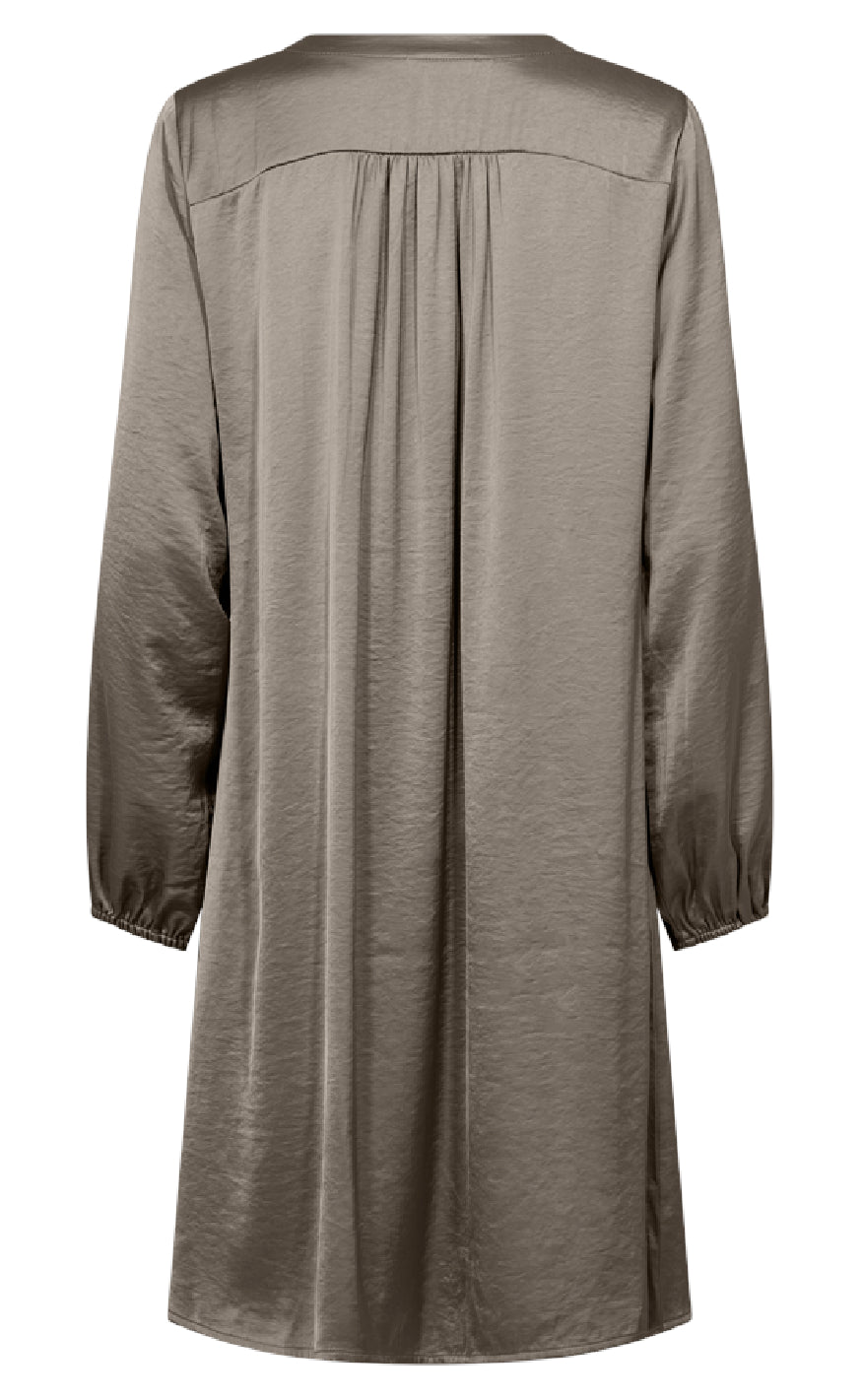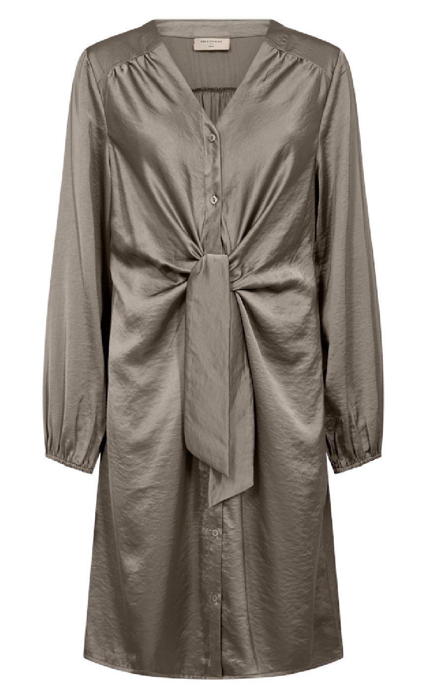En knælængde skjortekjole fra Freequent i glansfuldt taupefarvet stof med V-udskæring, knapper foran og lange ærmer.