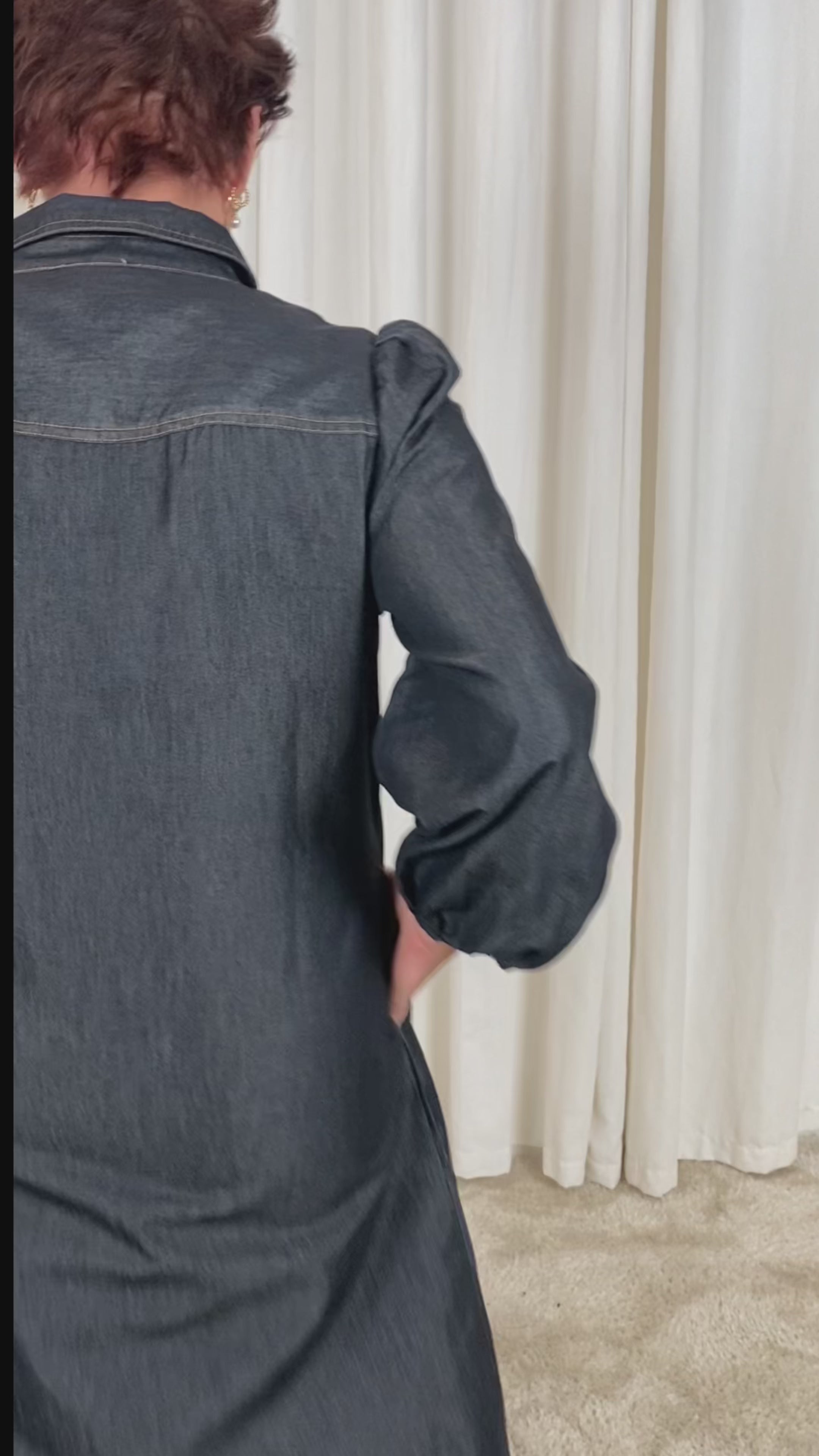 Kjolen har lange ærmer, en åbning med knapper fortil og brystlommer.