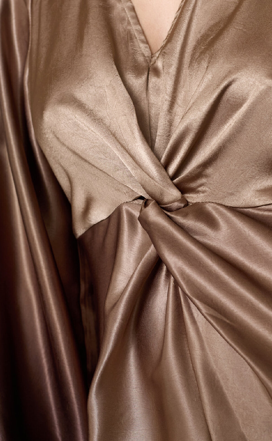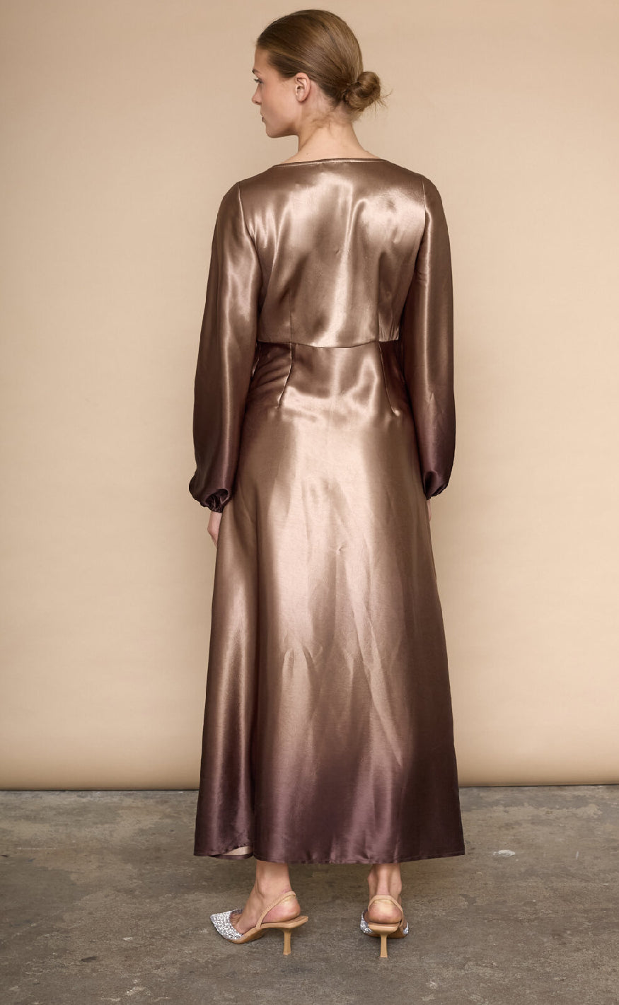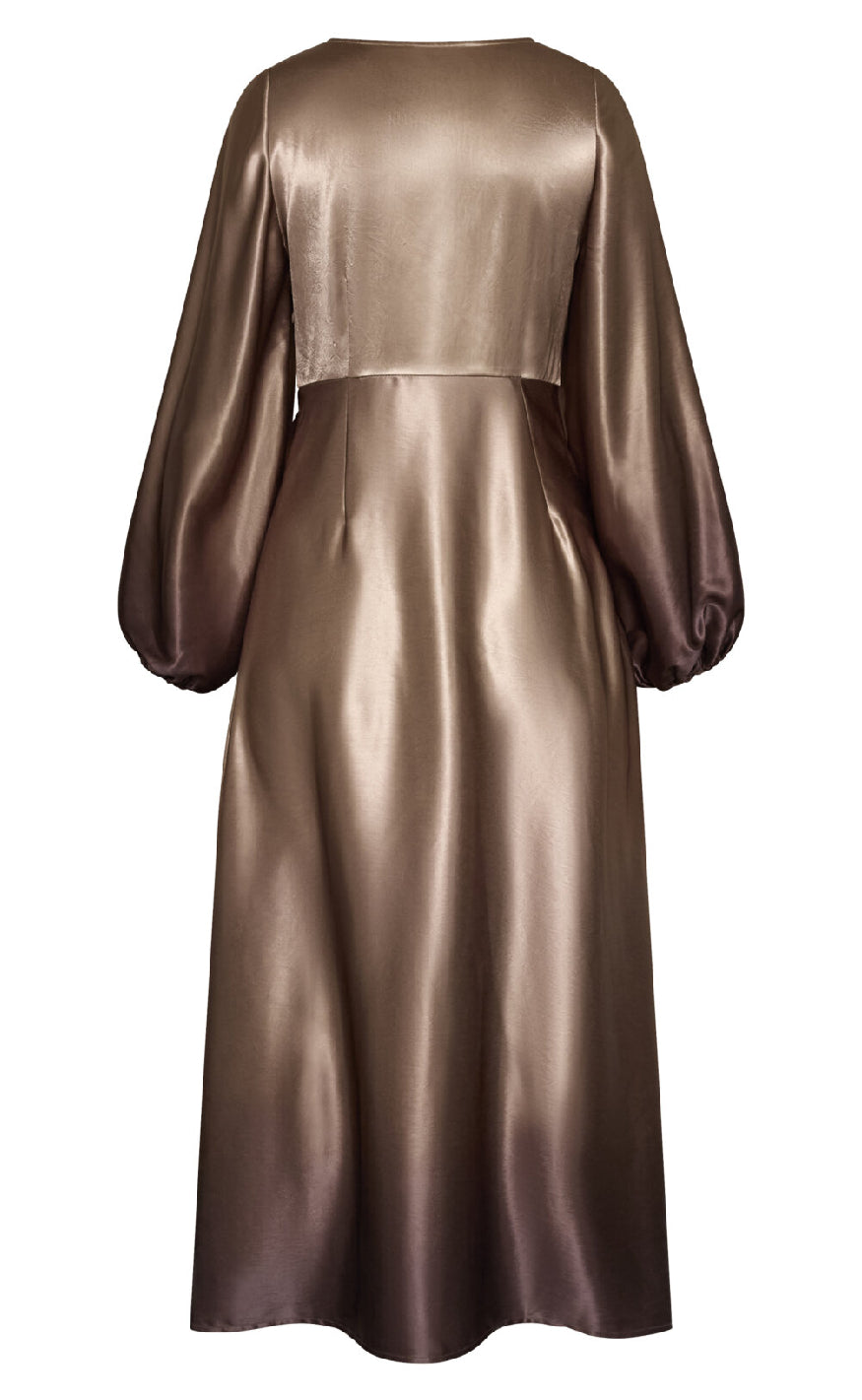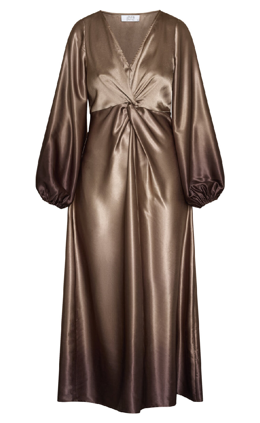 Elegant kjole fra Love & Divine i et glat, skinnende materiale med draperet snit, V-hals, voluminøse ærmer og asymmetrisk slids i siden – perfekt til særlige anledninger.