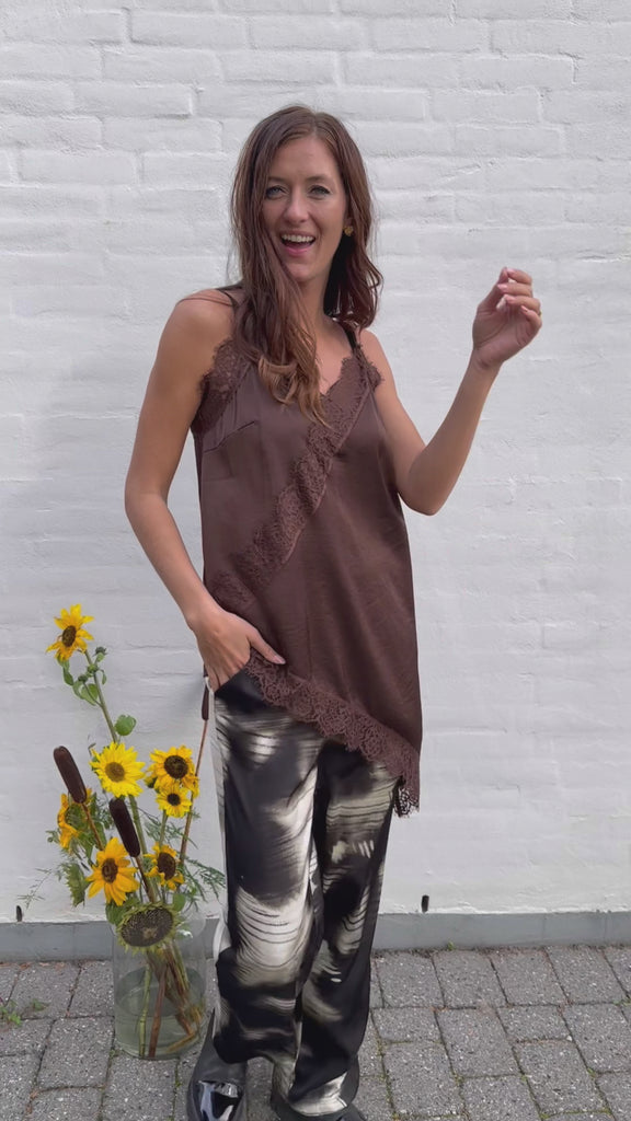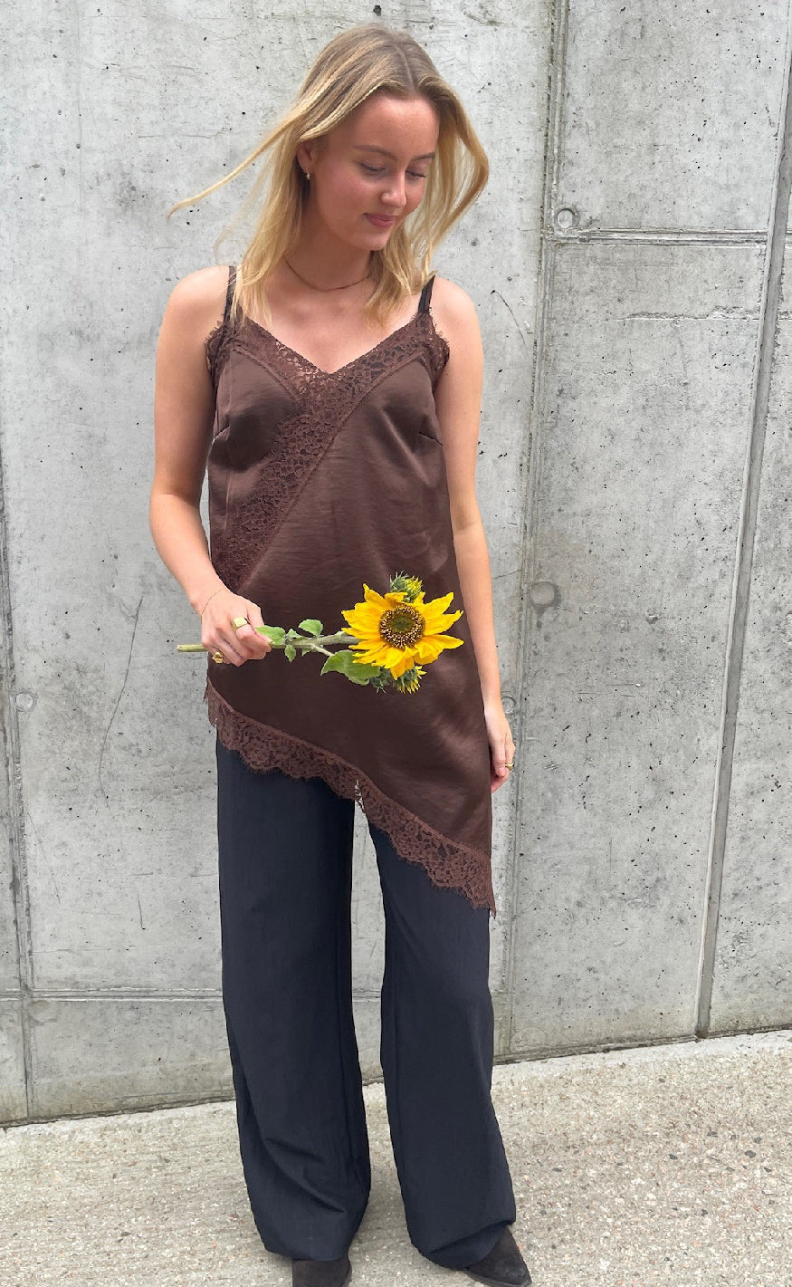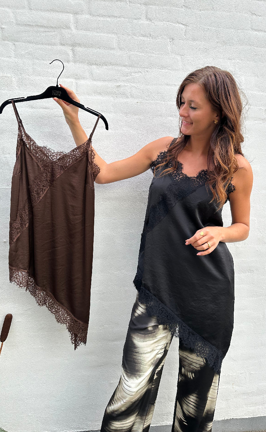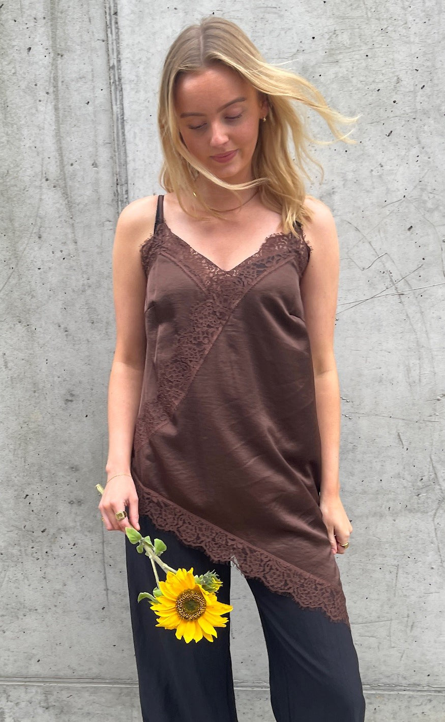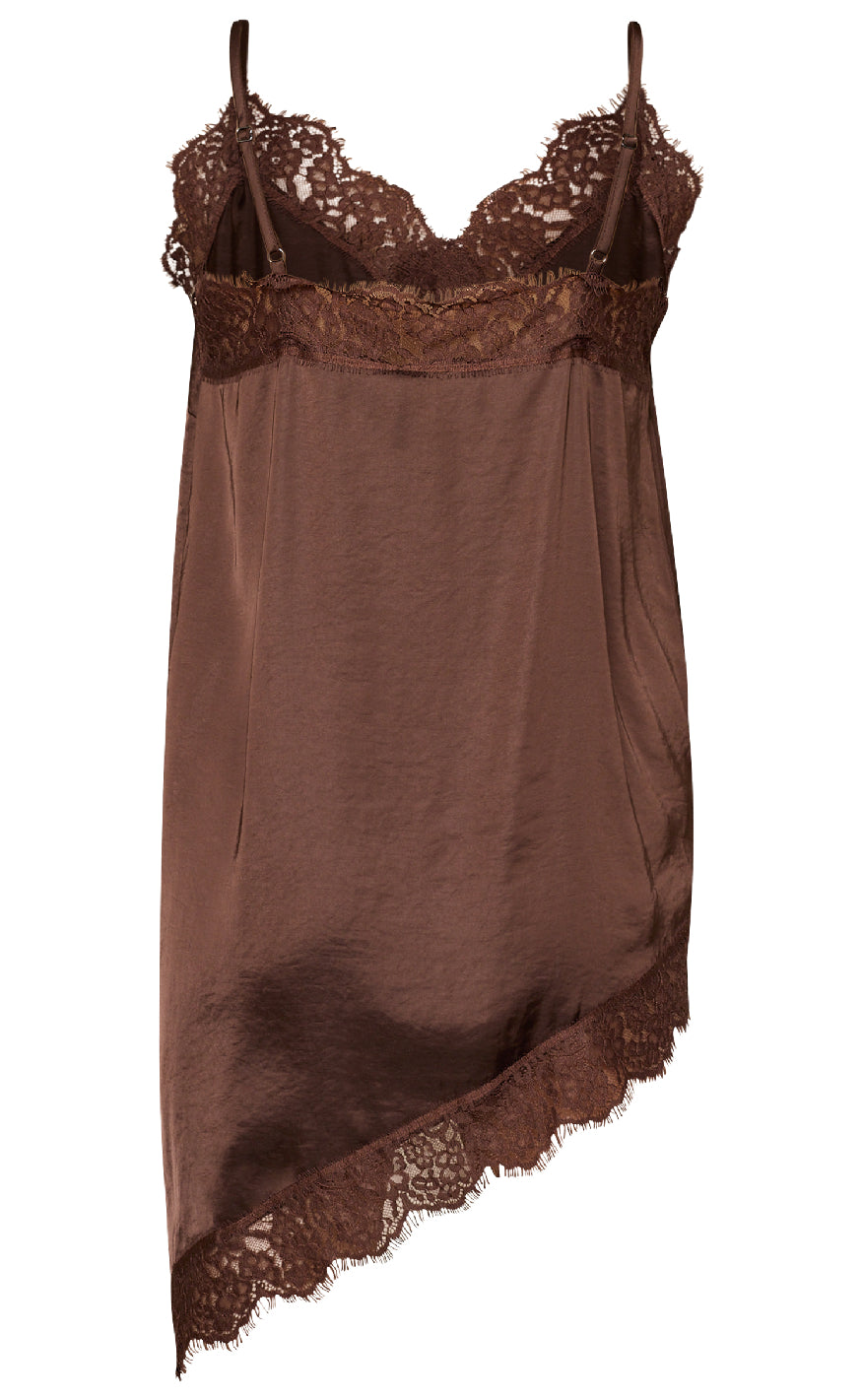 Smuk og afslappet satin kjole fra Love & Divine i brun, med blondekant.