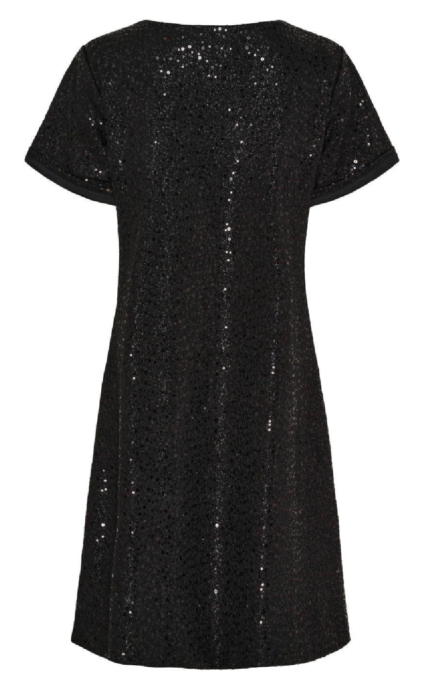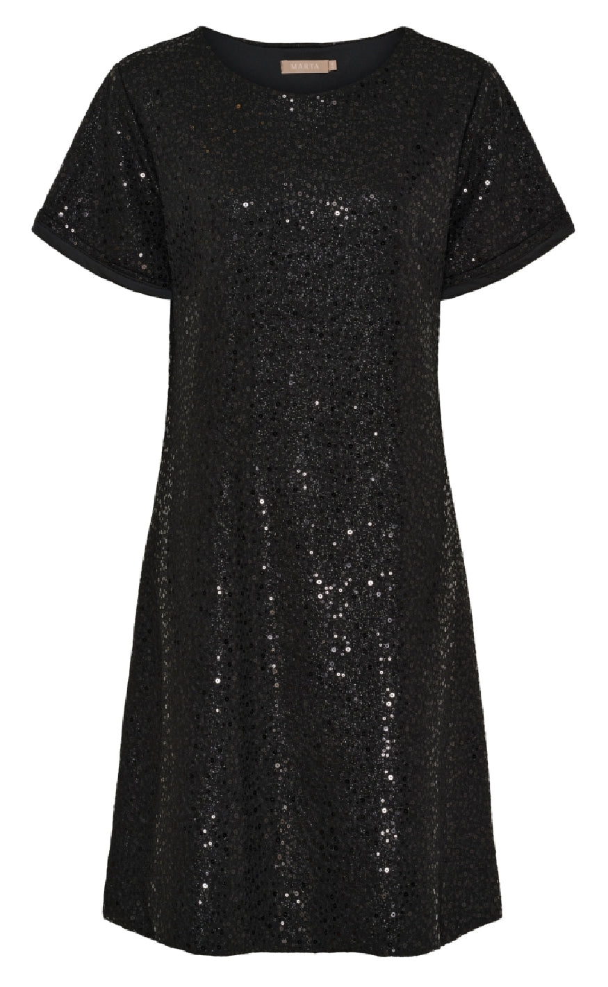 Kjole fra Marta Du Chateau i sort med korte ærmer og et glitrende, diskret mønster, der giver et elegant og festligt udtryk.
