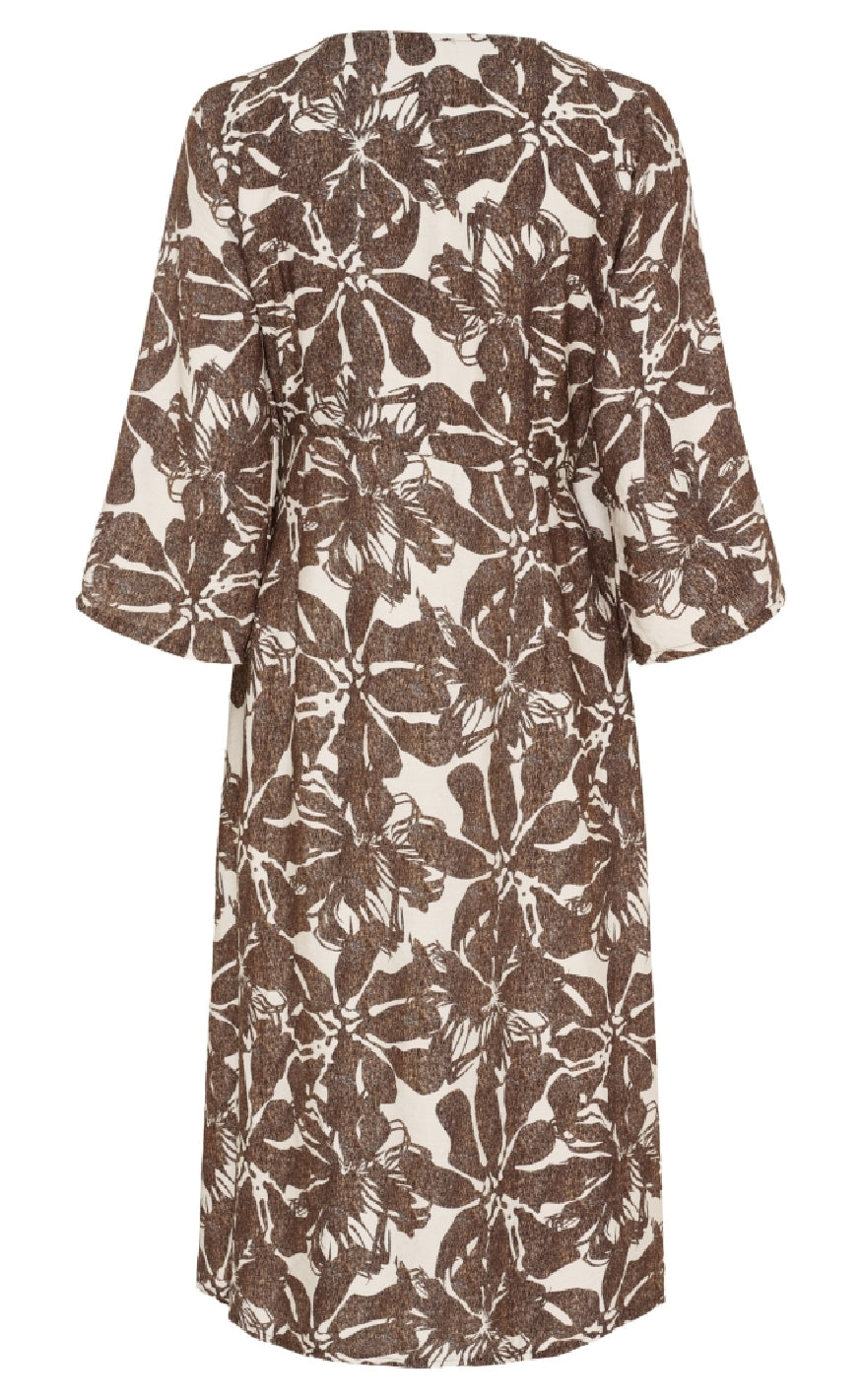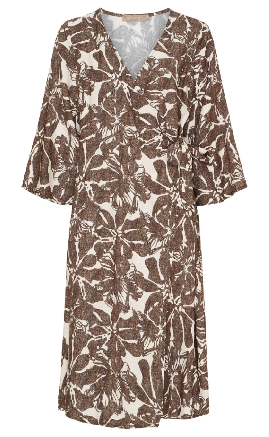 Lækker og fin slå-om kjole i brun med hvide blomster.