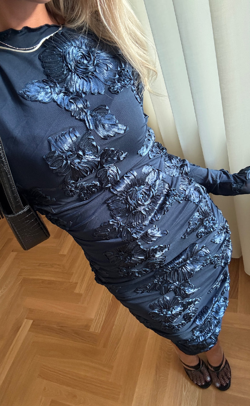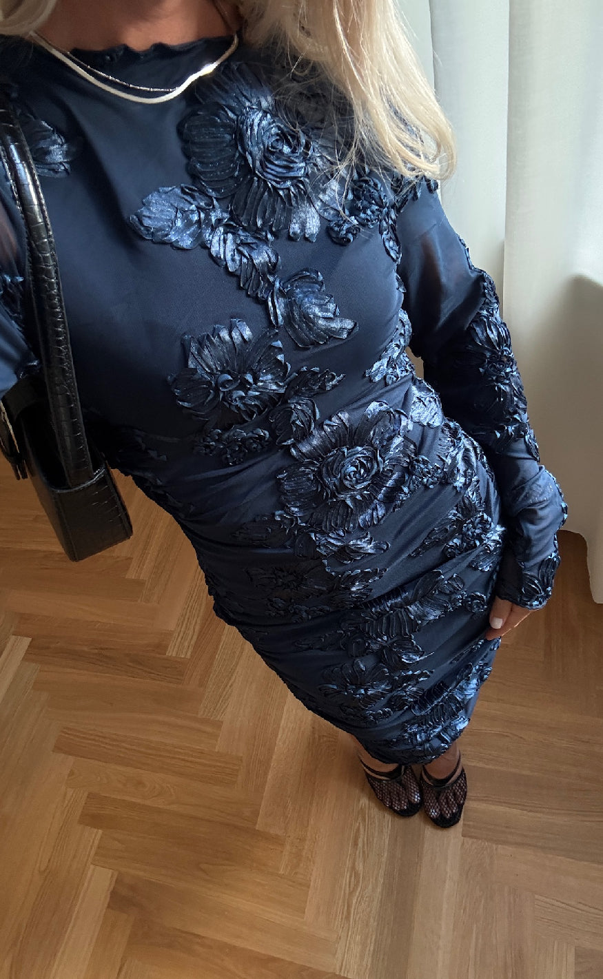 Kjolen har lange ærmer og har et tætsiddende fit.