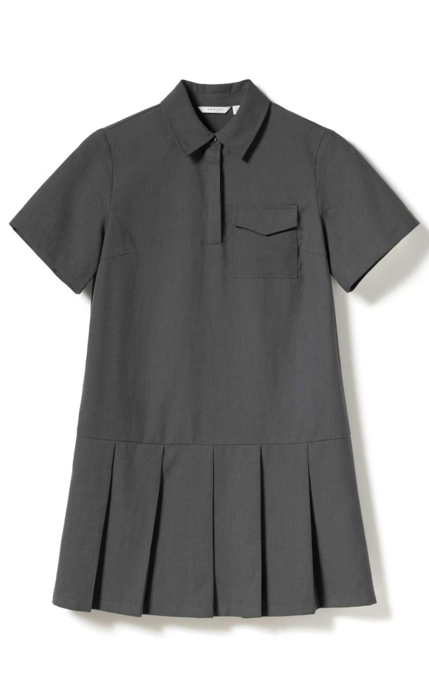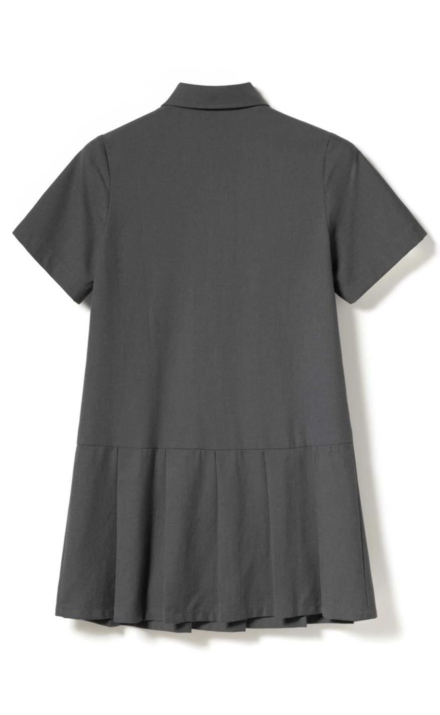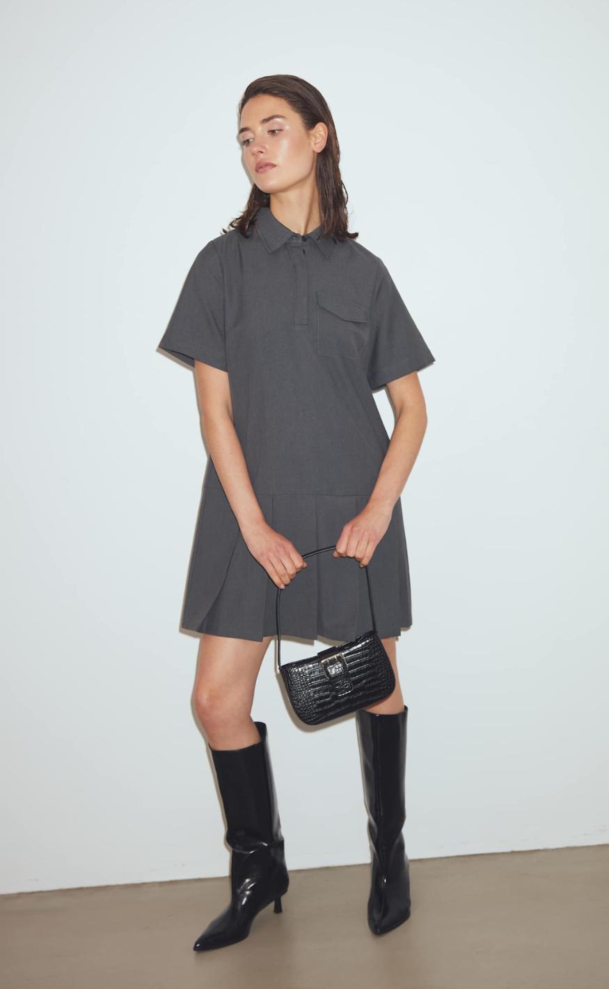 Kjole har et skjorte look, med krave og knapper. Kjolen har flæser i bunden.
