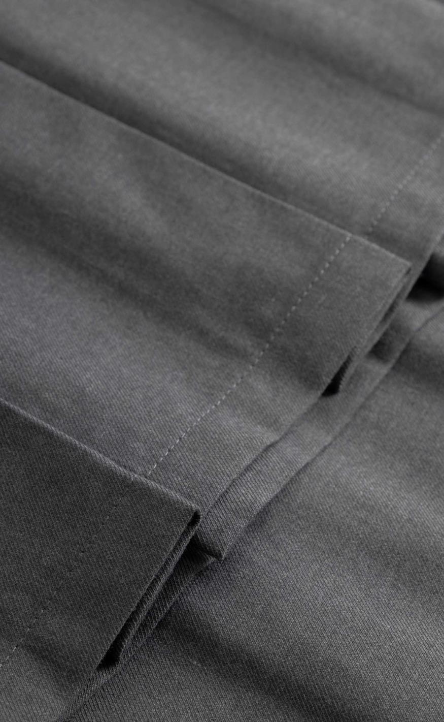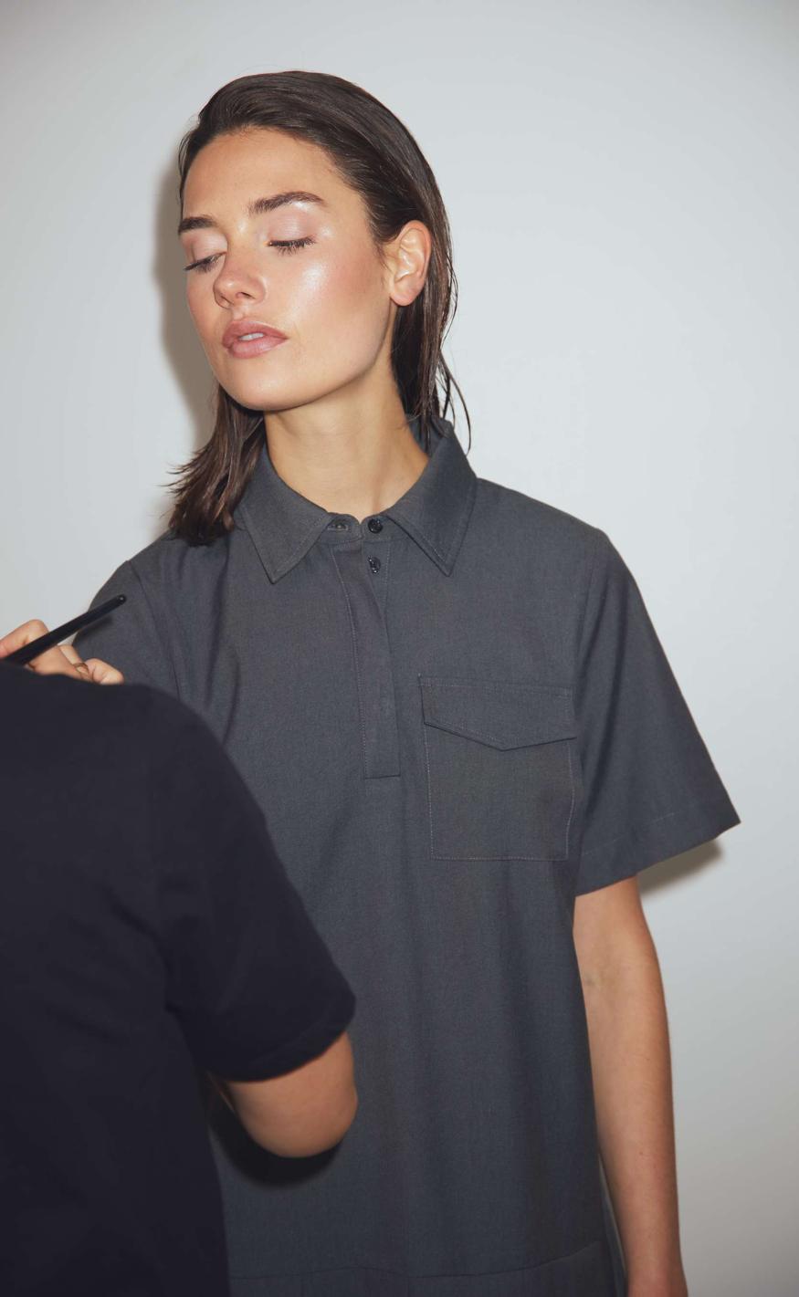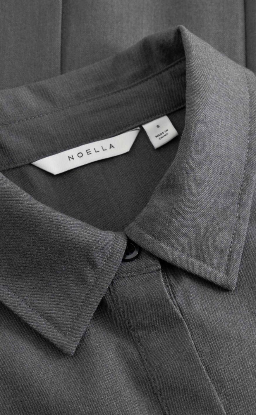 Kjole har et skjorte look, med krave og knapper. Kjolen har flæser i bunden.
