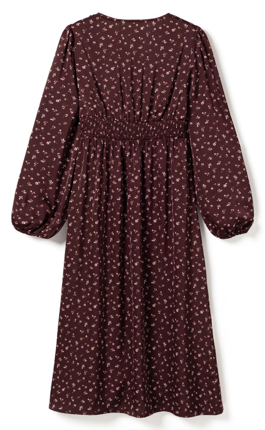 Brun midikjole fra Noella med småblomstret print, V-udskæring og lange ballonærmer for et feminint og elegant look.