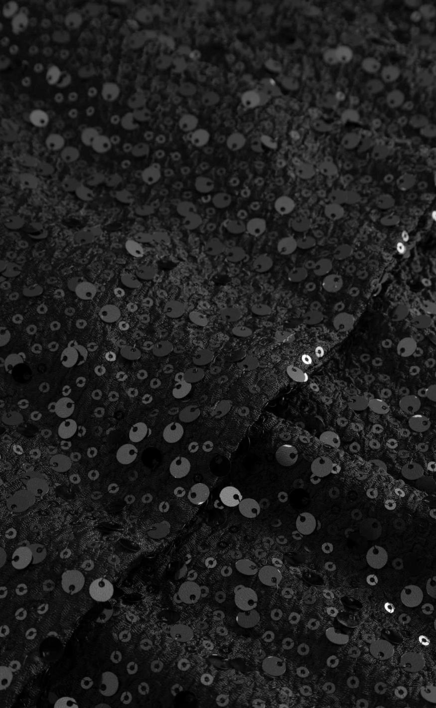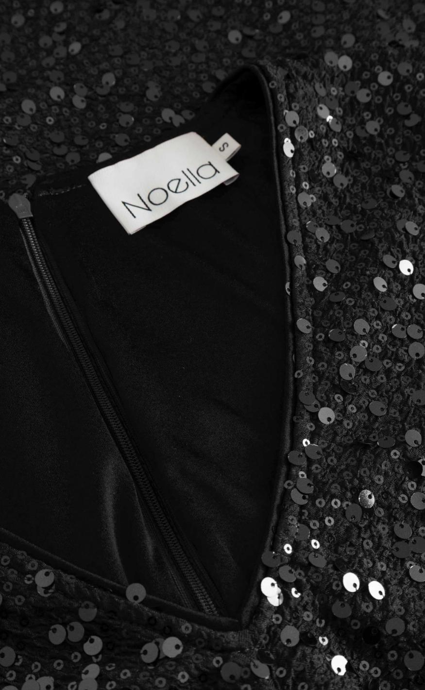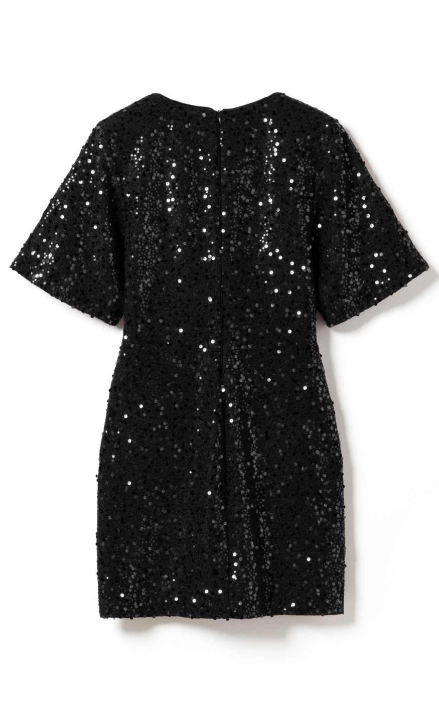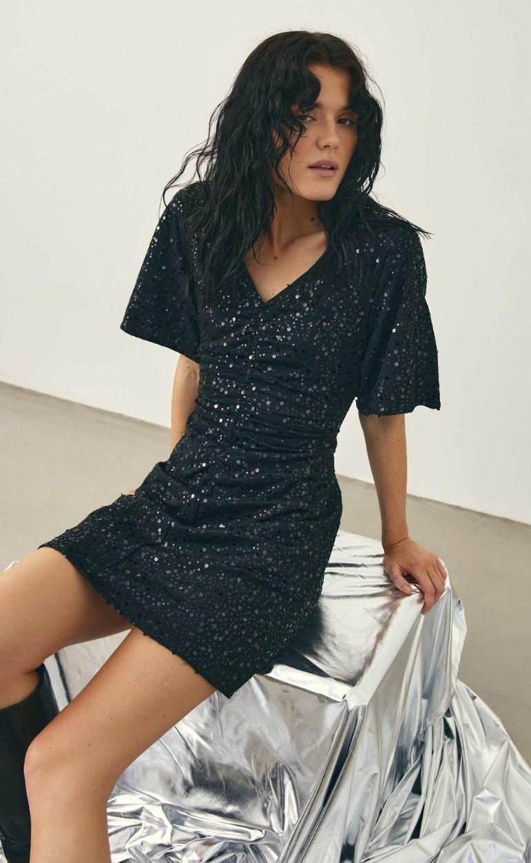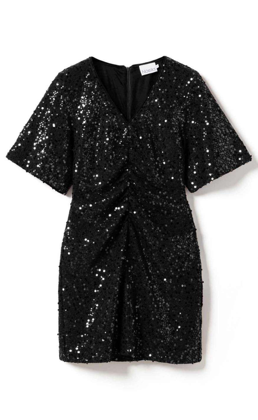 Denne kjole i sort med en masse palitter. Den er super smuk med sin markeret tajle, v-udskæring og korte ærmer.