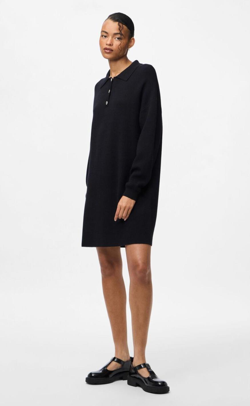 Denne kjole er lavet i blød fladstrik – en metode, der giver et lækkert, kraftigt strik med tydelig struktur og ribkanter. Designet har en klassisk polokrave med halv knaplukning, lange ærmer med ribbede kanter og en behagelig strikket pasform, der både føles og ser eksklusiv ud.