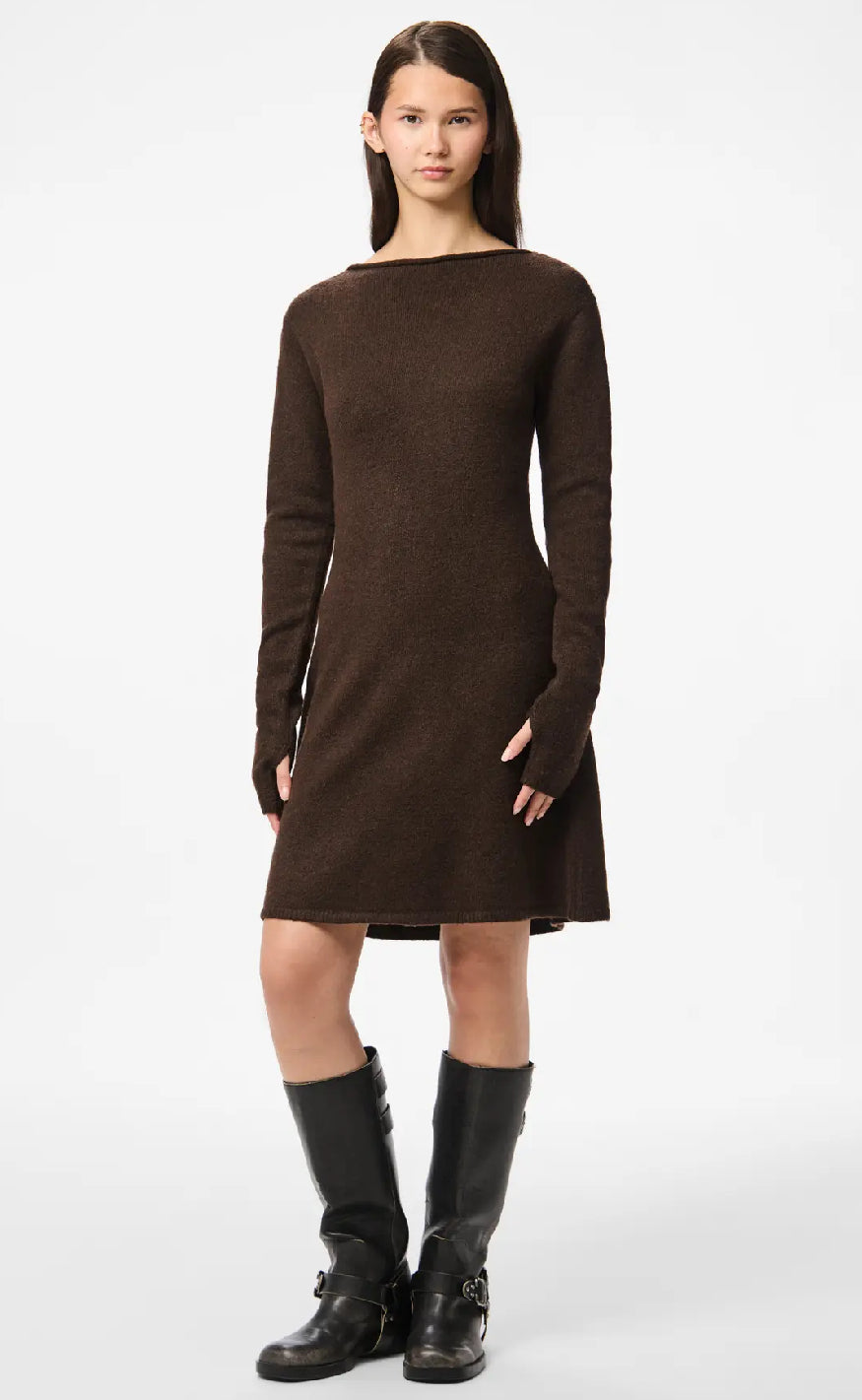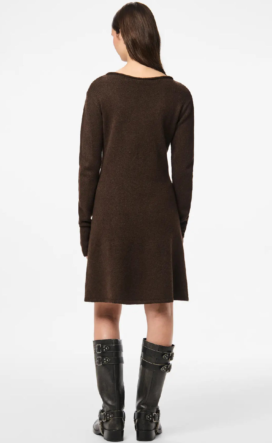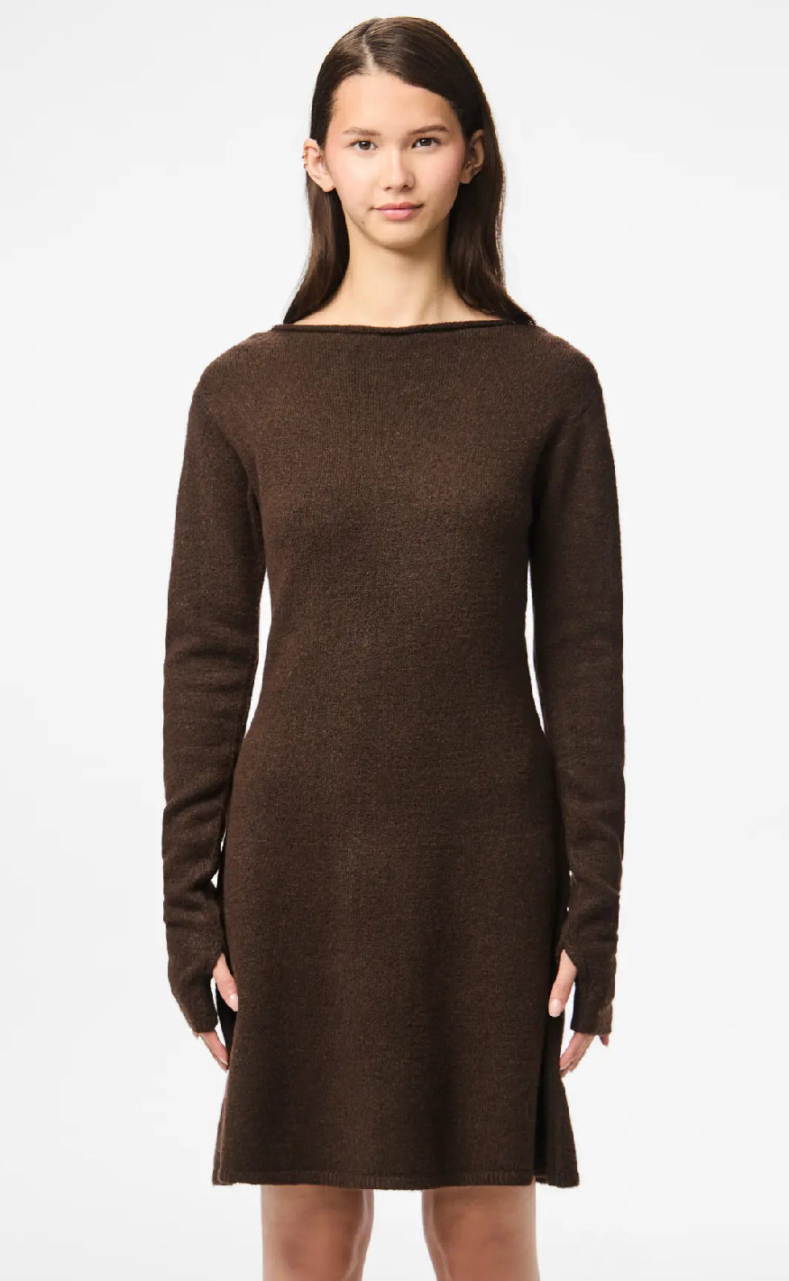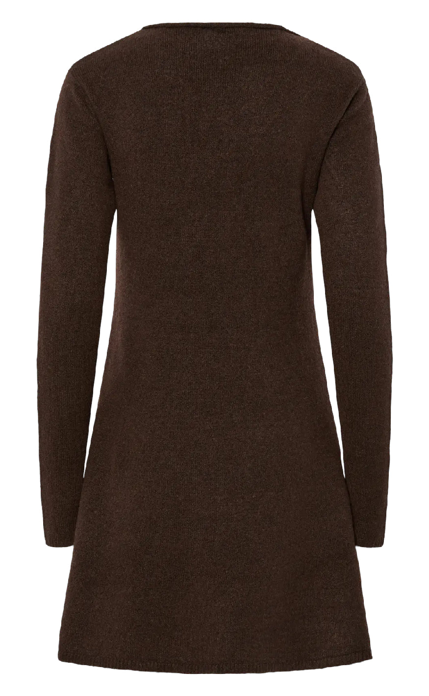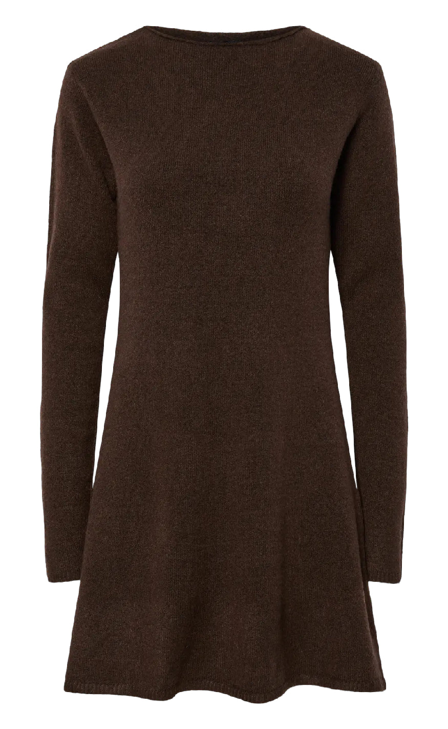 Brun, strikket kjole fra Pieces med lange ærmer og enkel rund hals – en klassisk og behagelig style til både hverdag og layering.