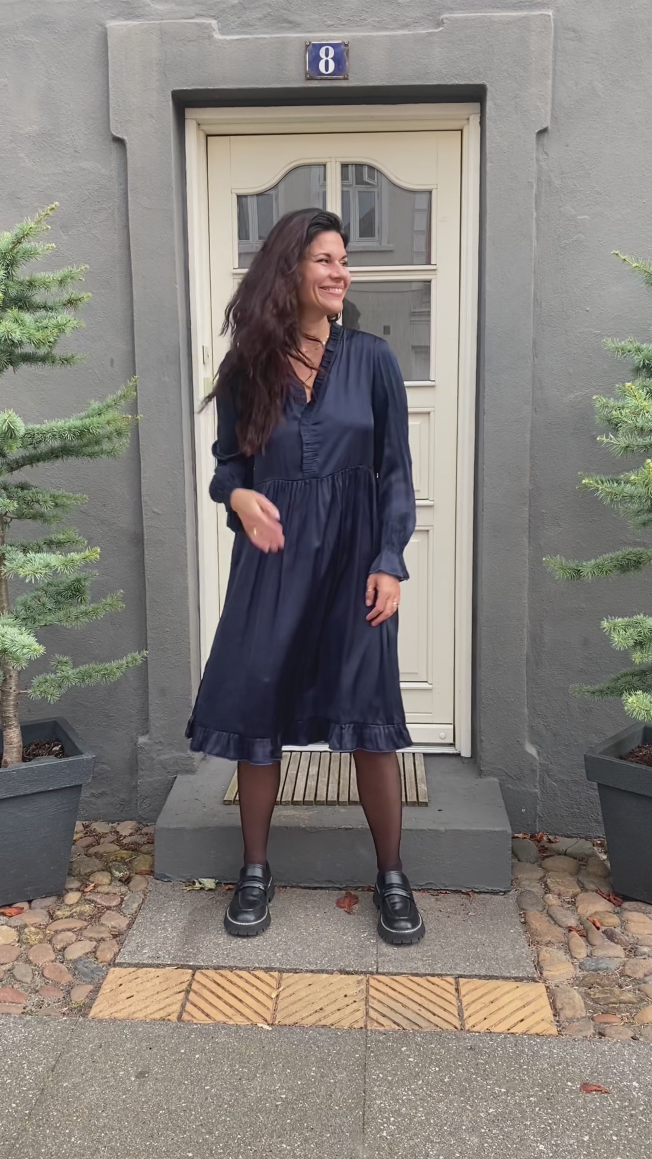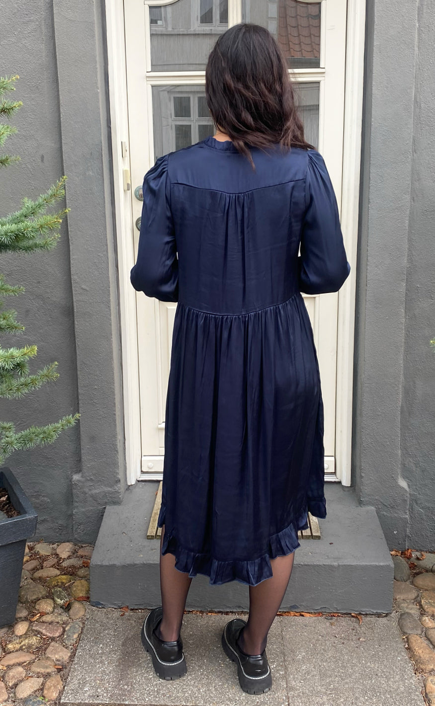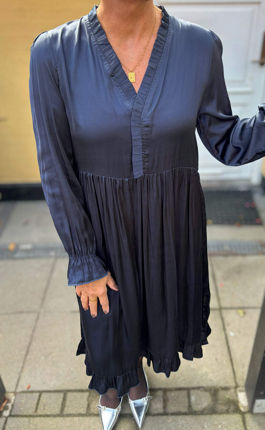 Smuk kjole fra INA Copenhagen i navy blue satin med så mange fine detaljer.