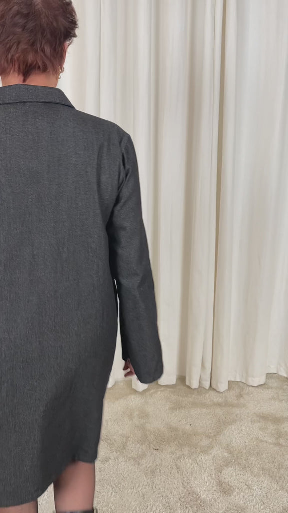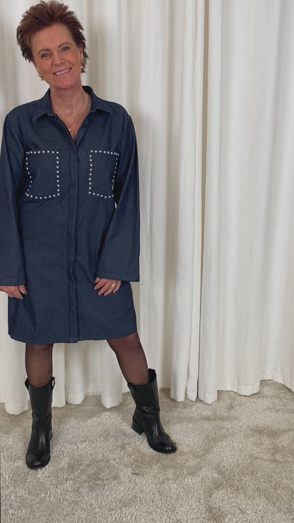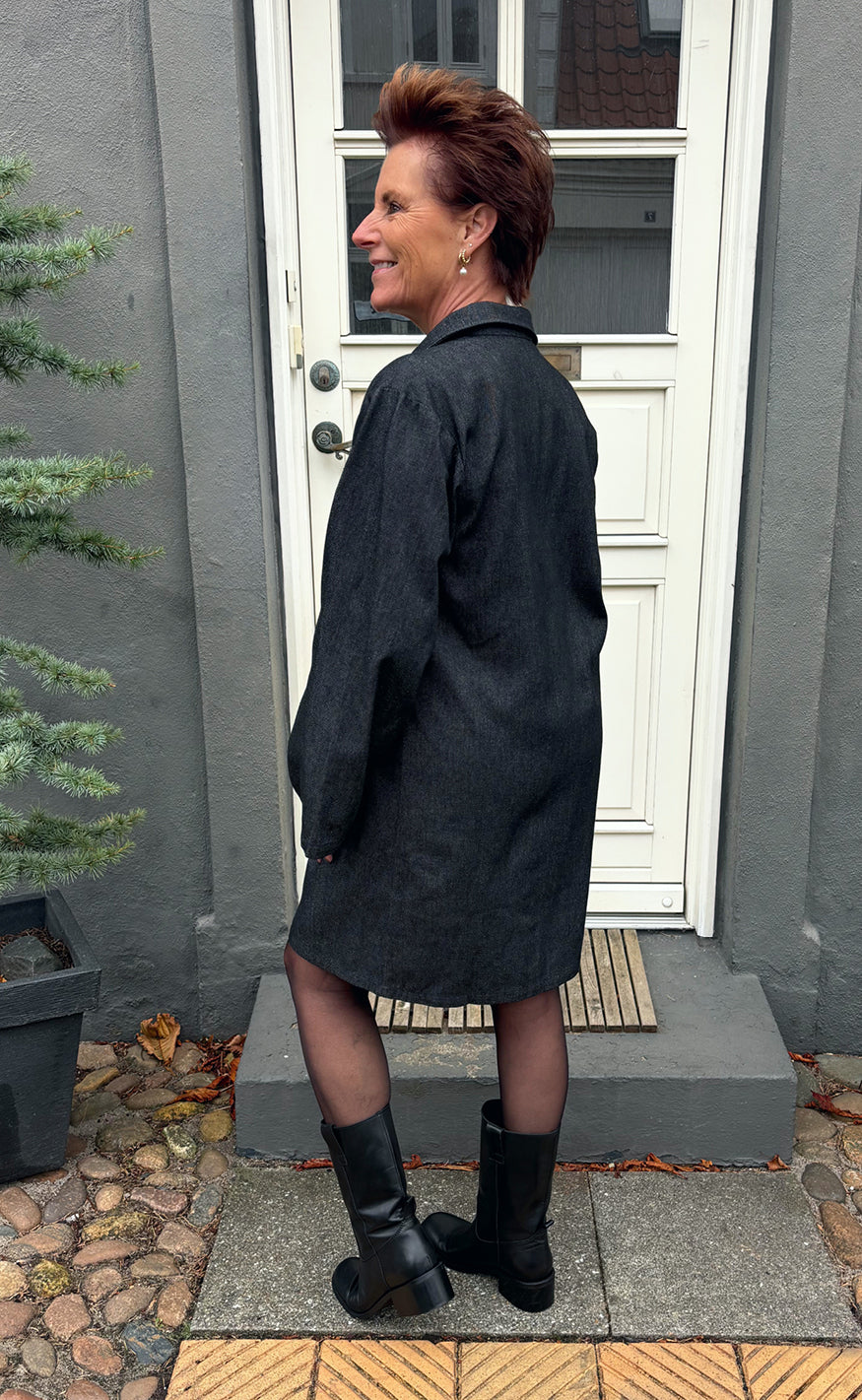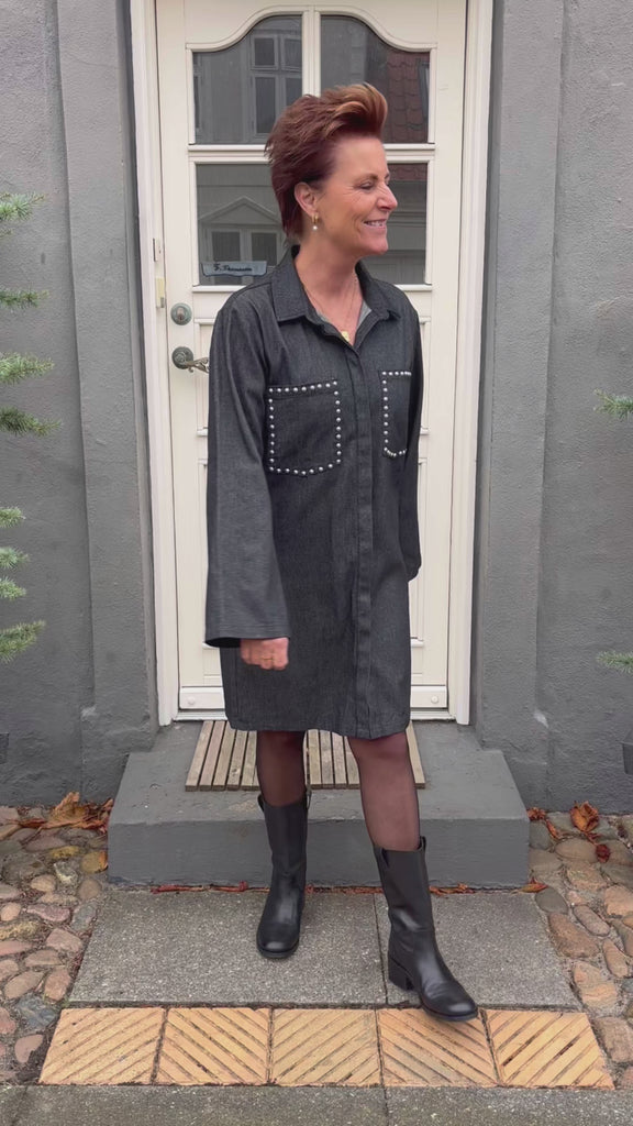 Smart denim kjole fra Say INA Copenhagen i gråsort med sølv nitter ved lommerne.